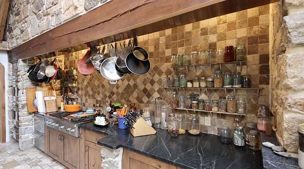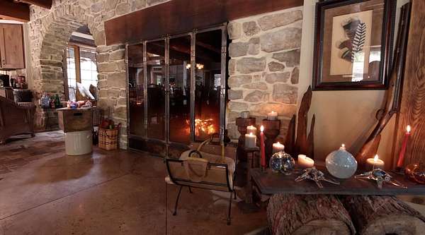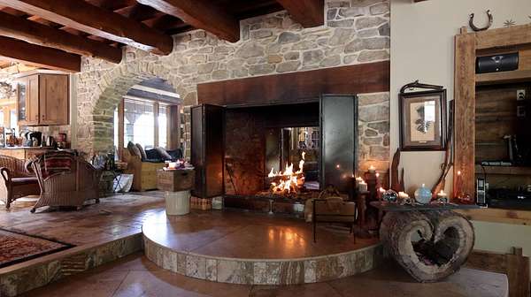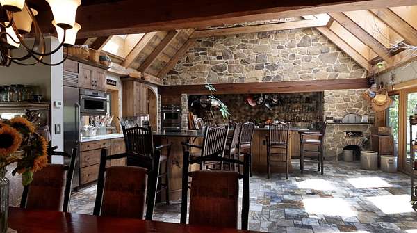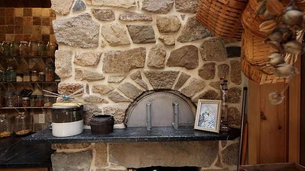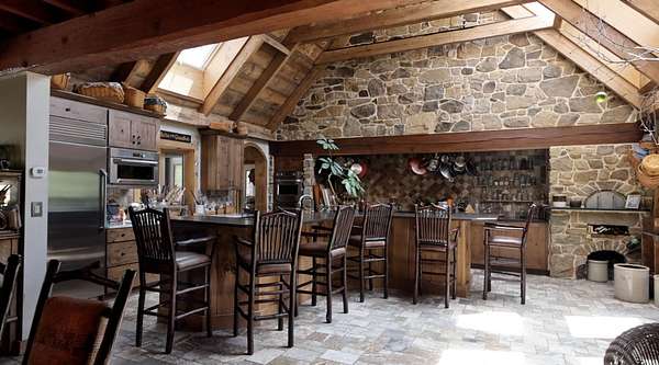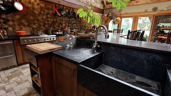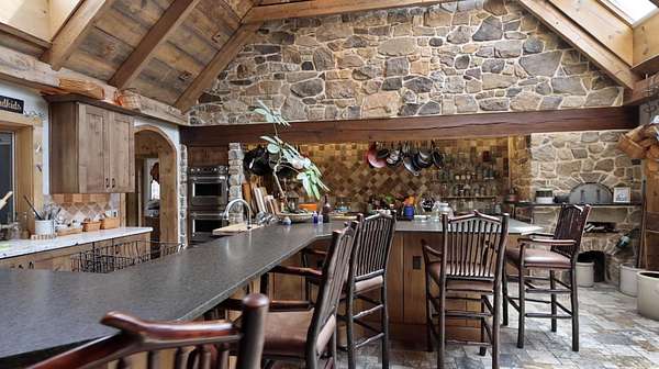 - Kitchen has GE professional appliances, custom stone work, wood fired pizza oven, granite and soap stone countertops and grease trap exhaust.