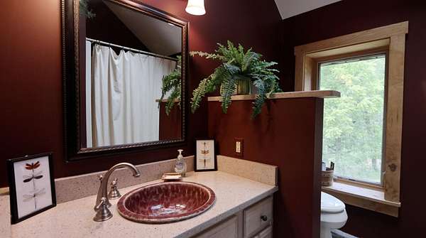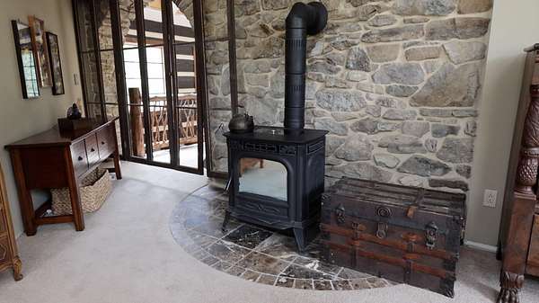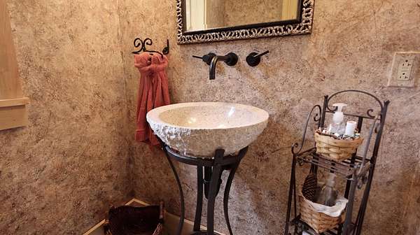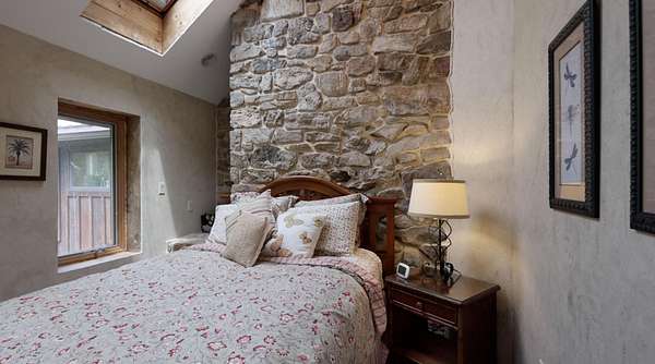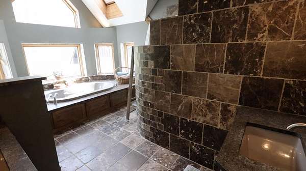 - Large Master bedroom with vaulted ceilings, skylights and a deck with gorgeous views of the mountains. The bedroom includes a wood pellet stove and a walk-in closet with washer and dryer. The Master bathroom suite has custom stone work, alder wood custom cabinetry, his and her sinks, built in hot tub with views of the land and a shower for 2 with 8 shower heads!