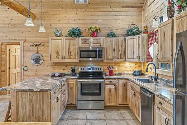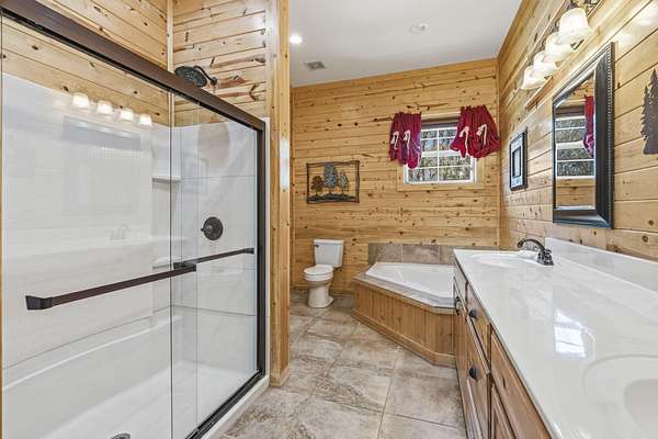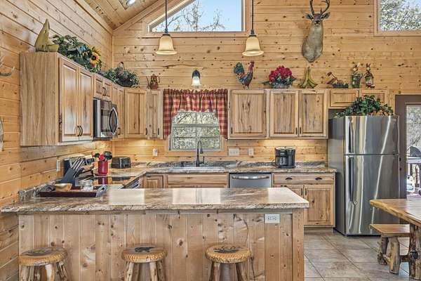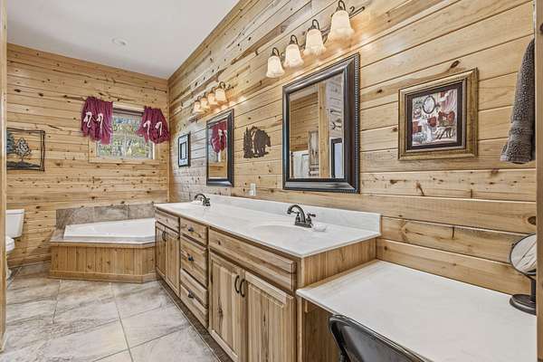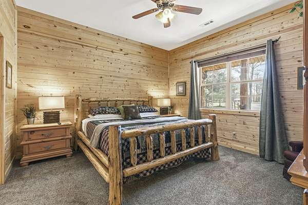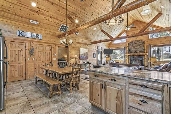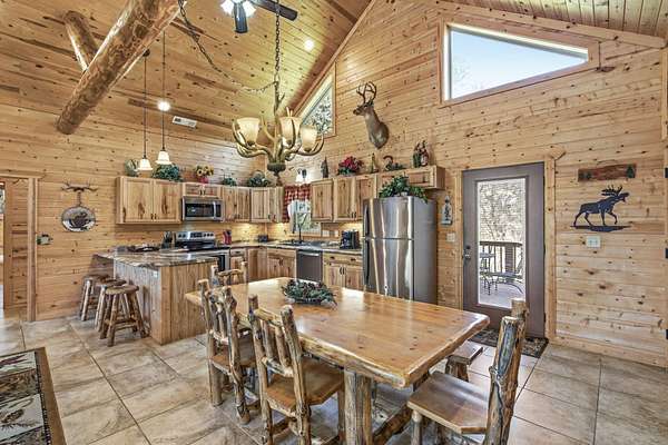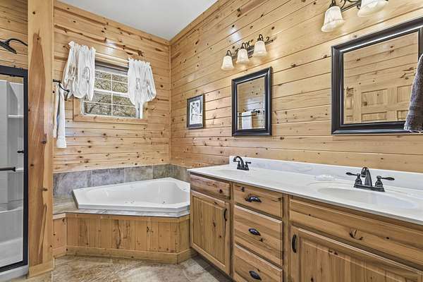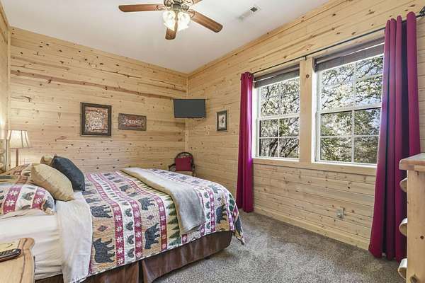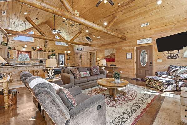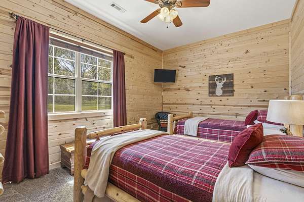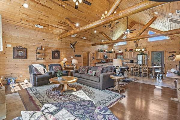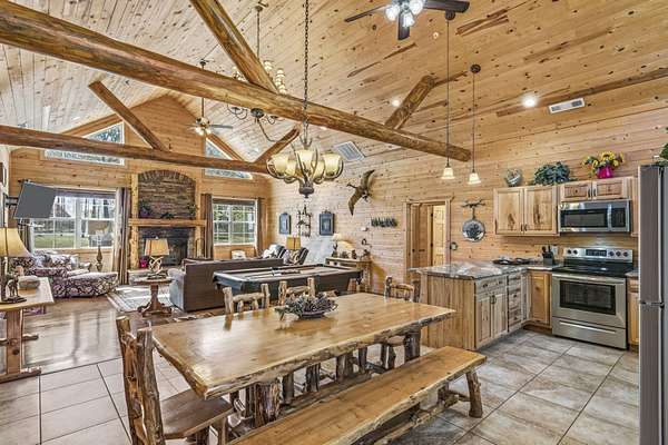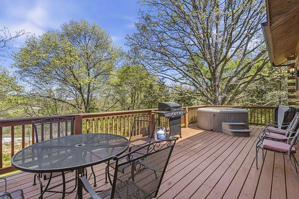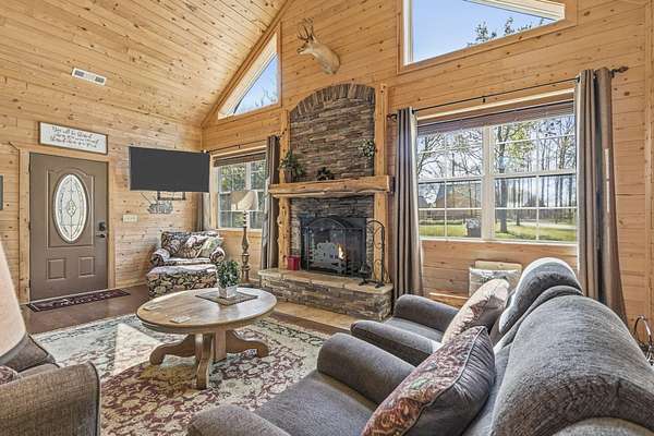 Not one but two cabins in the woods. The Cabins are Vacation Rental properties, located very close to the Big Cedar Amphitheater. Hiking distance to the event or enjoy the music from the comfort of your deck.The main house has three bedrooms. The guest house has two. These Cabins embrace the Big Cedar 'Vibe' inside and out. Luxury and relaxed comfort. The main house has a pool table and a hot tub for your enjoyment or just take a nap. After all, you're on vacation. Vaulted ceiling and wonderful windows make these properties shine.