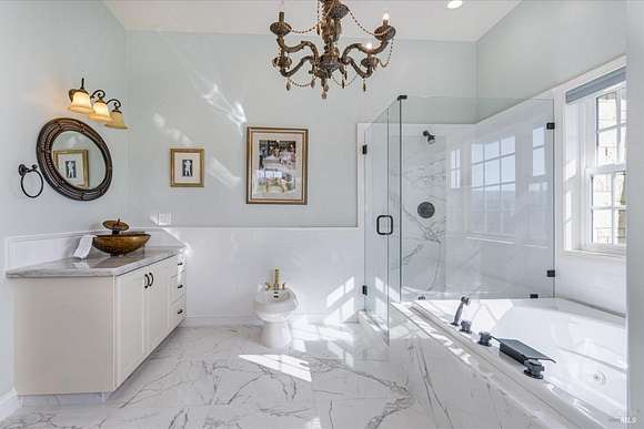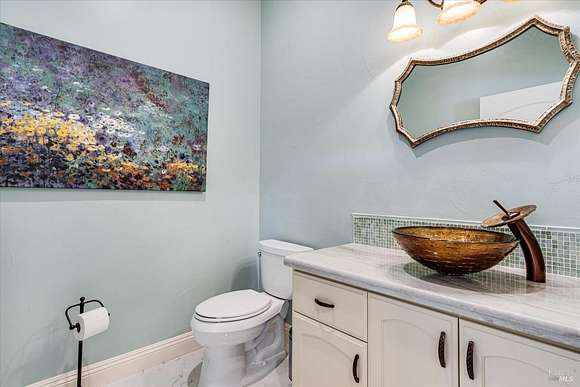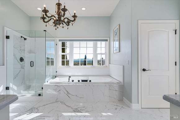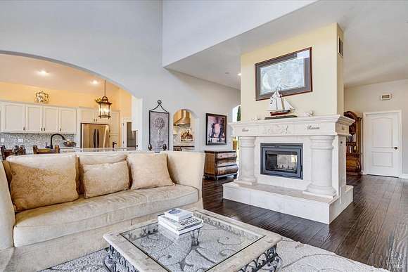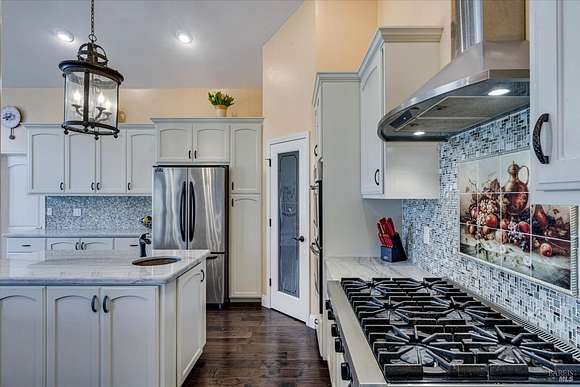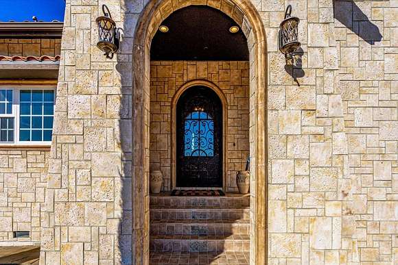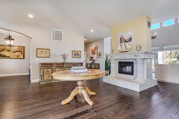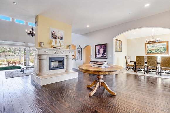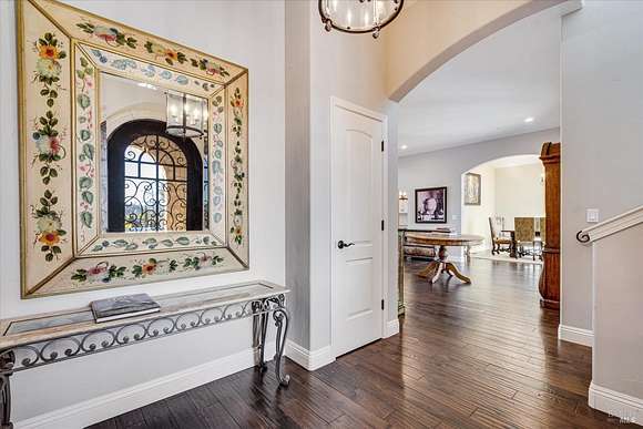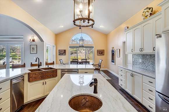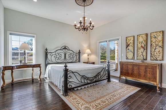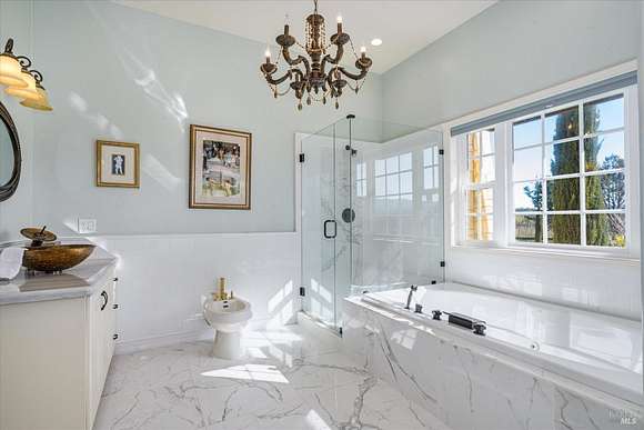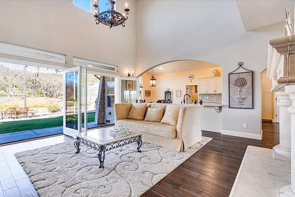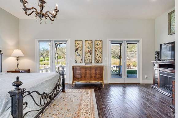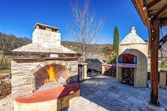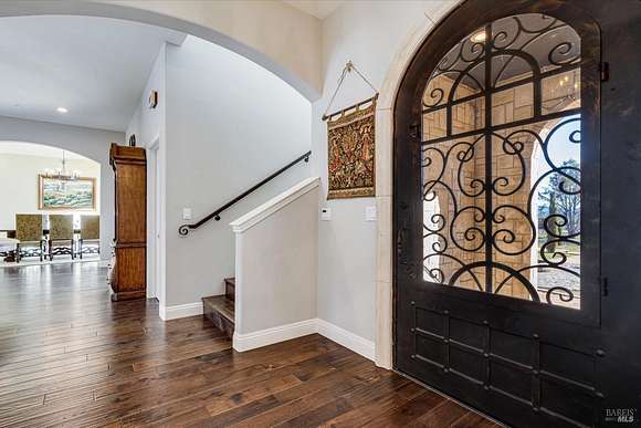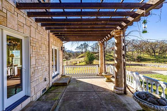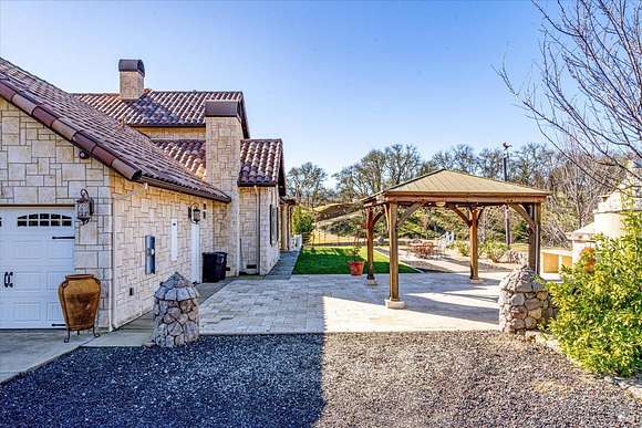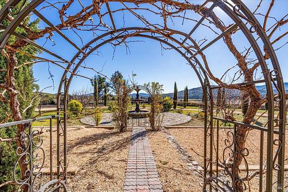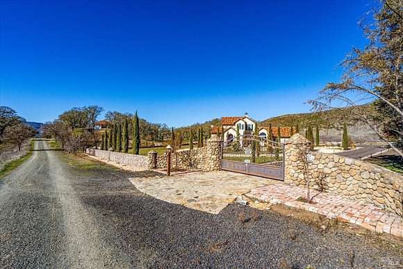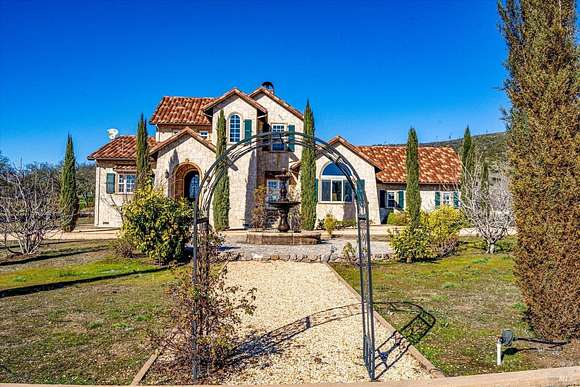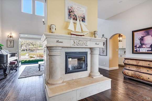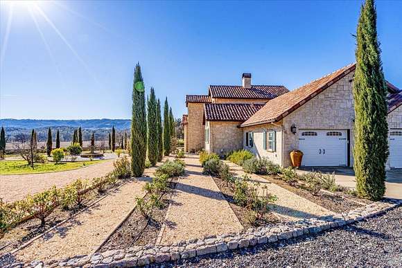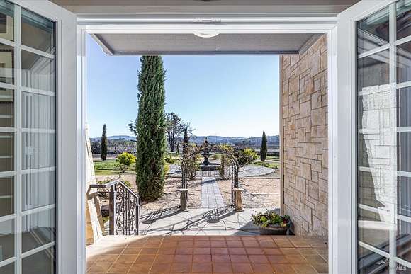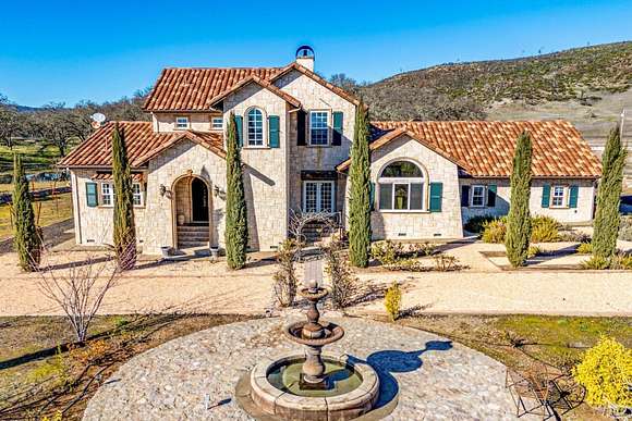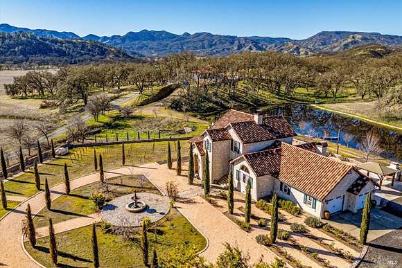 Beautifully sited on 26+ acres of rolling countryside, this magnificent Italian stone villa is a masterpiece of timeless design and artisan craftsmanship. This estate is thoughtfully oriented to showcase panoramic views of the surrounding mountains & vineyards. The property offers the ultimate retreat for those seeking an idyllic lifestyle of tranquility. A dramatic 20+ foot entry with wrought-iron door, hardwood floors, an Italian-inspired double fireplace, & a formal dining room. The main floor primary suite features a sumptuous bath, dual walk-in closets, & enchanting pond views with access to the patio. The chef's kitchen has the finest appliances, quartz countertops, dual copper sinks, a wine refrigerator, a walk-in pantry, & the family room opens to the expansive patio with an arbor, a wood-fired pizza oven, an outdoor fireplace, & picturesque pond views - a seamless extension of the home's thoughtful design. The estate grounds evoke the charm of the Italian countryside, with cascading fountains, beautiful stone walls, and an Italian garden entry. A bocce court, fruit trees, and grapevines add to the property's allure. There is ample room for a tennis court, swimming pool, car barn, or equestrian facilities, making this estate as versatile as it is stunning.