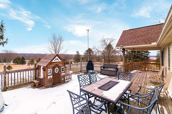 Discover the perfect blend of comfort, space, and self-sufficiency in this charming Cape Cod-style single-family home set on 5 peaceful acres. With 3 bedrooms and the potential for a 4th, plus 2 1/2 bathrooms, this property offers flexibility to grow, host, or simply spread out and enjoy the serenity of country living. From the moment you arrive, the inviting front porch sets the tone - a quiet place for morning coffee or unwinding at sunset. Inside, you'll find partially updated flooring, a warm stone gas log fireplace with gold plated insert, and a thoughtfully designed layout that balances cozy charm with generous living space. The heart of the home features a spacious kitchen with ample storage, flowing seamlessly into areas designed for gathering and entertaining. A large laundry/mudroom provides everyday practicality, while the partially finished basement with walk-up access offers additional living space and storage. The primary suite is a true retreat, complete with a whirlpool tub and private access to the expansive rear deck, perfect for stepping out to enjoy peaceful views of your property. A cozy, cedar lined 3-season room extends your living space even further, ideal for enjoying the outdoors in comfort across much of the year. Step outside to a partially fenced backyard and an expansive deck overlooking open acreage - a perfect setting for entertaining, gardening, recreation, watching the abundant wildlife, or simply enjoying the open space. With solar panels and battery backup, you'll also appreciate added energy efficiency and peace of mind. If you've been dreaming of room to breathe, space to entertain, and the quiet charm of country living, this property delivers it all.
