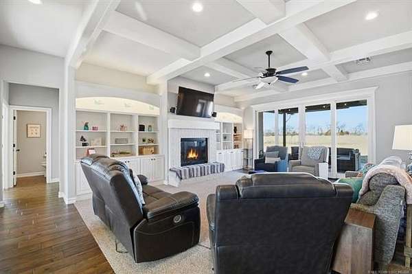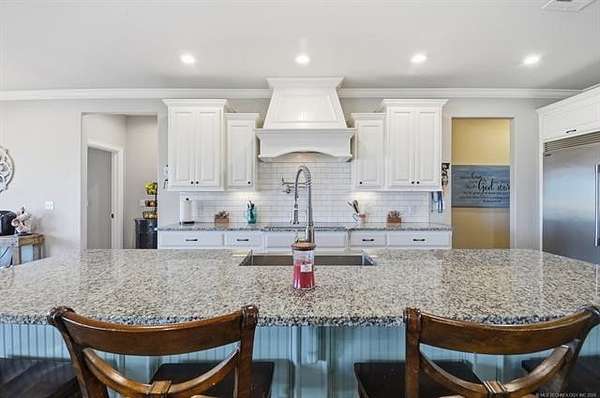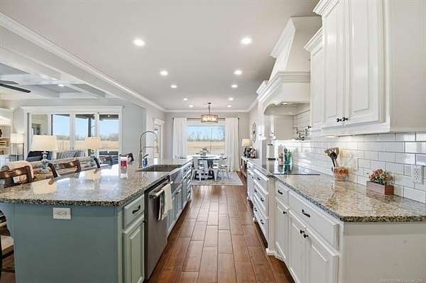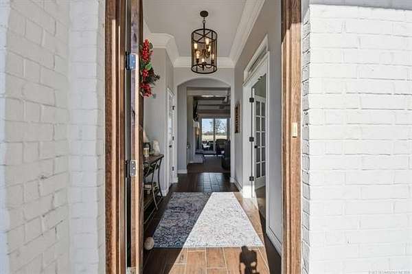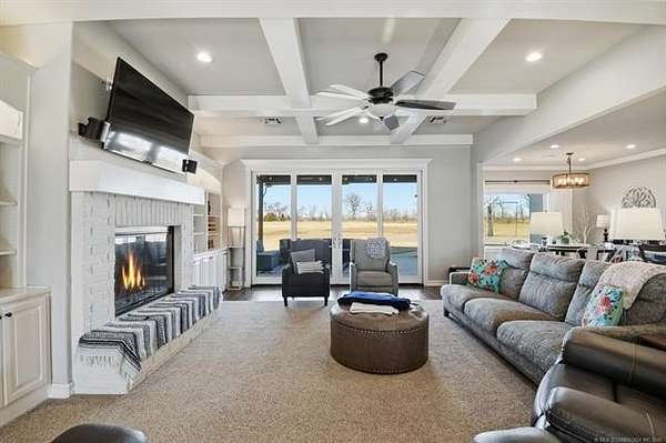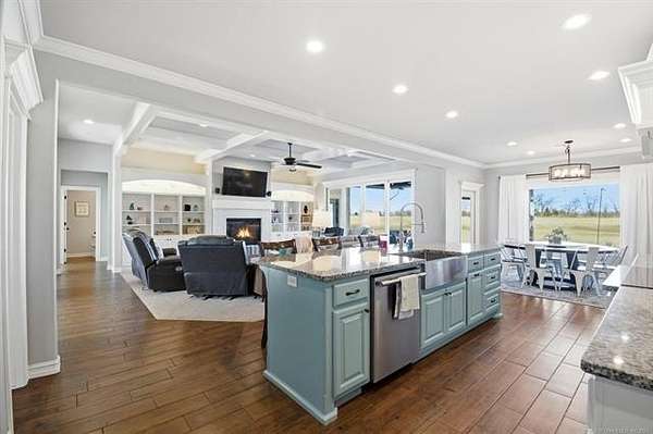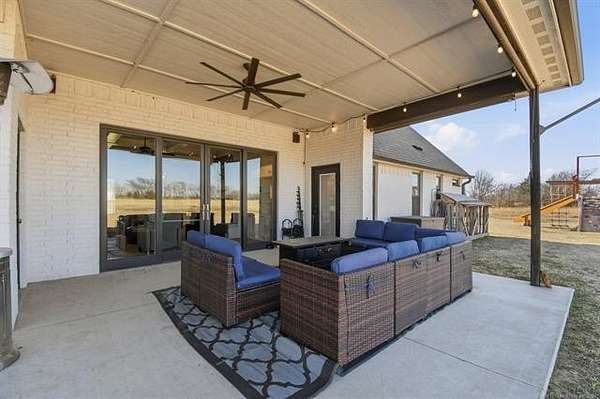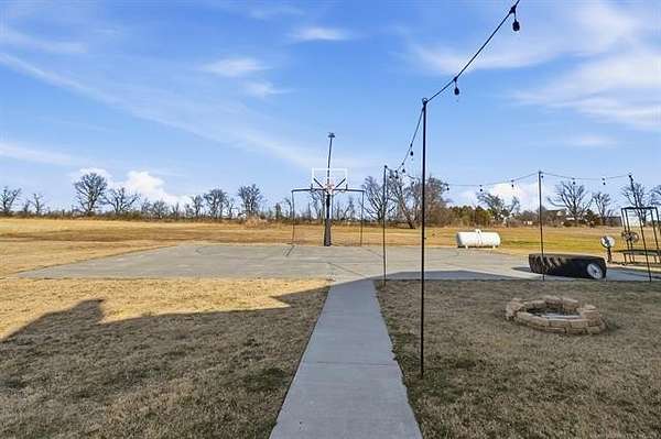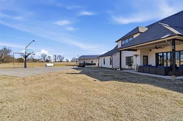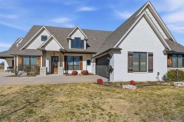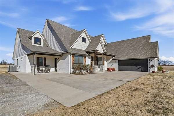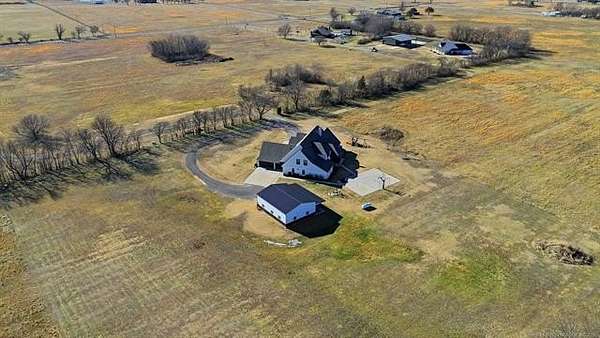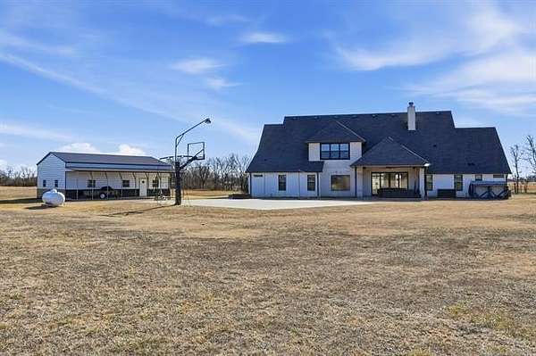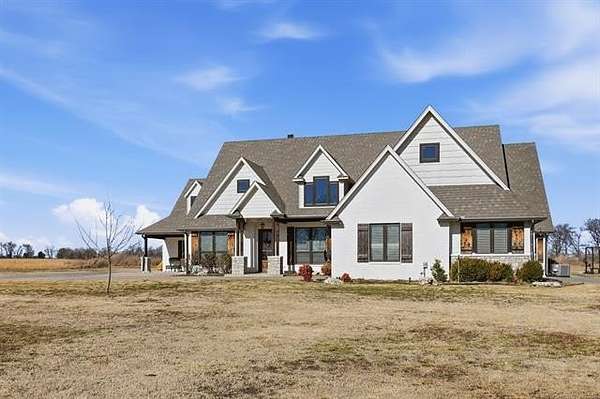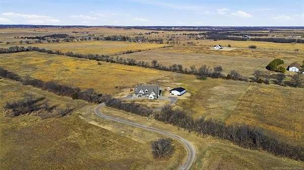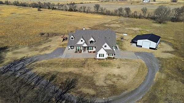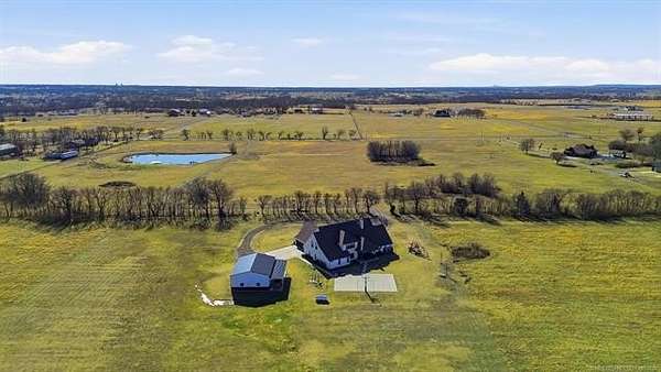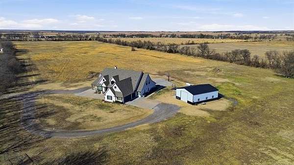 The best of all worlds on just under 5 acres. Stunning custom build that's a little bit country and a little bit rock and roll with convenient highway access to 75 and 169. The elongated drive lends itself to privacy behind the tree row. This invitingly warm country home features five bedrooms downstairs, or four bedrooms and a dedicated office. Off the entry sits a formal living area or sitting area for reading or enjoying some good conversation. The cozy living room has wood burning fire place, coffered ceilings, wood look tile floors, shelving beside the fireplace. A wall of windows with 12-ft sliding doors leads to the outdoor living area. The kitchen boasts of double ovens, Frigidaire professional fridge and freezer, induction cook top, double convection ovens, island with seating for 6 and a spacious eating area flanked by windows for a view of rolling pastures and the occasional deer. There is an indoor 10-person storm shelter for added peace of mind. The private primary suite is tucked away on the opposite side of the home with a private door. Primary bath has double vanities, 2-person shower, and soaking tub. The primary closet has seasonal storage with the laundry room conveniently located right off the closet. Upstairs is a spacious game room and an additional bedroom with private bathroom. For movie nights, there is a wet bar with mini fridge upstairs for snackage. Don't miss two HUGE walkout storage areas off game room for holiday items. There is an expansion area above the garage just waiting to be built out for a theater room or another bedroom for guests. For the hobby enthusiast there is a 30X40 tubular steel shop with a 10X40 lean to on a concrete pad. A full 30X50 basketball court for the athletes in the family with light and net for night time fun. If an RV is your thing, there is a 50 amp outlet in garage. For energy efficiency, there are 3 electric heat pumps units (one 5- ton and two 3-ton) and 75 gallon water heater. What. A. House.
