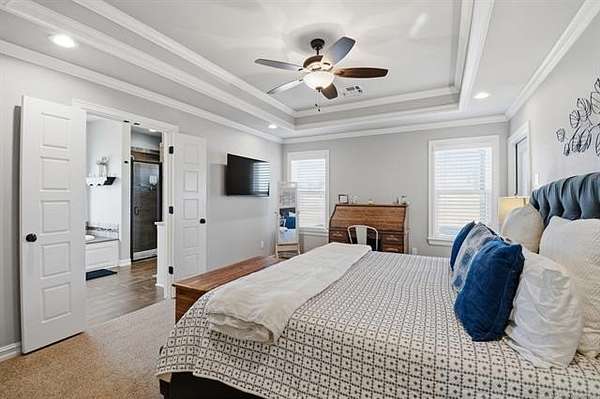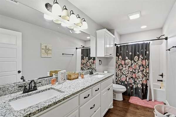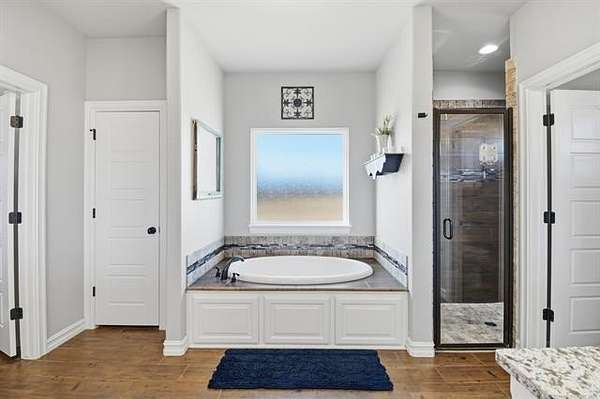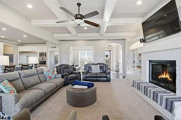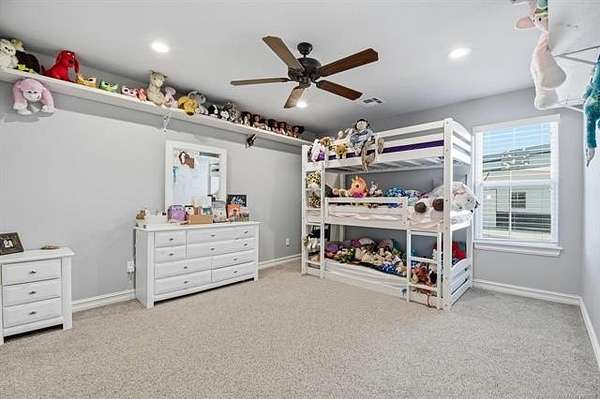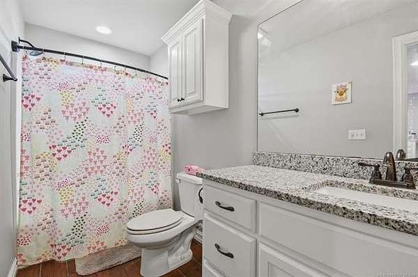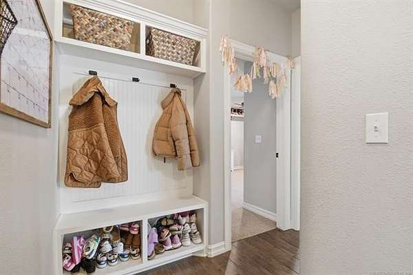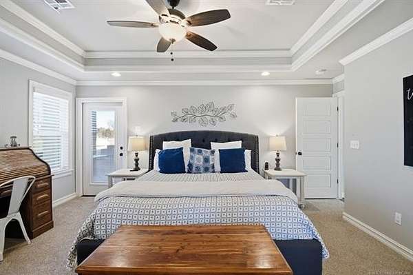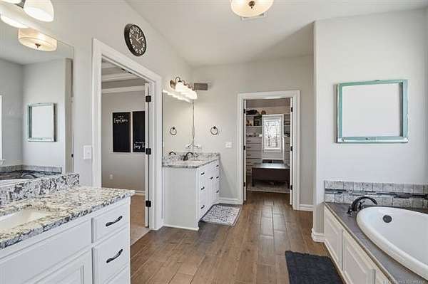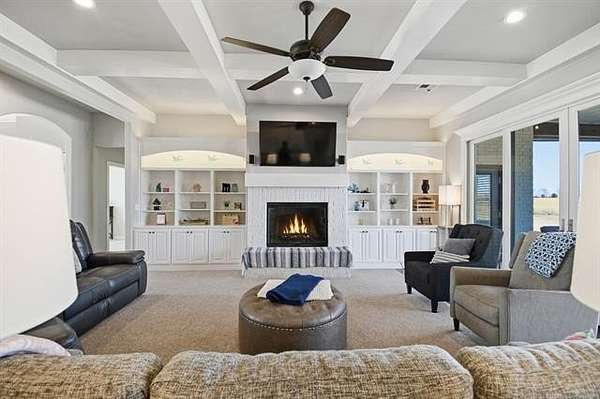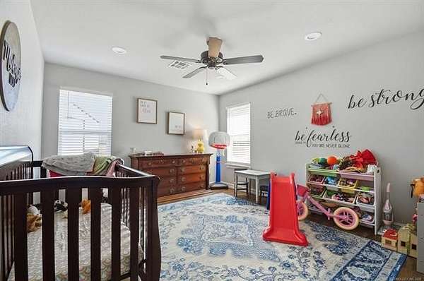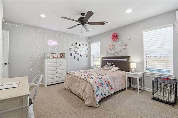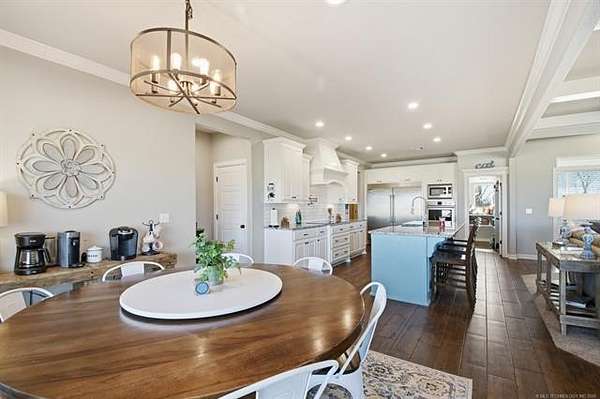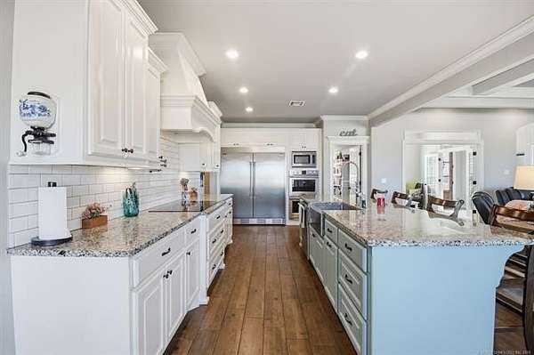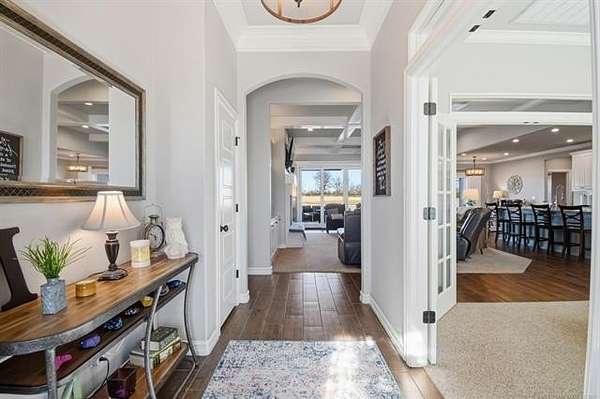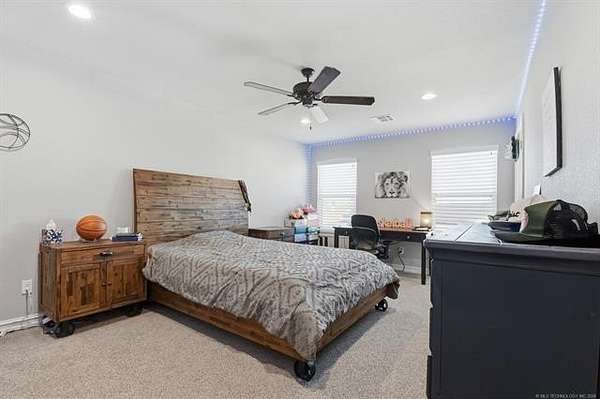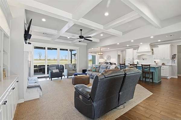 The best of all worlds on just under 5 acres. Stunning custom build that's a little bit country and a little bit rock and roll with convenient highway access to 75 and 169. The elongated drive lends itself to privacy behind the tree row. This invitingly warm country home features five bedrooms downstairs, or four bedrooms and a dedicated office. Off the entry sits a formal living area or sitting area for reading or enjoying some good conversation. The cozy living room has wood burning fire place, coffered ceilings, wood look tile floors, shelving beside the fireplace. A wall of windows with 12-ft sliding doors leads to the outdoor living area. The kitchen boasts of double ovens, Frigidaire professional fridge and freezer, induction cook top, double convection ovens, island with seating for 6 and a spacious eating area flanked by windows for a view of rolling pastures and the occasional deer. There is an indoor 10-person storm shelter for added peace of mind. The private primary suite is tucked away on the opposite side of the home with a private door. Primary bath has double vanities, 2-person shower, and soaking tub. The primary closet has seasonal storage with the laundry room conveniently located right off the closet. Upstairs is a spacious game room and an additional bedroom with private bathroom. For movie nights, there is a wet bar with mini fridge upstairs for snackage. Don't miss two HUGE walkout storage areas off game room for holiday items. There is an expansion area above the garage just waiting to be built out for a theater room or another bedroom for guests. For the hobby enthusiast there is a 30X40 tubular steel shop with a 10X40 lean to on a concrete pad. A full 30X50 basketball court for the athletes in the family with light and net for night time fun. If an RV is your thing, there is a 50 amp outlet in garage. For energy efficiency, there are 3 electric heat pumps units (one 5- ton and two 3-ton) and 75 gallon water heater. What. A. House.