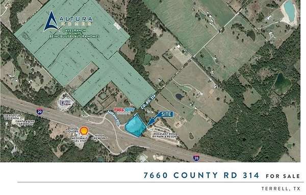 Est $10,598/moFor Sale 6.21 AC TERRELL, TX *Size: 6.206 acres *Zoning: No Zoning - Vacant Land - Proposed Commercial *Utilities: 12in water line along I-20 along the front of the property as well as a 3in line running North on CR 314 (to be improved to a 6in line once the Altura Homes (138 homes) residential development is completed) - College Mound WSC PUD & CCN *Fantastic visibility along I-20 with quick highway access *Adjacent corner to a proposed Fuel City and diagonally opposite to Shell Fuel Stop *Over 2,000 multifamily units under development on I-20 in Terrell Limited Info- Please reach out for additional information (ALTA Survey, Geotech, Phase 1 Environmental, & more)
