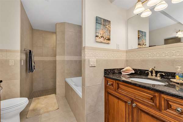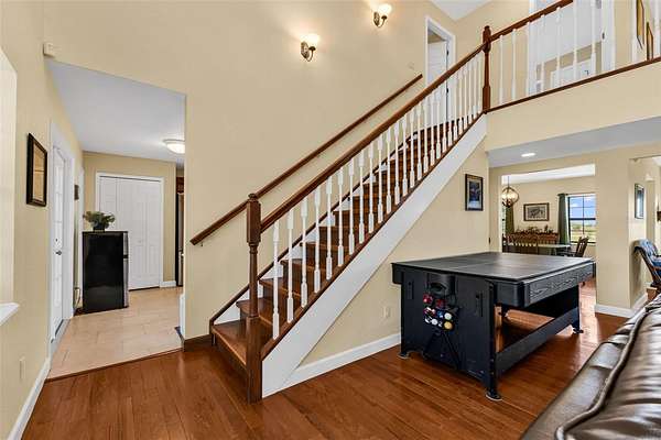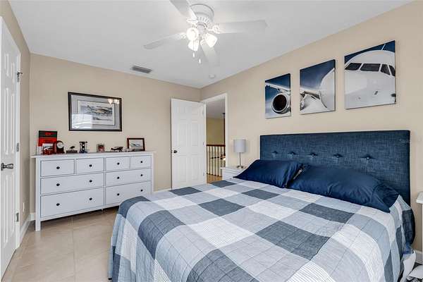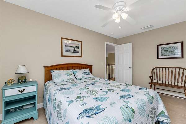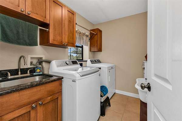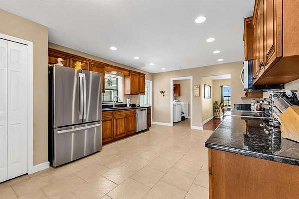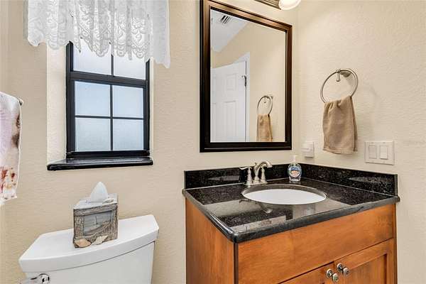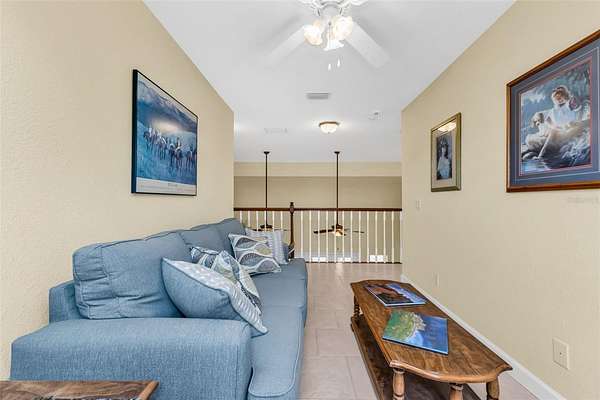 The interior is bright and open, with soaring ceilings, abundant windows, and a functional layout. The kitchen features granite countertops, high-end wood cabinetry with soft-close drawers, new stainless refrigerator and other modern stainless appliances and the range has a convection oven. A window overlooking the countryside. A nearby half bath with a granite-topped wood vanity is ideal for guests or future pool use. The main-level master suite opens to the large screened, north-facing lanai and includes a walk-in closet and a spacious bath with separate granite vanities, a doorless Roman shower, and an Aqua-Glass jetted tub. Upstairs offers two bedrooms, each with dual closets, a full bath, and a separate flexible sitting or media area. There is also a large room that can be used as a game, media or storage room. A main-level office with a closet can easily serve as a fourth bedroom. The home also includes a full laundry room with sink, cabinetry, and abundant storage throughout.
