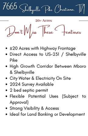 Prime 20+- acre opportunity with substantial frontage along highly traveled Shelbyville Pike (US-231) in the growing corridor between Murfreesboro and Shelbyville. Excellent visibility and access make this an ideal land investment with long-term upside. City water and electricity on site. A 2-bedroom septic permit is on file. Ideal for investors, developers, or buyers looking to secure land in a high-growth area. A survey was completed in 2024. Preliminary meetings have been completed with Rutherford County and TDOT regarding potential future development and ingress/egress planning. Property features a mix of open and wooded terrain with rolling topography and existing access off the highway. The property benefits from substantial highway frontage, strong visibility, and direct access in a corridor experiencing continued residential, industrial, and commercial expansion. Do not enter the house it is not safe.