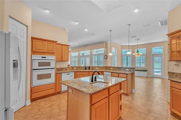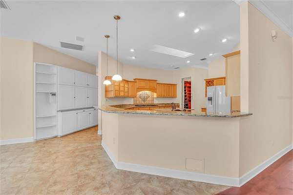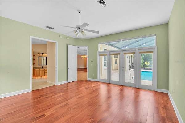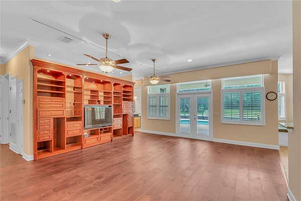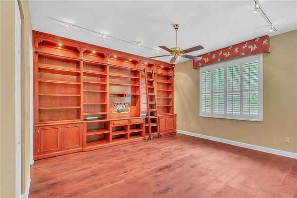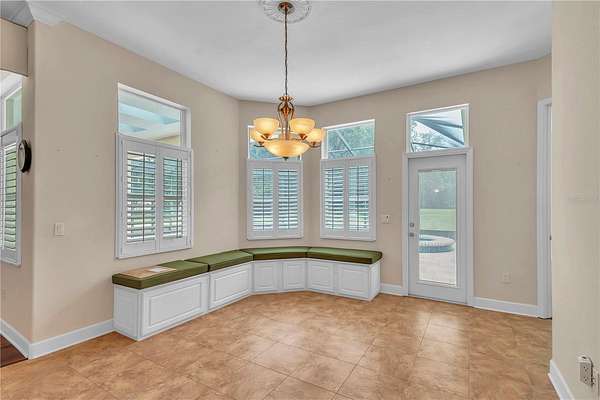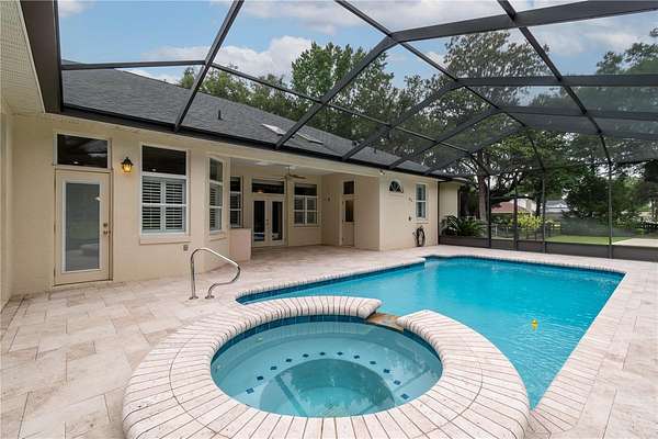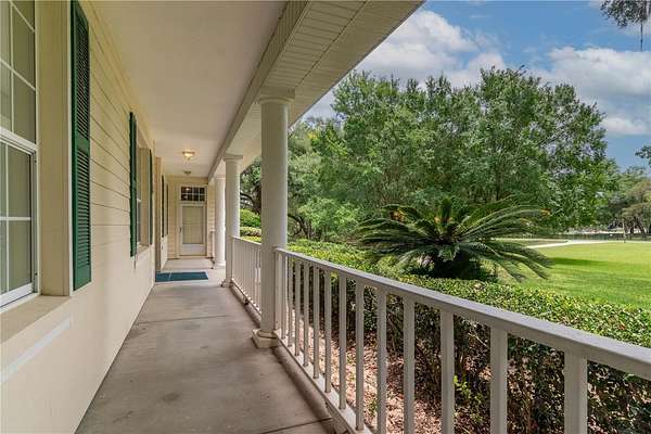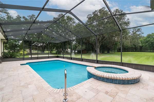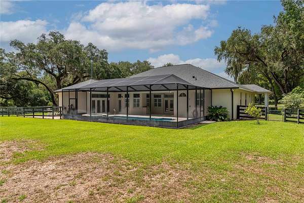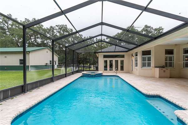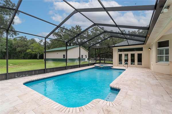 Discover an exceptional blend of luxury, privacy, and functionality on 4.20 acres in the sought-after, gated community of Alamar Village. This meticulously designed 5-bedroom, 4-bath estate spans 3,498 square feet and offers a flexible split-bedroom layout ideal for both everyday living and elegant entertaining. Set back from the road, mature landscaping and grand oak trees set the tone for this peaceful retreat. Inside, engineered wood flooring extends throughout the main living areas, with tile in the kitchen and baths. The heart of the home is the central living room which features a custom built-in entertainment center and French doors opening to the expansive pool area. The oversized kitchen is designed for those who enjoy cooking, featuring a center island, gas range, breakfast bar, wine rack, generous cabinet storage, and a walk-in pantry. A cozy breakfast nook with built-in bench seating overlooks the pool, while the formal dining room off the foyer and kitchen adds a touch of sophistication for hosting. A versatile library with extensive built-in shelving, a walk-in closet, and private full bath offers the perfect space for a home office, guest suite, or quiet reading room. The primary suite is a private haven with dual walk-in closets and an ensuite bathroom featuring dual vanities with under-lighting and a large walk-in shower. The lifestyle continues outdoors with a resort-style saltwater pool and spa surrounded by travertine decking and enclosed with a new screen cage. Enjoy shaded relaxation under a covered area with ceiling fan, an ideal for gatherings or quiet evenings that even includes an outdoor sink for added ease. Beyond the pool, the backyard is fenced with no-climb and board fencing and includes a separate patio area. Additional highlights include a utility hallway with extensive built-in storage, laundry area, and an extra refrigerator; a side-entry attached garage; and a multi-functional Morton building offering a 12' x 28' insulated room, 4-car garage, patio, and RV stall with electric hookup (According to the HOA, RVs may not be stored outside). Set in a tranquil, equestrian-friendly setting near Ocala's Florida Horse Park and the Cross Florida Greenway's expansive trail systems, this property offers space, serenity, and sophistication- perfect for those seeking a luxury lifestyle with room to live and breathe!