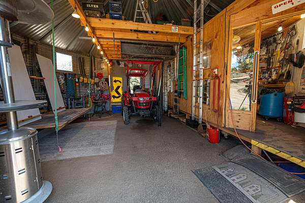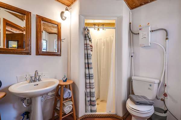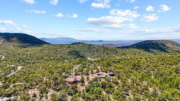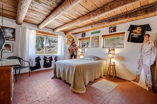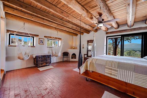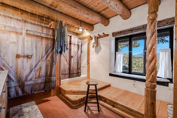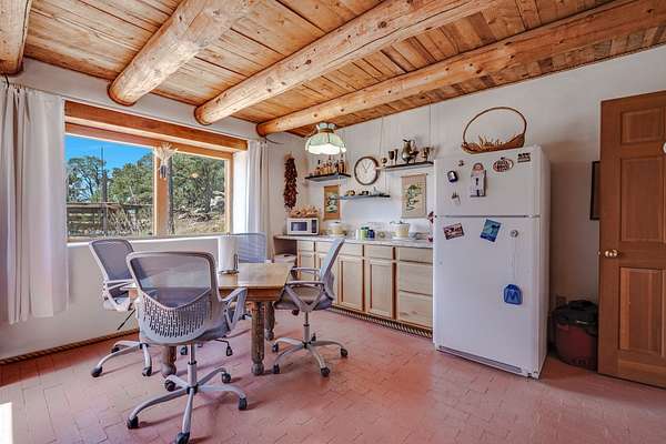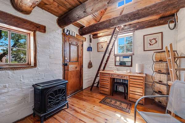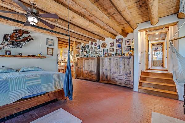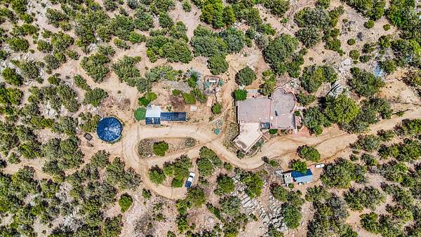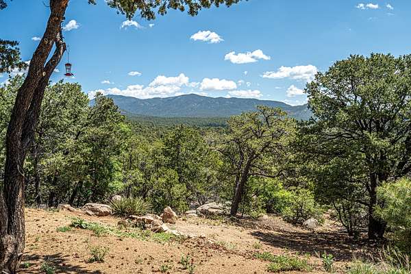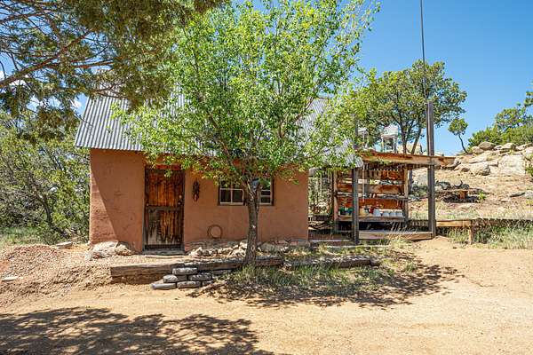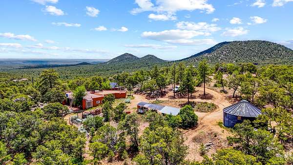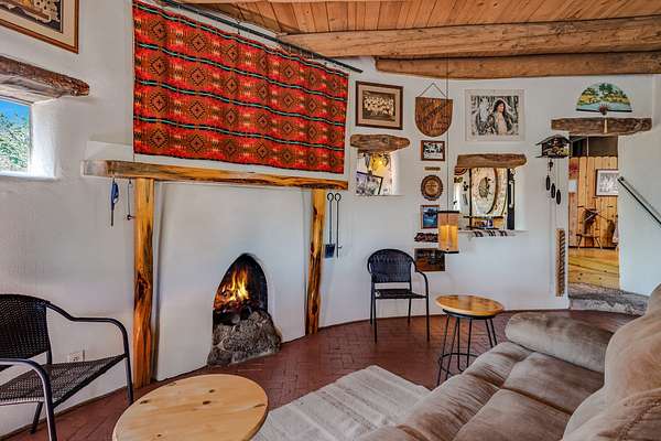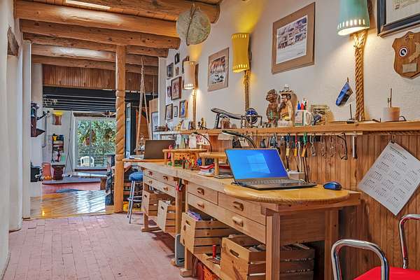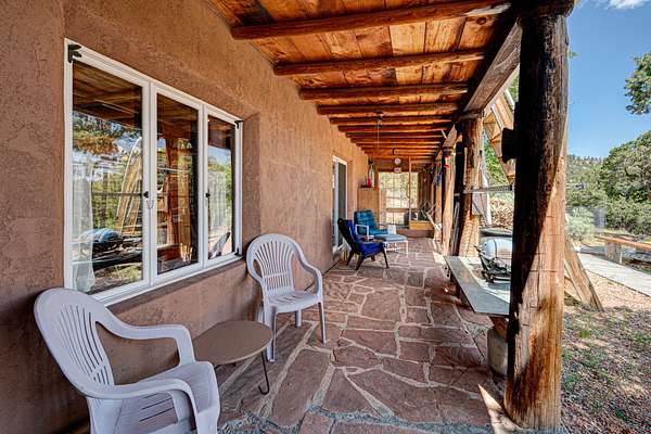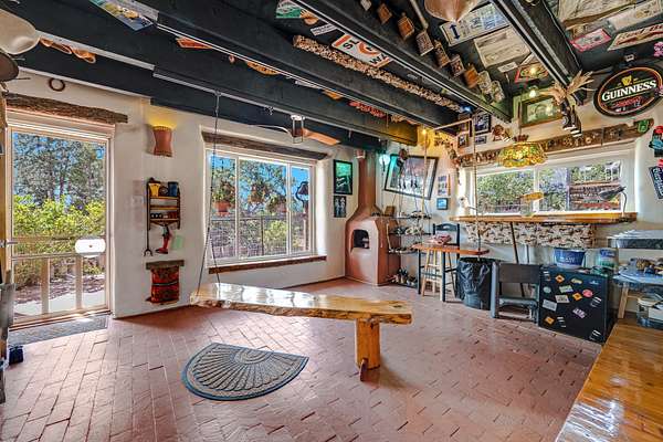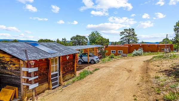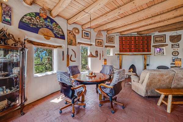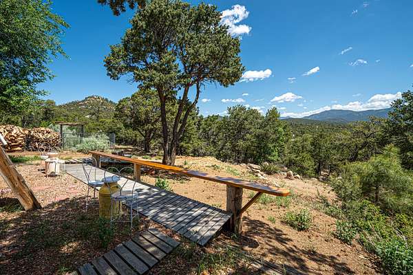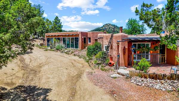 Set on 10 serene acres on the Old Santa Fe Trail and with striking mountain views, this unique 2-bedroom, 2.5-bath home offers space, versatility, and charm. Thoughtfully designed with high ceilings, custom woodwork, wood-burning fireplaces, and windows to capture the high desert terrain and fill the interiors with natural light, the open-concept living, kitchen, and dining areas create an inviting atmosphere. Additional workspace has been created with a built-ins and the bar/game room is sure to house many a fun night. The layout allows for an easy division into two one-bedroom units, presenting excellent rental income opportunities. Enjoy a peaceful lifestyle with whimsical gardens, a vibrant bar room, and a detached studio perfect for creative pursuits. A workshop with tools and a carport add function and value. The property features a private well, septic system, and can be divided into two 5-acre parcels for added potential. Located near Santa Fe's rail station, shopping at The Agora, and cultural destinations like Santa Fe Plaza only minutes away, this home blends rural tranquility with access to urban amenities-ideal for both full-time living or a flexible investment. **Details as provided by Sellers. See additional information in Broker Remarks and attached documents.