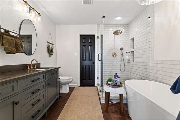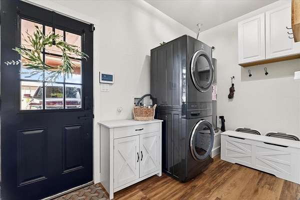 The home is light, bright, and airy with large windows overlooking your peaceful acreage, while warm wood tones and sleek modern details create an inviting, elevated feel throughout. The primary suite features a beautifully updated spa-style bathroom, and the flexible layout includes multiple living spaces ideal for families, hosting, or working from home.