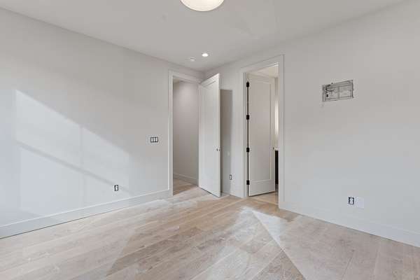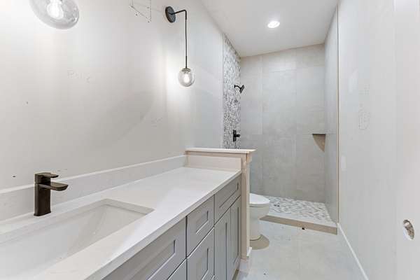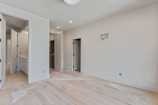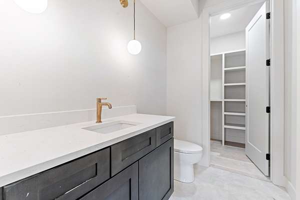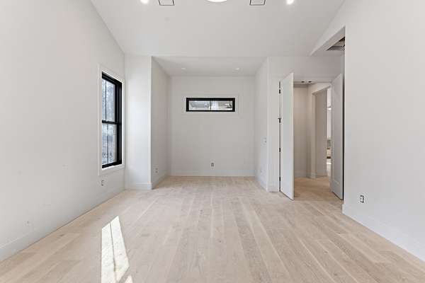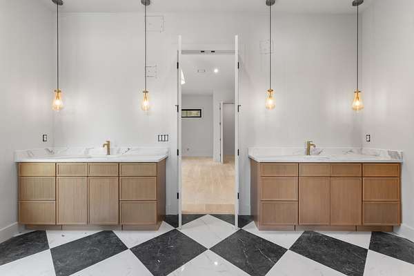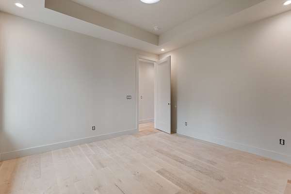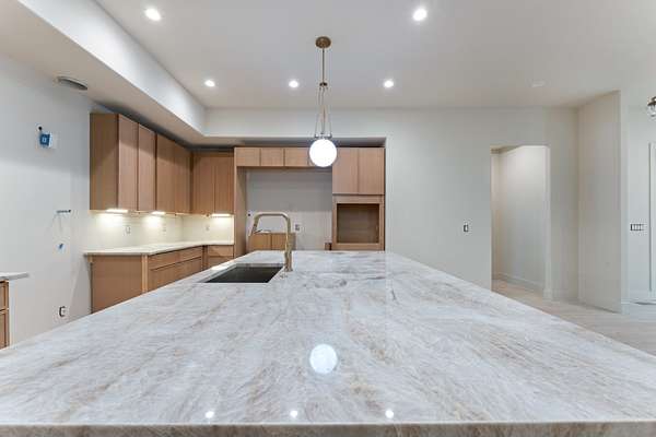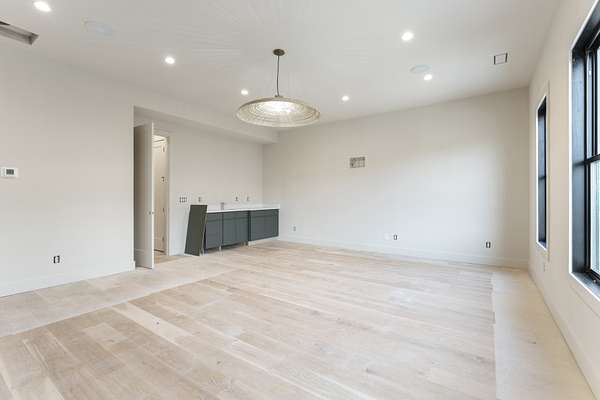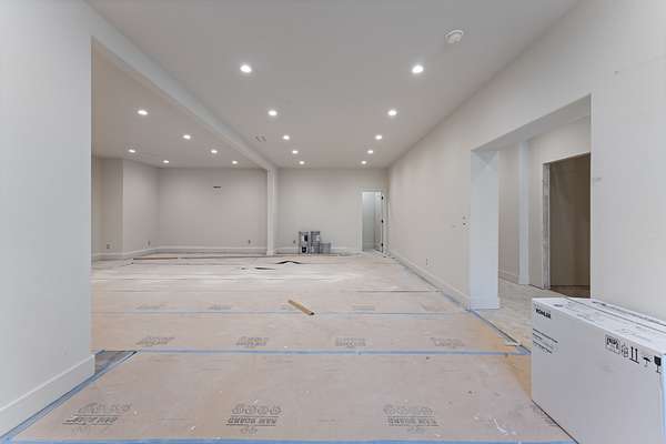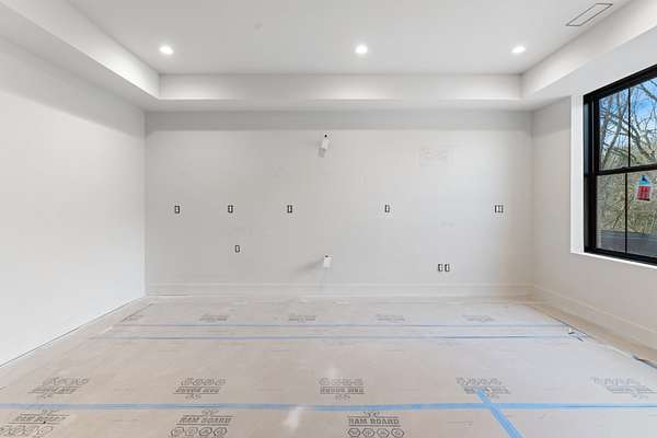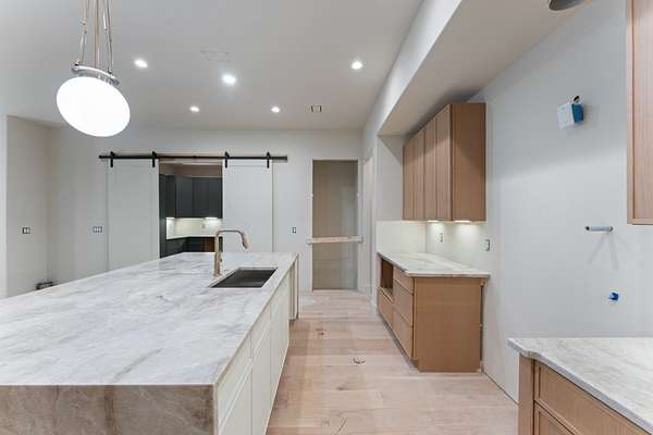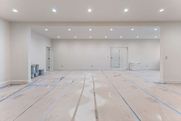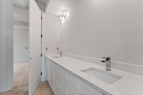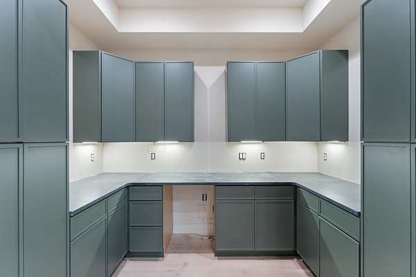 The kitchen features custom cabinetry, a dedicated scullery for additional prep and storage, and is strategically positioned near the elevator for enhanced convenience. Adjacent is the luxurious owner's suite, appointed with vaulted ceilings, a generous sitting area, and a spa-inspired bathroom. The suite showcases French doors, an oversized walk-in shower with an integrated soaking tub, dual vanities, dual toilets, and a fully custom walk-in closet with direct access to the laundry room, which also opens to the main hallway. A family room or movie room and a half bath complete the main level.