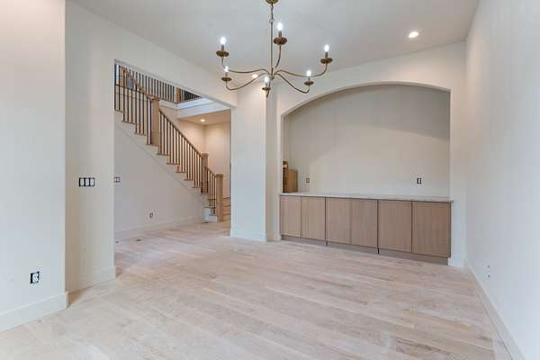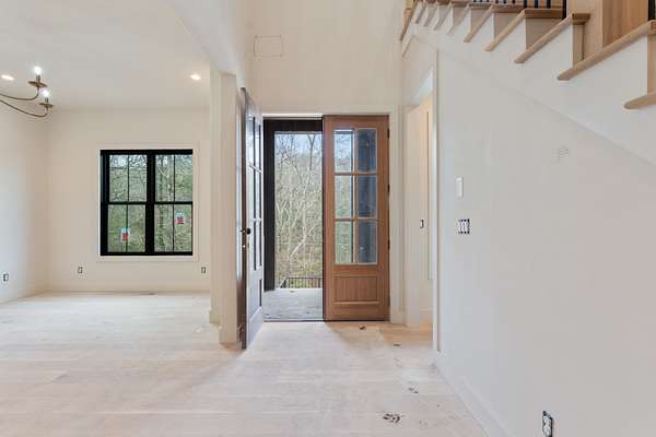 A full covered front porch leads into an impressive foyer defined by soaring ceilings, custom railings, and a sweeping grand staircase. To the left, a dedicated prayer room offers a tranquil retreat; to the right, a formal dining room ideal for elegant entertaining. Beyond the foyer, the main level opens into an expansive living area with seamless access to a substantial covered back porch overlooking the grounds and providing a direct connection to the future pool.