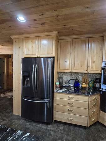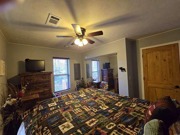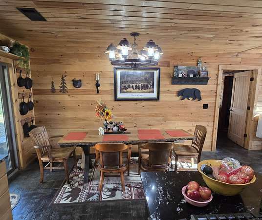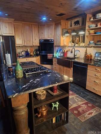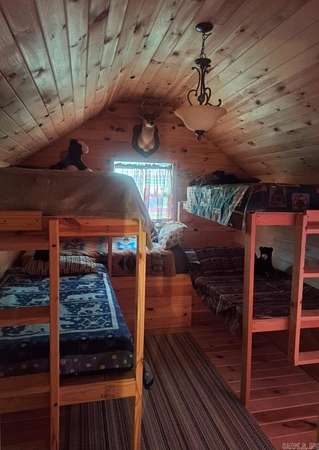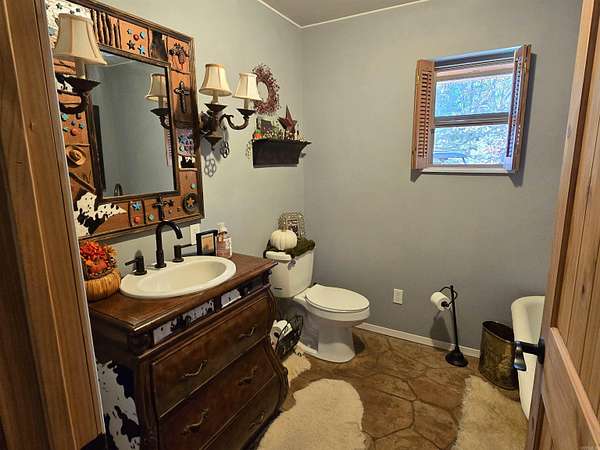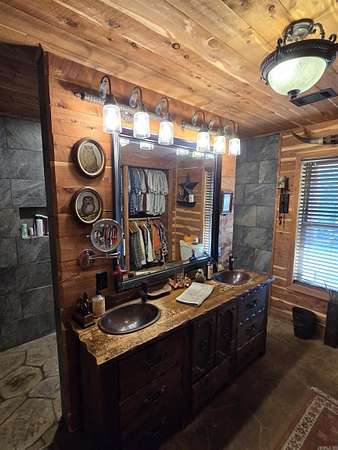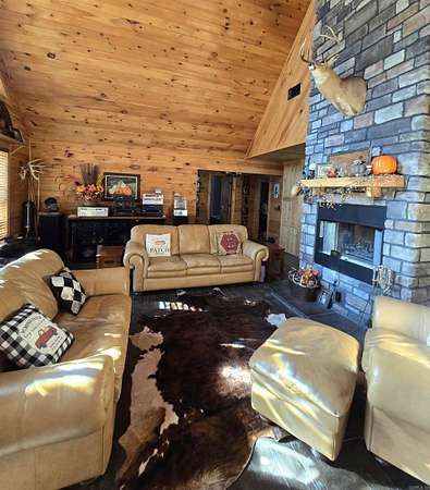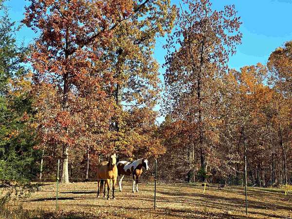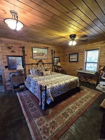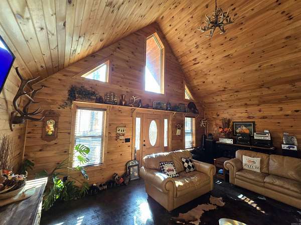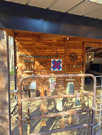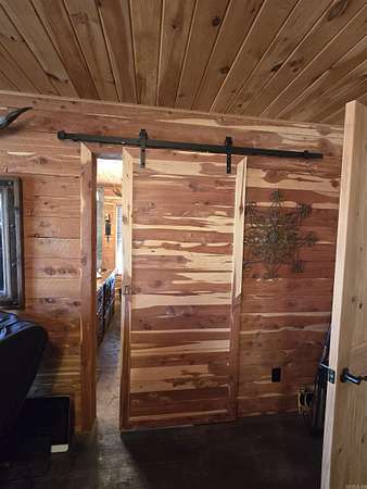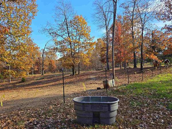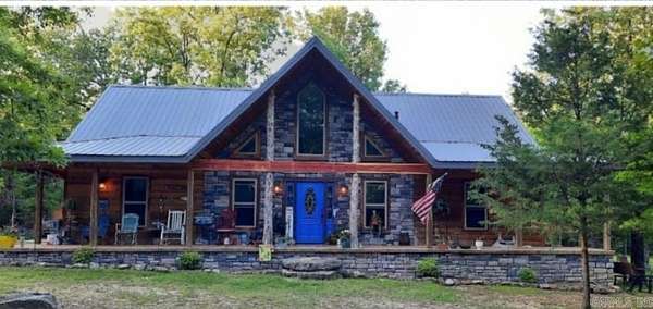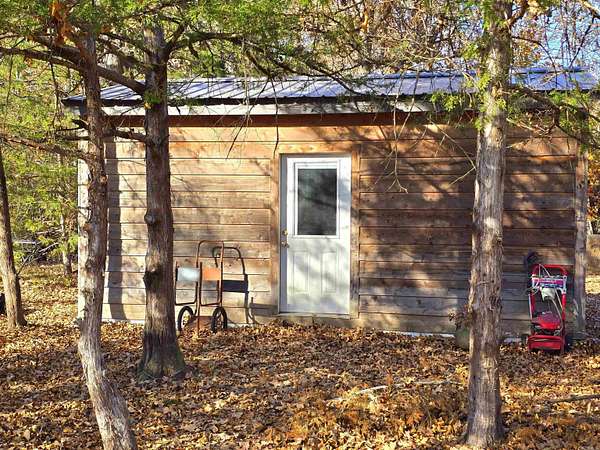 Country living by the lake. This Custom built 1,600 sq ft, 3-bedroom, 2 bath home on 20 unrestricted acres that borders Corps land. The whole house is Western Red Wood siding and 26-gauge crinkle finish roof. Enjoy your coffee or sunset views with wraparound porch that encircles the whole house. The living room has vaulted ceilings with a cozy wood burning double sided fireplace between the living room and kitchen. The kitchen includes custom cabinets, exotic granite countertops, and an adjoining dining/breakfast area. Large master suite with full bath and double entry shower. Loft area with bunk beds. Outside porch is stamped concrete floors and inside are stained/stamped concrete floors. There is also a 30x30 foam insulated shop with 10x30 lean-to, a 10x20 storage building, horse stalls/boat storage, and tack room. Shop has concrete floor, lots of plug-ins and 220-amp serv. Some house furnishing are optional.