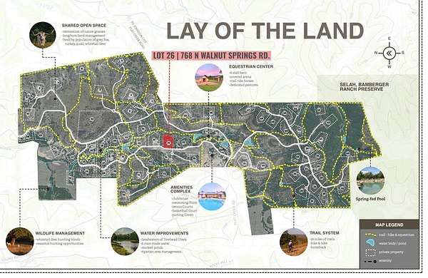 Lot 26 is one of the largest and most private homesites in The Preserve at Walnut Springs — a gated 2,000-acre ranch community with just 66 lots, an hour from both Austin and San Antonio. At 7.01 acres with a private well already in place, trees maintained, underbrush cleared, and multiple natural build sites established, the land is primed and ready to break ground. The ag-exemption conveys and there are no city taxes, making this a well-positioned piece of Hill Country to hold and build on. The property backs to Tow Creek — a seasonal rock-bottom creek — with no homes behind you and unobstructed Hill Country views. Mature live oaks spread across the acreage, their canopies creating natural pockets of shade and privacy that make the land feel tucked away. It's a quiet, private setting within a community that has real amenities when you want them: 22 miles of riding and hiking trails, an 8-stall equestrian barn with a covered arena, stocked fishing ponds, and a spring-fed swimming hole. The Hill Country-style clubhouse, swimming pools, tennis courts, and a putting green round out the social side. What makes The Preserve distinct is the ranch lifestyle that comes built-in. Longhorn cattle roam the grounds, maintained by an onsite Ranch Manager — owners get the authentic feel of a working ranch without carrying that responsibility themselves. An onsite concierge handles the details. Whether you're out on the trails in the morning or sitting under the oaks watching the light change in the evening, this is a place that rewards the people who've been looking for a real piece of the Hill Country — well-kept, well-positioned, and ready to build on.