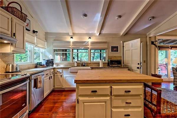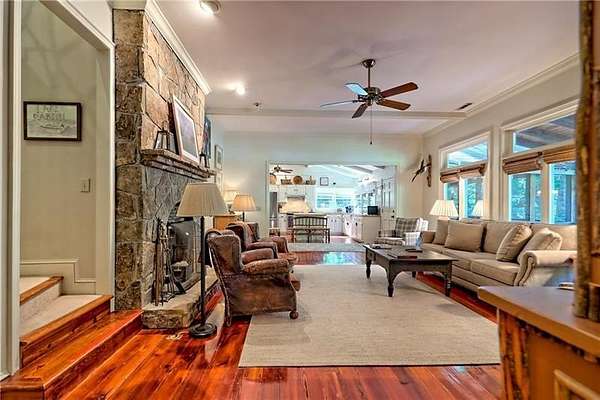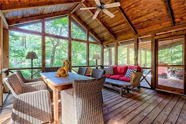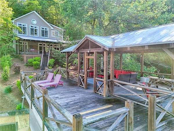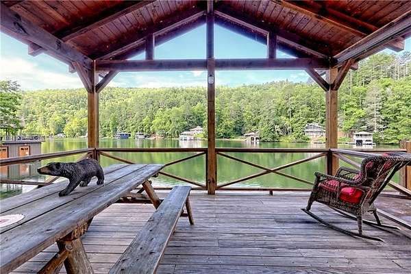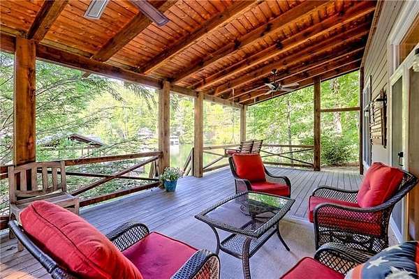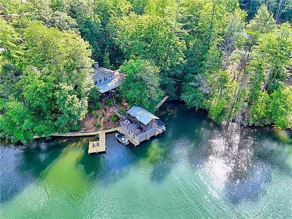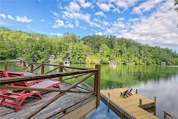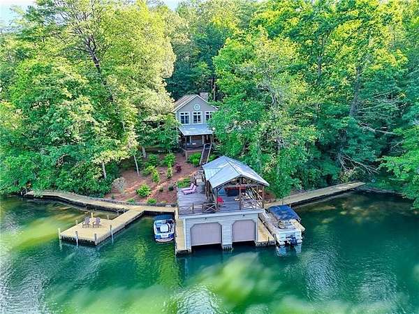 Recreate and Relax at this welcoming, traditional, lake home. Situated close to the water on a gently sloping lot, this house is located within the tranquil "Narrows" of Lake Rabun capturing big water views. This well maintained 5 bedroom, 4 bath home is offered FURNISHED and with TWO BOATS included (Pontoon Boat and Ski Boat). It has an exceptionally long shoreline of lake frontage which provides privacy and a 2-stall boathouse offering abundant storage. There is easy access to the kitchen from the level, 2 car carport into the main level of the house. The cozy living room with a native stone fireplace invites warm gatherings that can migrate onto the full-length open porch with its spectacular lake view. A second, oversized screened porch is conveniently located off the kitchen and is the favored dining area for large groups. The dine-in kitchen has two large walk-in pantries and opens to the living area. A TV room adjacent to one of the two main level bedrooms and baths creates an ideal hang out area. A second bedroom and bath complete the main level. Retreat upstairs to the spacious Primary bedroom, sitting area and bath with a breathtaking mountain /lake view. There are two additional bedrooms on this level and one full bathroom and laundry closet. Enjoy outdoor cookouts and gardening in the backyard which has a covered, stone porch and is partially fenced. Relax and Entertain at the two stall Boathouse which has an open deck for the sun worshipers and a Pavillion top for the shade seekers. The oversized party dock serves dual purposes for lounging and boat docking. The expansive dock along the shore has recently been rebuilt. This deep water location is ideal for boating and lake activities. Lake Rabun offers a full service marina, 2 restaurants, a charming top rated hotel, and multiple special event venues that await for your pleasure. Just a 2 hour drive from Atlanta, 20 minutes to downtown Clayton or 10 minutes to the historic village of Lakemont this location is most convenient. Lake Rabun is known for its outstanding community engagement and its dedication to safety and the preservation of the natural environment.