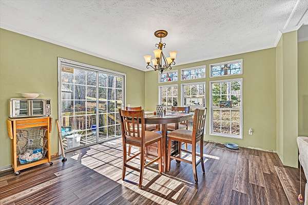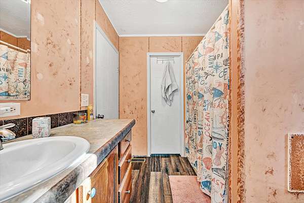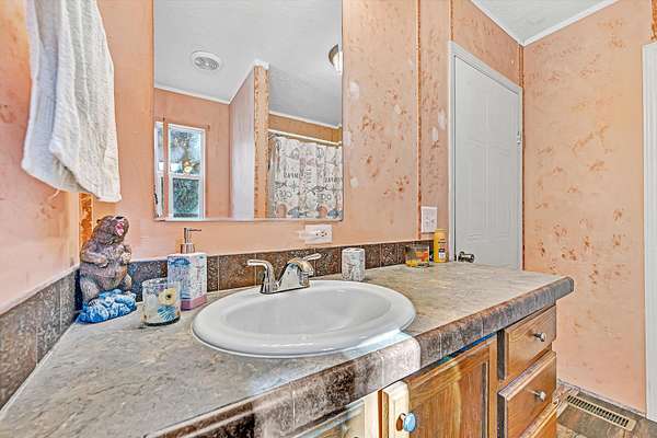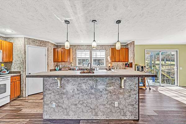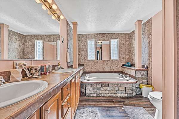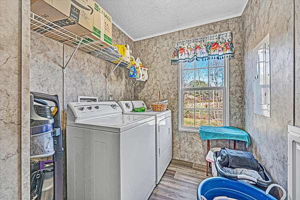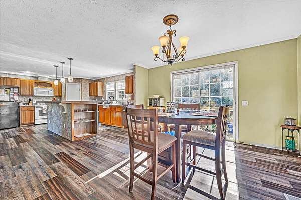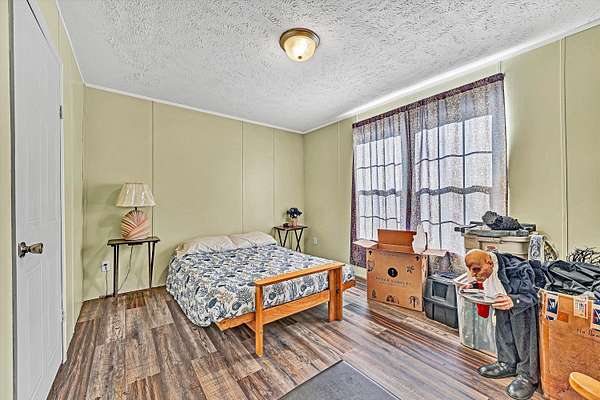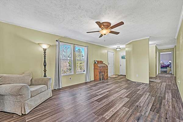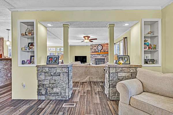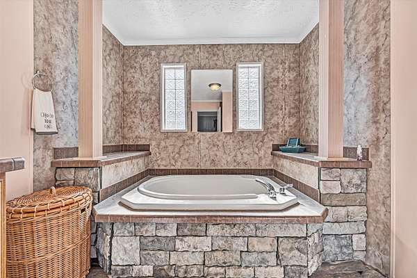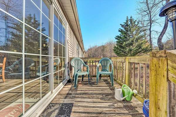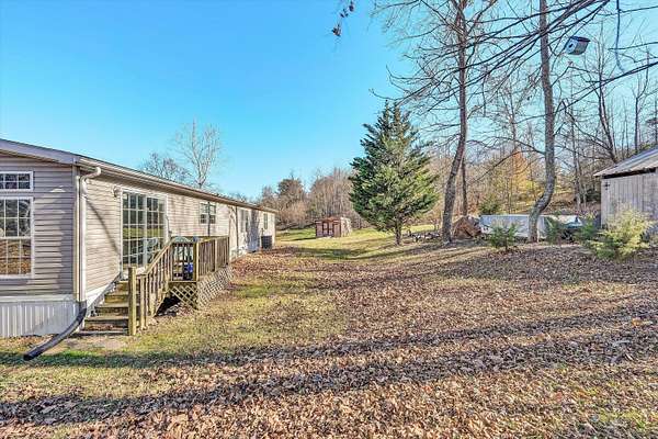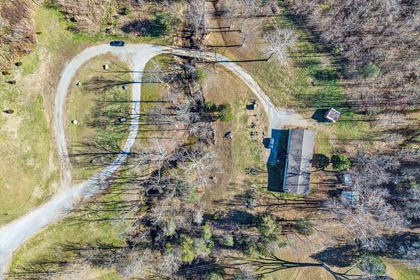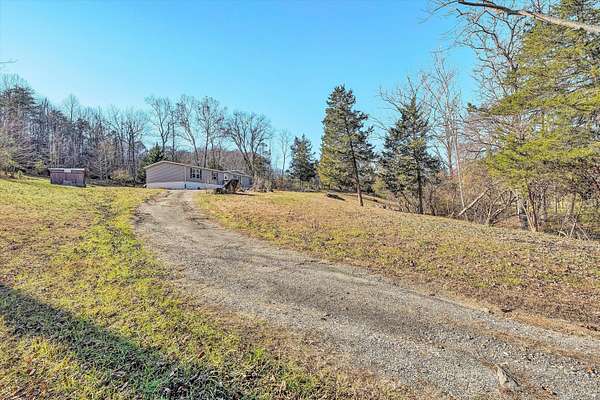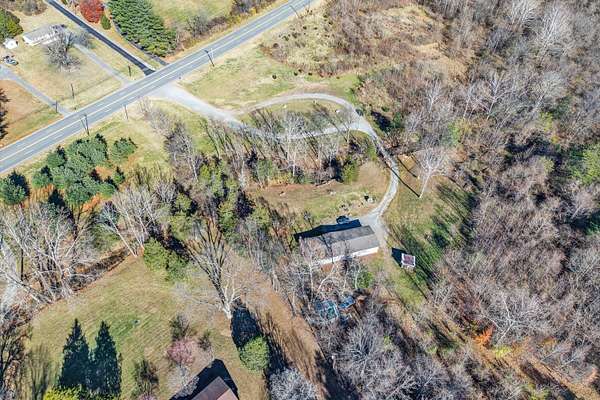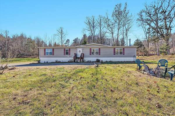 Discover serene one-level living in this spacious 2,240 sq ft home nestled on a secluded 2.8 acres surrounded by woods, offering privacy & a peaceful flowing creek. Step inside to an open floor plan that includes both a great room & a living room, highlighted by luxury vinyl flooring and a stunning rock fireplace that sets a warm, inviting atmosphere. The spacious master bedroom features a relaxing soaking tub, double sinks and a roomy walk-in closet. A convenient office in the hall offers the perfect workspace or study area. The kitchen features an island, plenty of counterspace and huge kitchen pantry, providing lots of storage & organization. Enjoy the outdoors with a level yard ideal for gatherings, complete with a cozy fire pit and a charming rustic shed for extra workspace
