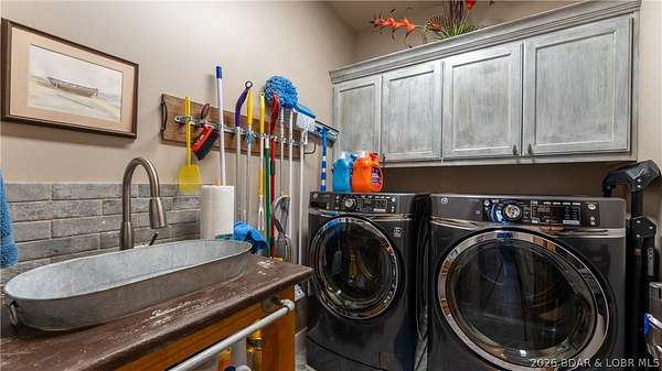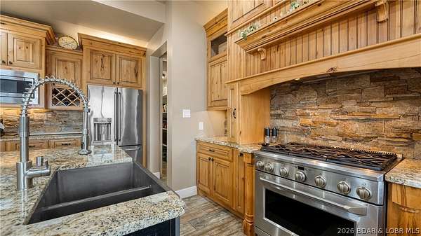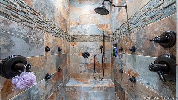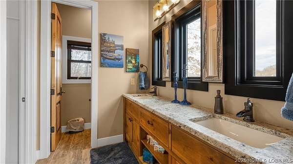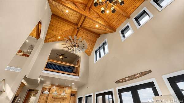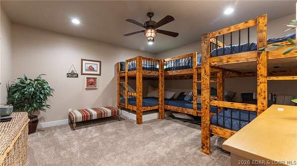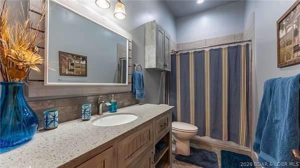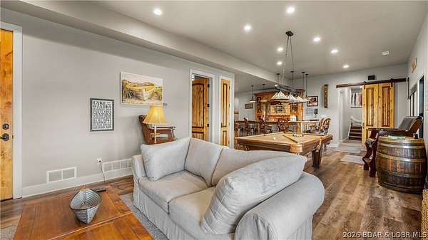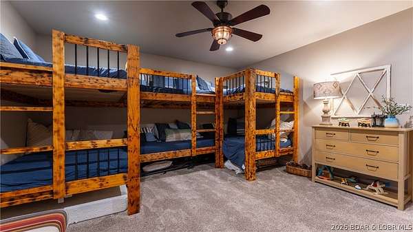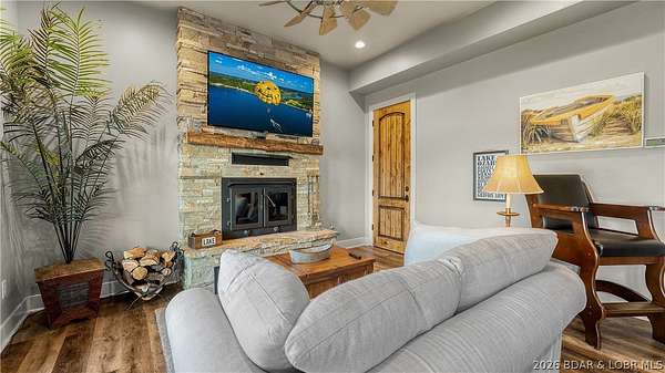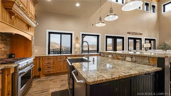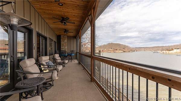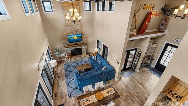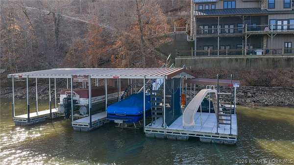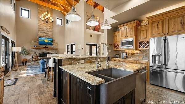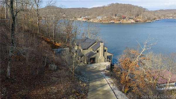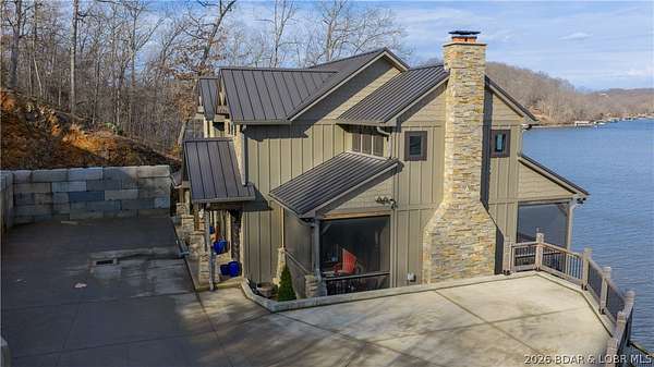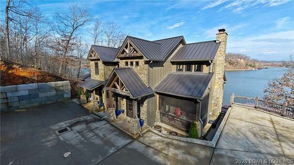 Private lakefront estate at the 55MM of the Osage. Set on 1.75 acres with an incredible 483' of shoreline, this furnished 6 bedroom, 5.5 bath retreat delivers privacy and space rarely found at the lake. Built in 2017 with nearly 3919 sq ft, the home was designed for gathering and entertaining with soaring two-story ceilings, and a dramatic stacked stone fireplace anchoring the open living area. The kitchen features granite counters and a large island overlooking the lake. Two main-level ensuites include the lakeview primary with a steam shower and a double vanity. Upstairs offers two bedrooms with a Jack and Jill bath plus a loft TV area, while the lower level includes a family room, game room, bar, bedroom, large bunkroom, and 2 full bathrooms. Outdoor living shines with multiple screened and covered spaces, an open deck, a covered grilling area, and an outdoor fireplace. Gentle walk with only 7 steps to the concrete dock featuring 12x32, 12x24 slips, boat lifts, 2 PWC spaces, Wet Steps ladder & Highdive, slide, and more. Long private drive, deep water, and room for a pool. Make it a complete package - the boats are available for additional $ outside the real estate transaction.