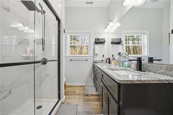 Est $3,582/moBeautifully maintained 4 bedroom, 3 full bath rancher offering 2,368 sqft of open-concept living on a private 3.15 acre fenced property with keypad entry gate. Property features, Cali Bamboo Luxury Vinyl Plank flooring throughout. The living room includes a gas fireplace with a new custom mantel. Primary suite featuring brand new custom glass door on walk-in shower and a walk-in closet with new custom built-in shelving and lighting. Additional highlights include new cellular shades, new whole-house water softener system, two new sheds and a chicken coop (chickens optional). A rare opportunity to own a move-in ready home with land, upgrades and charm in Gloucester!