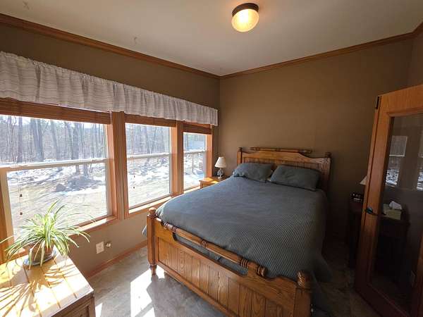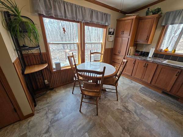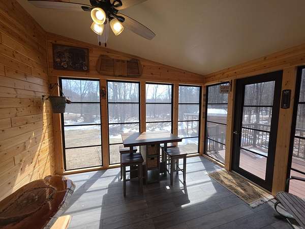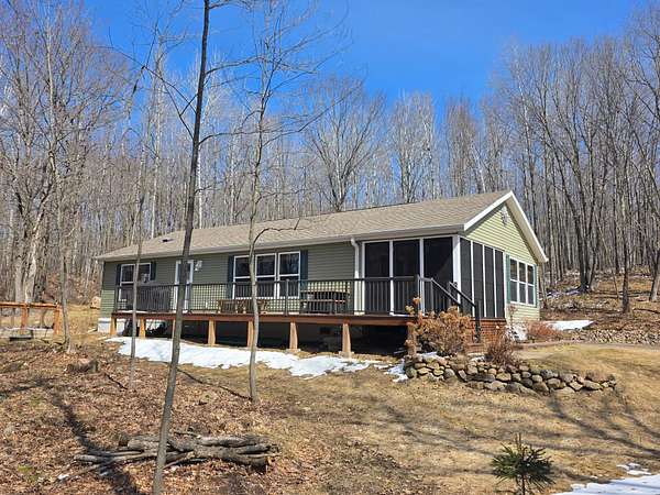 COUNTRY SECLUSION IS CALLING! This property is an outdoor enthusiast's paradise. The home features 2 bedrooms, 2 baths, a large open living room, an eat-in kitchen with plenty of cabinets, an attractive 3-season room, and a bonus room off the primary bedroom that offers many options such as a sitting room or sunroom. There is a covered entry porch and a huge deck overlooking the side yard. A detached 24x24 garage and a picturesque storage shed to accommodate your storage needs. As an added bonus there is an awesome, exterior, free-standing wood-fired Sauna building. The home sits on over 3 acres of rolling woodlands that adjoin hundreds of acres of Oneida County Forest land. You can snowmobile and ATV/UTV right from your blacktop driveway. Approximately an 1/8 mile down the dead-end road is Perch Lake Park (Oneida County Park System) offering lake access to Perch Lake via a public dock, picnic area, pavilion, cross-country ski/snowshoe/bike trails and a boat launch just a short distance away. What more could you want?!