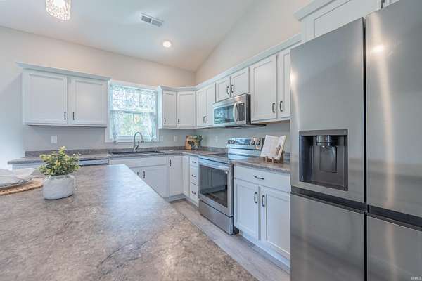 - Ceiling-9+, Ceilings-Vaulted, Dishwasher, Eat-In Kitchen, Main Floor Laundry, Main Level Bedroom Suite, Refrigerator