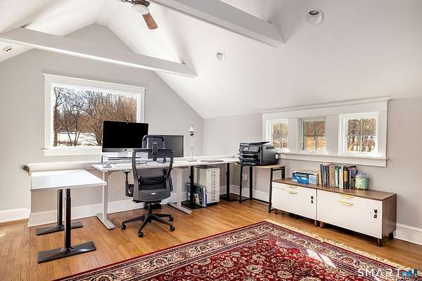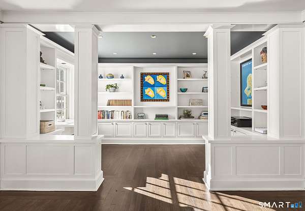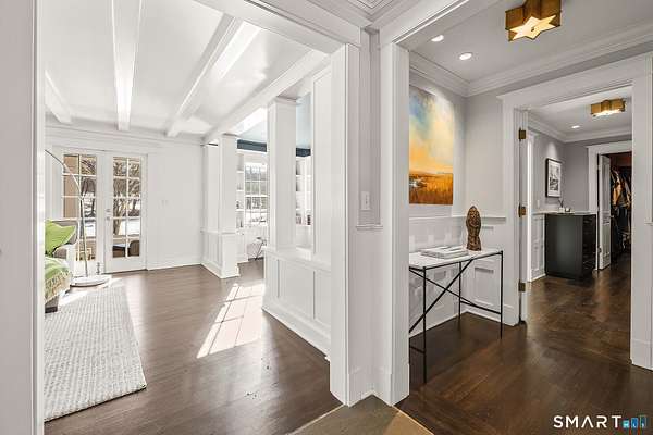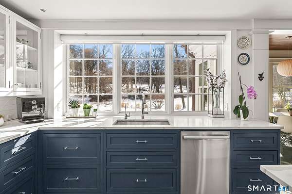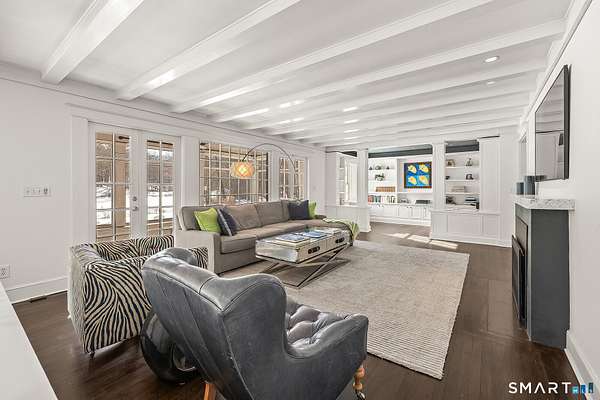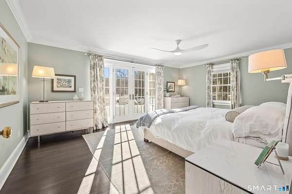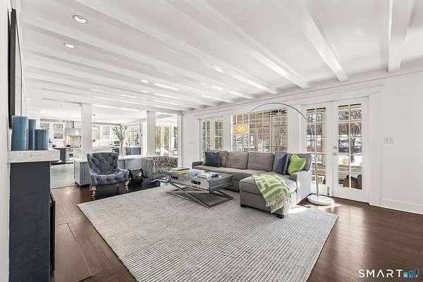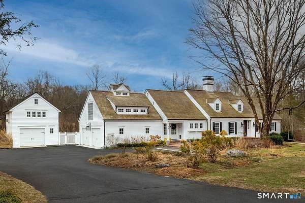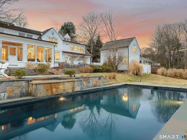A harmonious blend of storybook Connecticut charm with contemporary living, this spectacular classic Cape-style home on sought-after Golf Lane is a rare walk-to-town "gem". Situated on park-like grounds, this 5 BR home distinguishes itself with custom architectural details and one-of-a-kind craftsmanship by renowned artisan Chris Curnan. The heart of the home is the sun-filled gourmet kitchen with atrium-style dining that flows into the inviting living room, study, and screened-in sunroom, all overlooking the peaceful pond. The 1st floor primary has French doors to the patio, marble bath, and 2 walk-in closets. Formal dining room, powder room, mudroom, and laundry complete this level. 4 distinctive bedrooms upstairs with additional loft and oversized family room. Walk-out basement boasts newly installed gym floor, full bath, and ample storage. Finished space over detached 3rd garage serves as an office. The exterior extends the charming characteristics found inside. Magnificent multi-level stone patio provides ample space for al fresco dining, and stunning heated gunite pool with integrated spa adds to the outdoor oasis. With landscaping by Glengate, this beautifully manicured, level lawn set on over 2 acres offers a rare opportunity to experience space and privacy in a picturesque setting. Offering the ultimate in tranquility and comfort, this pristine estate with updates throughout and whole house generator is a commuter's dream, just minutes from the heart of Ridgefield.