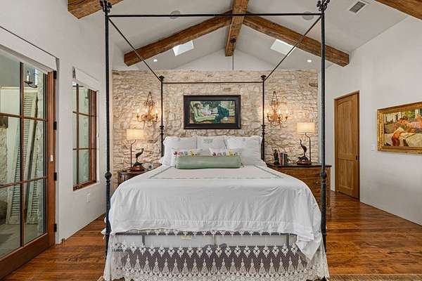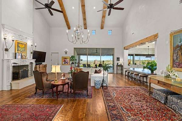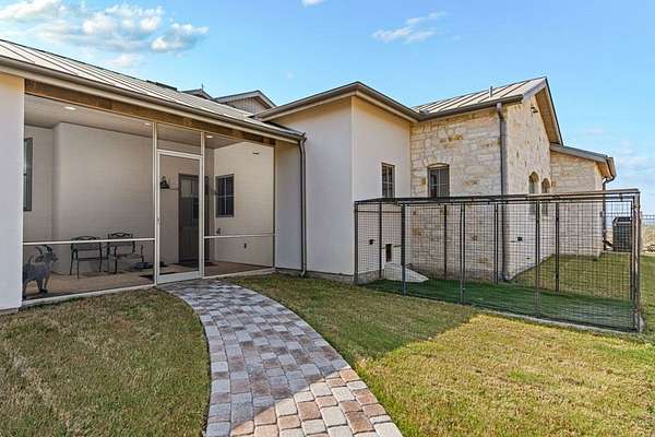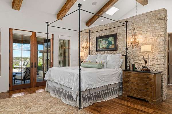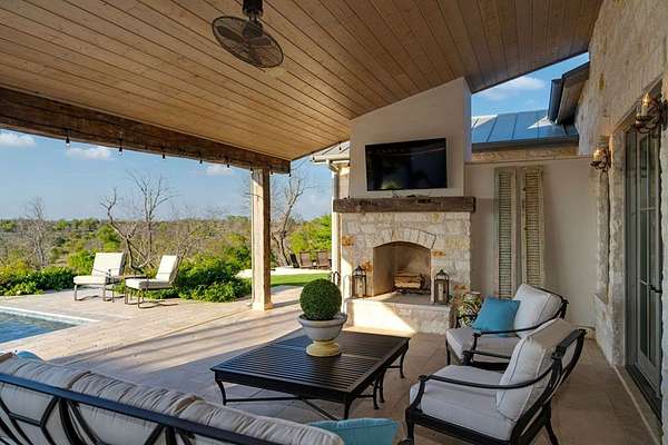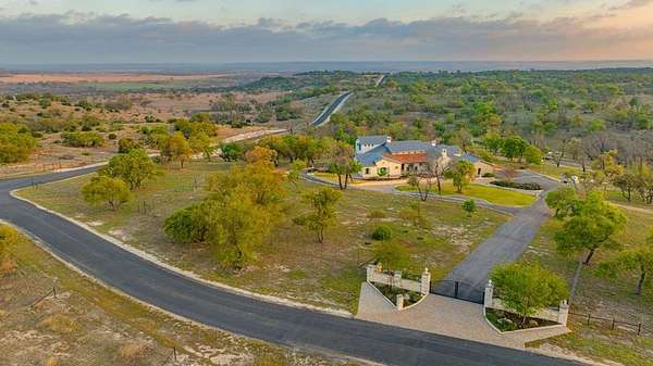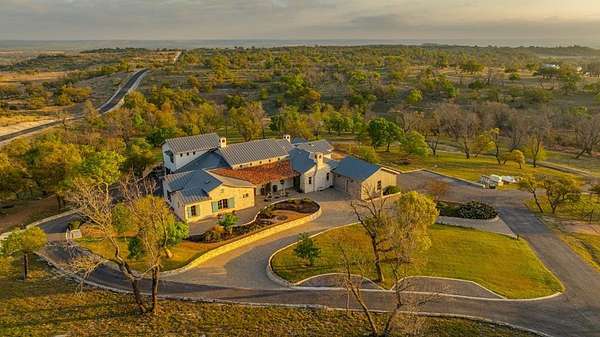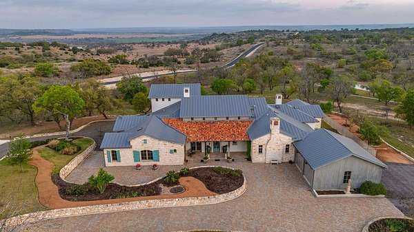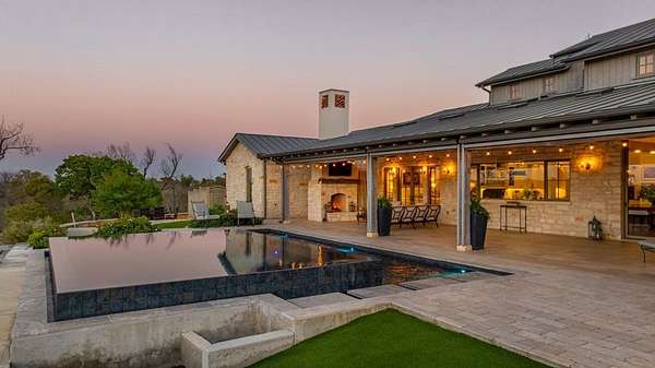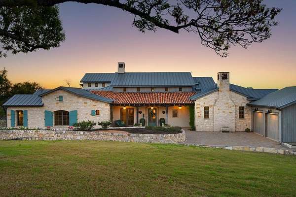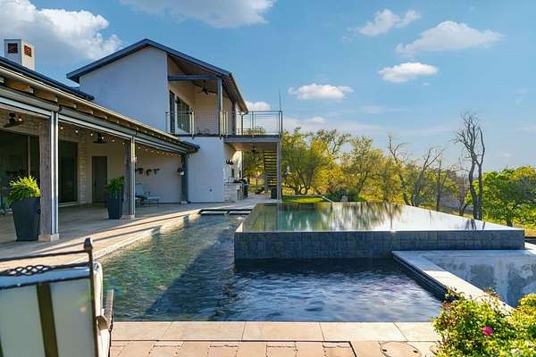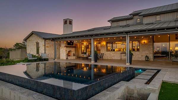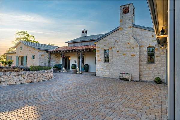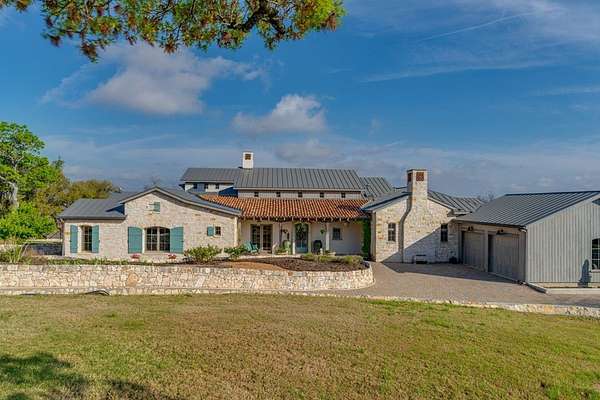 French Country Elegance in the Texas Hill Country. Set on 56.02 acres within the exclusive gated community of Falcon Ridge Ranch, this exceptional French Country estate blends timeless European design with the natural beauty of the Texas Hill Country. Custom built by Lemburg House, the 5,332 square foot residence was thoughtfully designed with an uncompromising attention to detail and a focus on enduring quality. Positioned on one of the property's most premier homesites, the home captures sweeping long-range views and offers a setting that is both private and breathtaking. Inside, the home unfolds with a refined, layered aesthetic where every element has been carefully selected and executed. The main living area welcomes you just beyond the entry, where soaring ceilings, a statement fireplace anchored by an antique European hearth, and a wall of windows create a dramatic yet inviting space. Natural light pours in, while doors open seamlessly to the outdoor living areas, allowing the landscape to become part of the home. The kitchen continues this sense of thoughtful design, both beautiful and highly functional. A custom walnut countertop serves as a focal point, complemented by hand-laid parquet wood flooring that reflects old-world craftsmanship. The space is equipped with dual refrigerators, dual dishwashers, two warming drawers, and a chef's range—designed to accommodate both intimate meals and large gatherings with ease. A second living space offers a more intimate retreat, wrapped in rich pecky cypress that brings warmth and depth. With built-in shelving and a corner bar, this room has been used as both a library and a refined dining space. A private second-story guest suite includes its own sitting area, bedroom, bathroom, and balcony overlooking the pool and surrounding Hill Country views. Throughout the home, the level of finish is exceptional—true hand-scraped wood floors, Venetian plaster walls, artist hand-painted murals, and curated French lighting fixtures create a sense of character and authenticity rarely found. Each detail contributes to a home that feels both collected and timeless. Outdoor living is equally compelling. A sprawling rear lanai extends the length of the home and opens to an infinity-edge pool, perfectly positioned to capture long-range views. Multiple seating and dining areas, along with a wood-burning fireplace, create an ideal environment for both quiet mornings and evening gatherings. The land itself is rolling, usable, and thoughtfully improved, with perimeter and cross fencing, a high-fenced area surrounding the home, and a wildlife exemption in place. Additional features include a stocked fishing pond with bubblers and feeder, a 1,200 square foot insulated barn/workshop, two water wells (including one on the adjacent tract), and dual 5,500-gallon stone water storage tanks. A 45kW generator with dedicated propane storage provides added security and reliability. Additional improvements include two attached two-car garages, conditioned storage, a screened porch with dog run, commercial-grade dog wash, and raised garden beds within the fenced area. Offering a rare combination of land, views, craftsmanship, and thoughtful design, this is a truly special Hill Country property—equally suited as a full-time residence or private retreat.
