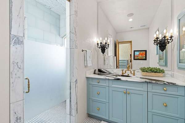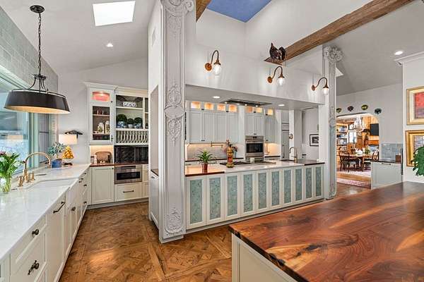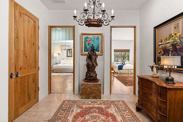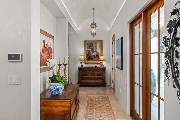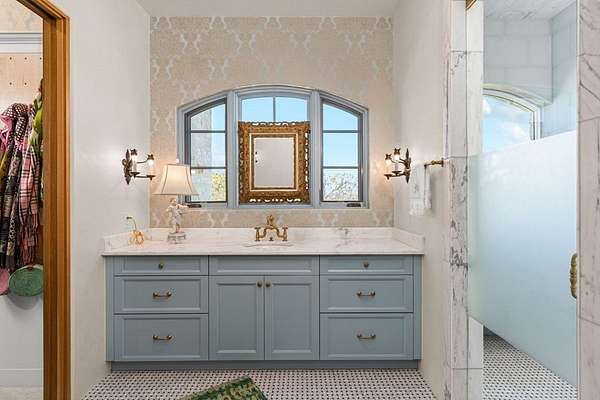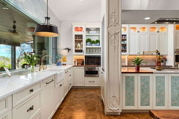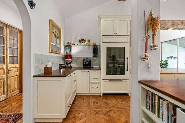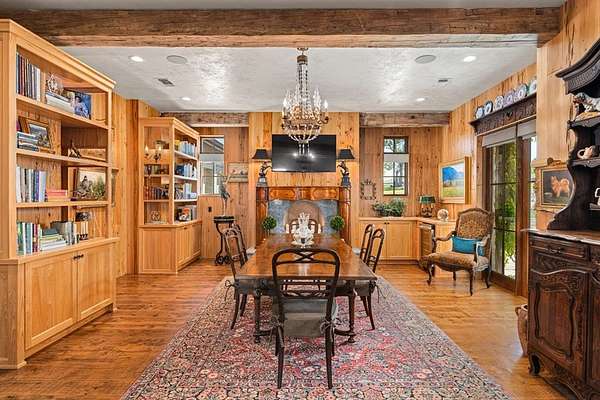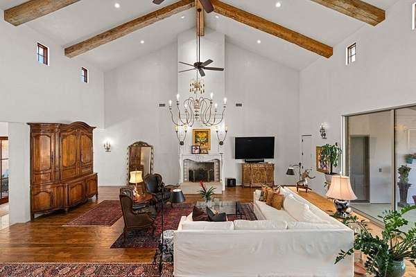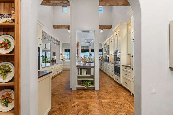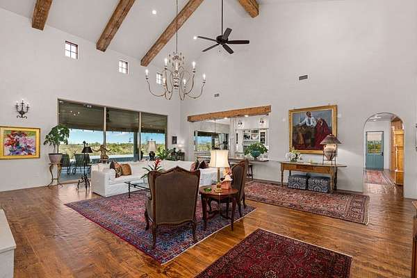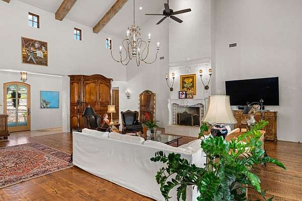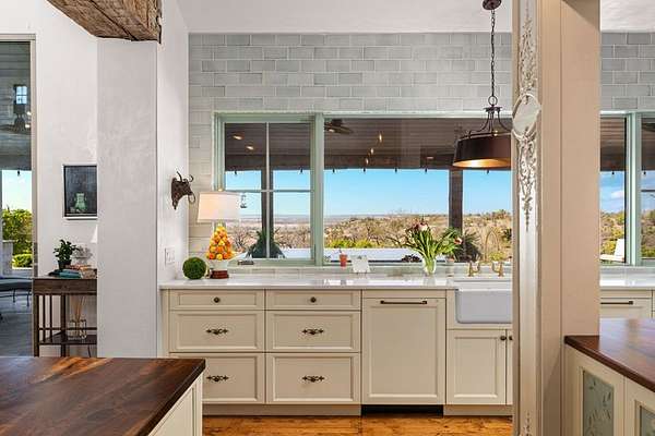 French Country Elegance in the Texas Hill Country. Set on 56.02 acres within the exclusive gated community of Falcon Ridge Ranch, this exceptional French Country estate blends timeless European design with the natural beauty of the Texas Hill Country. Custom built by Lemburg House, the 5,332 square foot residence was thoughtfully designed with an uncompromising attention to detail and a focus on enduring quality. Positioned on one of the property's most premier homesites, the home captures sweeping long-range views and offers a setting that is both private and breathtaking. Inside, the home unfolds with a refined, layered aesthetic where every element has been carefully selected and executed. The main living area welcomes you just beyond the entry, where soaring ceilings, a statement fireplace anchored by an antique European hearth, and a wall of windows create a dramatic yet inviting space. Natural light pours in, while doors open seamlessly to the outdoor living areas, allowing the landscape to become part of the home. The kitchen continues this sense of thoughtful design, both beautiful and highly functional. A custom walnut countertop serves as a focal point, complemented by hand-laid parquet wood flooring that reflects old-world craftsmanship. The space is equipped with dual refrigerators, dual dishwashers, two warming drawers, and a chef's range—designed to accommodate both intimate meals and large gatherings with ease. A second living space offers a more intimate retreat, wrapped in rich pecky cypress that brings warmth and depth. With built-in shelving and a corner bar, this room has been used as both a library and a refined dining space. A private second-story guest suite includes its own sitting area, bedroom, bathroom, and balcony overlooking the pool and surrounding Hill Country views. Throughout the home, the level of finish is exceptional—true hand-scraped wood floors, Venetian plaster walls, artist hand-painted murals, and curated French lighting fixtures create a sense of character and authenticity rarely found. Each detail contributes to a home that feels both collected and timeless. Outdoor living is equally compelling. A sprawling rear lanai extends the length of the home and opens to an infinity-edge pool, perfectly positioned to capture long-range views. Multiple seating and dining areas, along with a wood-burning fireplace, create an ideal environment for both quiet mornings and evening gatherings. The land itself is rolling, usable, and thoughtfully improved, with perimeter and cross fencing, a high-fenced area surrounding the home, and a wildlife exemption in place. Additional features include a stocked fishing pond with bubblers and feeder, a 1,200 square foot insulated barn/workshop, two water wells (including one on the adjacent tract), and dual 5,500-gallon stone water storage tanks. A 45kW generator with dedicated propane storage provides added security and reliability. Additional improvements include two attached two-car garages, conditioned storage, a screened porch with dog run, commercial-grade dog wash, and raised garden beds within the fenced area. Offering a rare combination of land, views, craftsmanship, and thoughtful design, this is a truly special Hill Country property—equally suited as a full-time residence or private retreat.