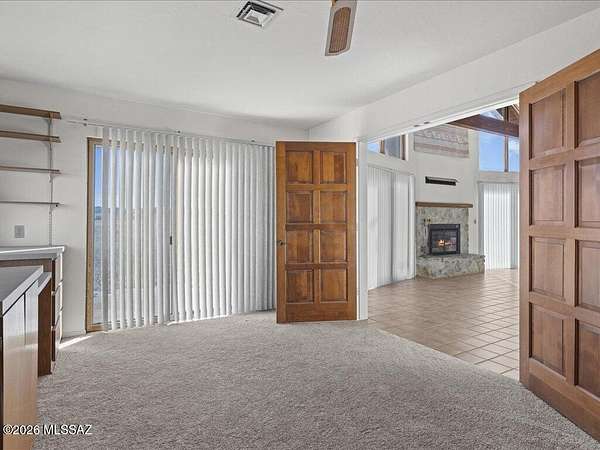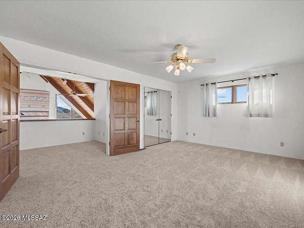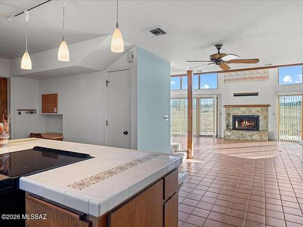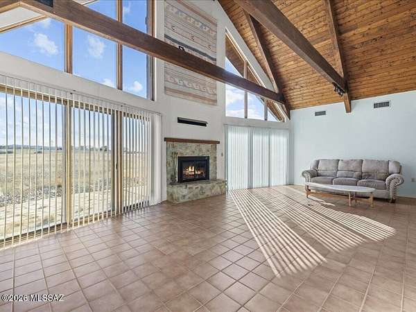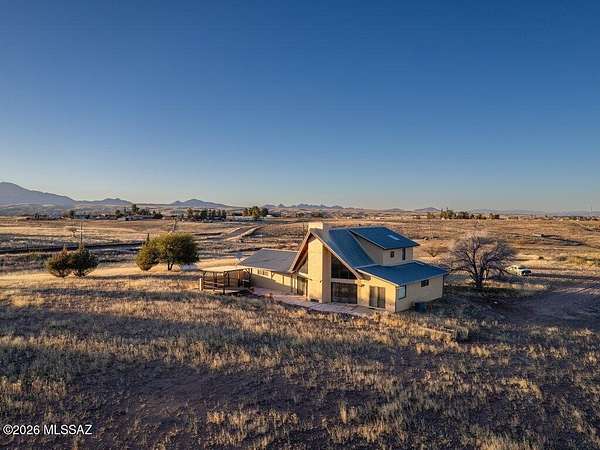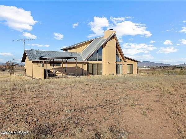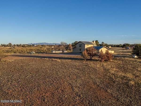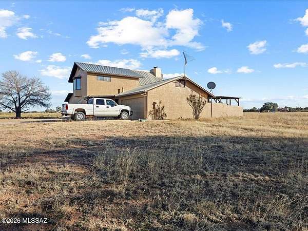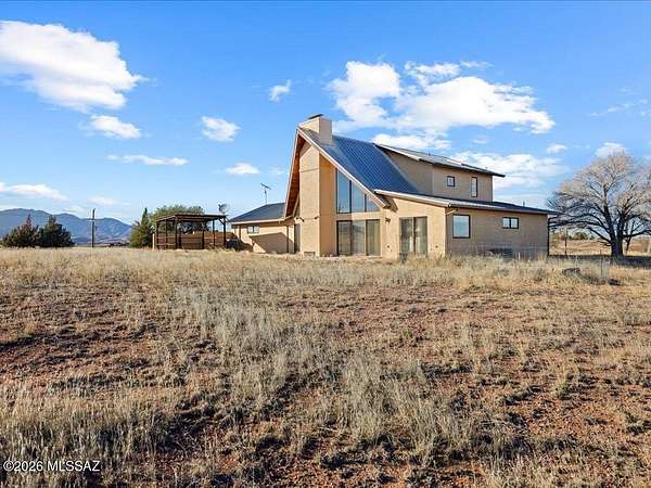 Custom home built on 10+ acres with old oak trees and native grass. The home has new exterior paint, new carpet, new tile in bathroom, and new stove in kitchen. Open wood truss ceiling and large windows in the great room with a big cozy fireplace, bedroom/office downstairs is large enough to make into a third bedroom. Loft and primary bedroom upstairs with en-suite, and walk-in closet w/cedar. Two car garage has utility area and laundry. Outdoor block structure with roof could be for animals, or storage. Amazing views of the Santa Rita Mountains, Great location, close to town center and restaurants. National Forest just down the road for riding, and hiking. Easy commute to Tucson, Nogales, & Sierra Vista. +++Extra land adjacent to this property can be bought, 8.95 acres for $175,000