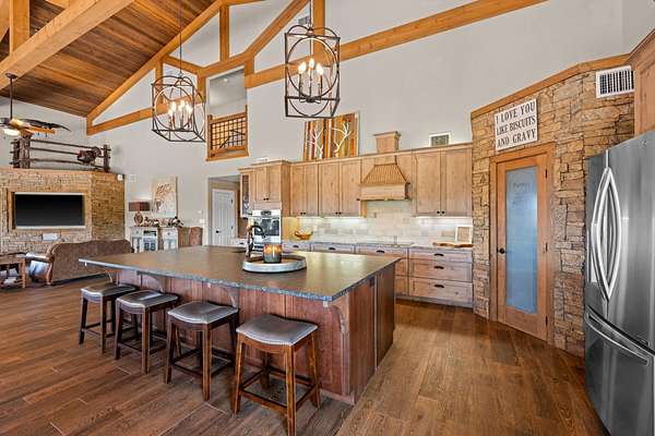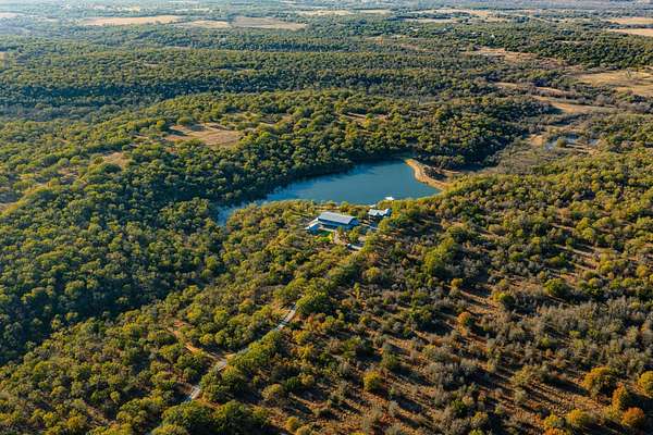 Canyon Lake Ranch is a rare opportunity to own a premier, fully developed ranch designed to maximize every aspect of the land. This exceptional 448+/- acre property offers unmatched versatility, making it ideal for hunting and fishing, family use, a full-time residence, or a corporate retreat, all within an hour of the DFW area. At the heart of the ranch is a hilltop luxury residence overlooking a stunning 5-acre bass lake. The 4,225+/- sq ft main home (built in 2016) features 7 bedrooms, 6 full baths, and 2 half baths, centered around a spacious open-concept living, dining, and kitchen area ideal for entertaining. An 805+/- sq ft guest house sleeps up to 14 guests, complemented by two climate-controlled shops totaling over 2,800 sq ft. Additional improvements include a putting and chipping green, outdoor pavilion with full kitchen, fireplace, sound system, and boat dock. The land is exceptionally diverse, featuring 4,200 feet of both sides of Buck Creek, eight total lakes and ponds, productive coastal hay fields, established food plots, year-round protein feeders, and an extensive road system providing access to the entire ranch. Terrain ranges from hilltops with long-range views to creek bottom hardwoods and a unique canyon area filled with rolling terrain and moss-covered boulders. Wildlife management has been in place for over a decade, producing 160-inch-plus native whitetail deer, strong Rio Grande turkey populations, outstanding waterfowl hunting, and excellent fishing with largemouth bass exceeding 5 pounds. Water is a defining feature, highlighted by the 5-acre lake, nearly a mile of Buck Creek, seven additional ponds, and three water wells. Utilities include electricity via United Cooperative Services and Starlink internet. Conveniently located 25 minutes from Weatherford, 50 minutes from Fort Worth, and 1 hour 15 minutes from Dallas, Canyon Lake Ranch offers true turnkey ownership of one of the most complete ranches in the region.