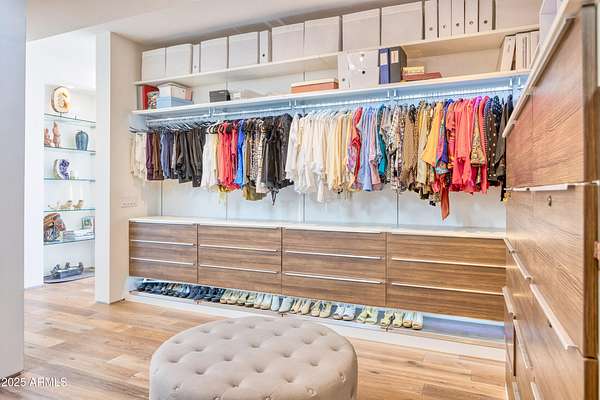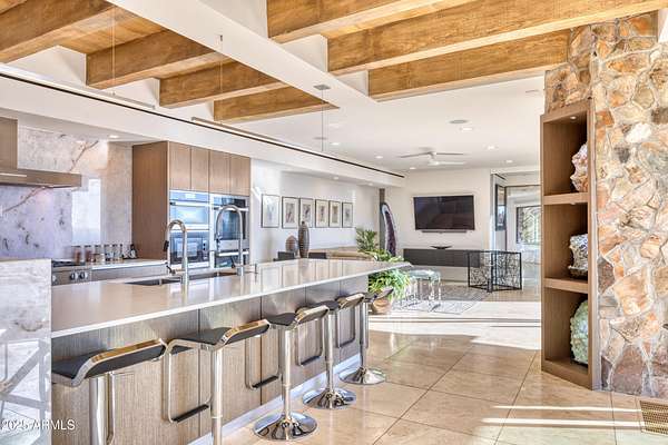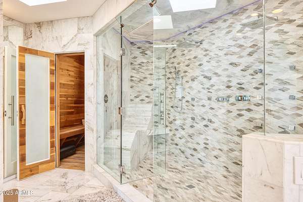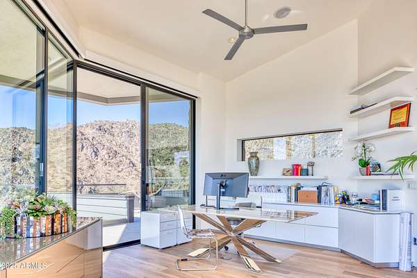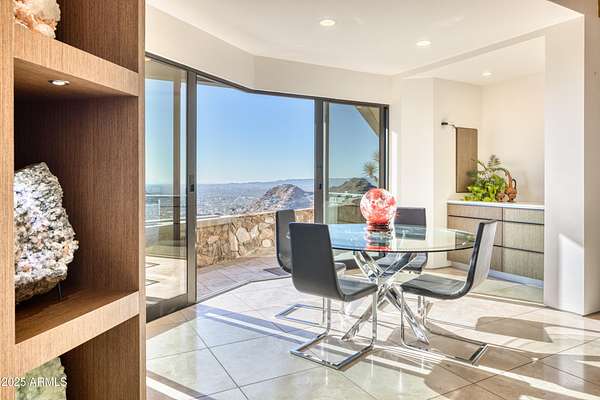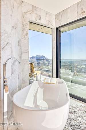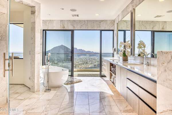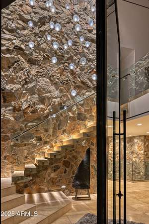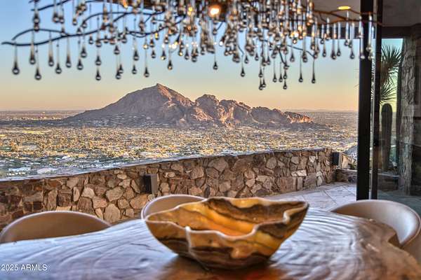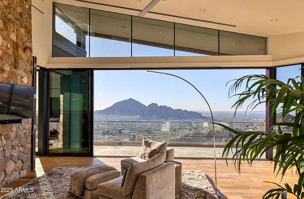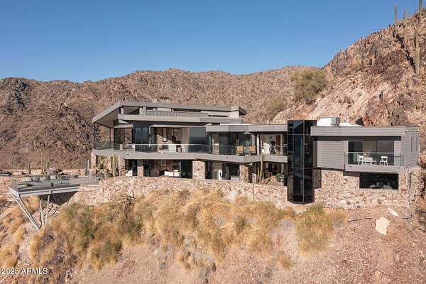 The HIGHEST HOME in Paradise Valley + the surrounding areas. At the top of Guard Gated Clearwater Hills, across from Paradise Valley Country Club + featured in the WALL STREET JOURNAL, sits this jaw-dropping contemporary marvel. A 2 year remodel below the studs 2014- 2016, the stone walls have been repurposed from the mountain itself. Disappearing glass walls, copious patios reveal unmatched views of the entire valley, including a center focus on CAMELBACK MTN & DOWNTOWN PHOENIX CITY LIGHTS.The massive Primary Suite has a large sitting rm w/ wetbar, office + bathrm w/ huge steam shower + sauna. Floating stairs, smart home, Miele appliances, gym, elevator, African Wenge wood, Media Room, CANTILEVERED VIEW DECK w/fire feature, pool, spa + borders the PRESERVE w/ a beautiful SAGUARO FOREST!