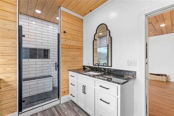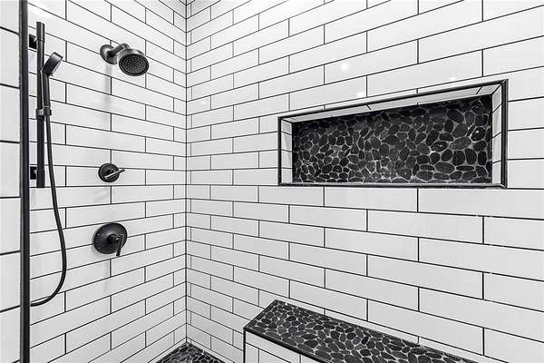 The kitchen is a true showstopper with quartz countertops, stainless steel appliances, farmhouse sink, walk-in pantry, and an eat-in bar--ideal for both everyday living and entertaining. The recently remodeled primary bathroom boasts a stunning walk-in shower, large vanity, and a window that frames peaceful outdoor views.