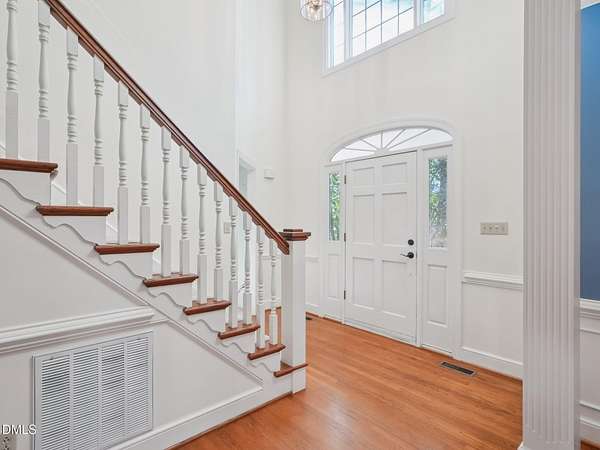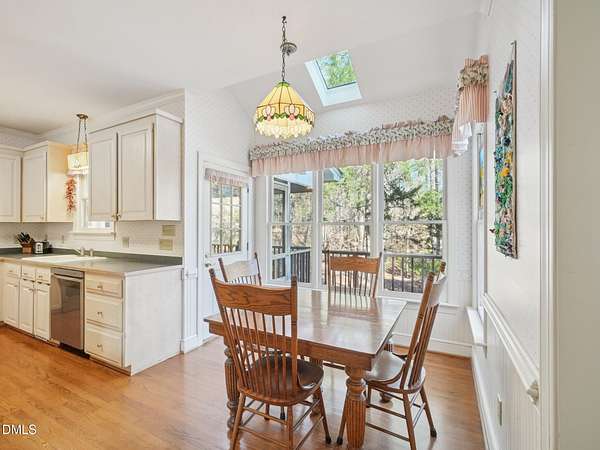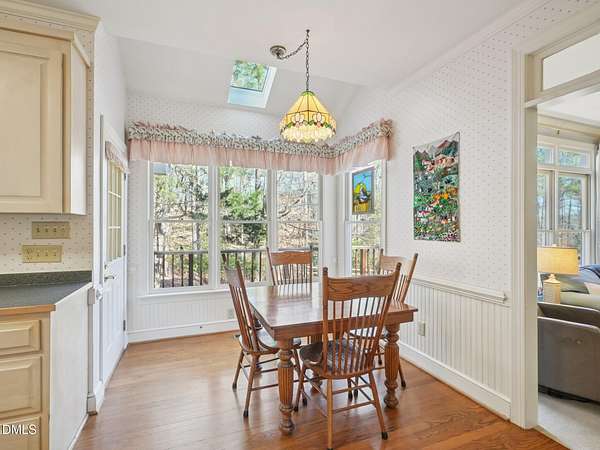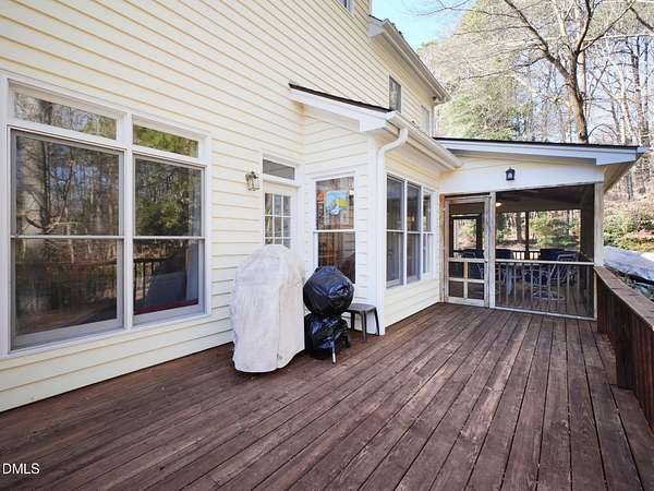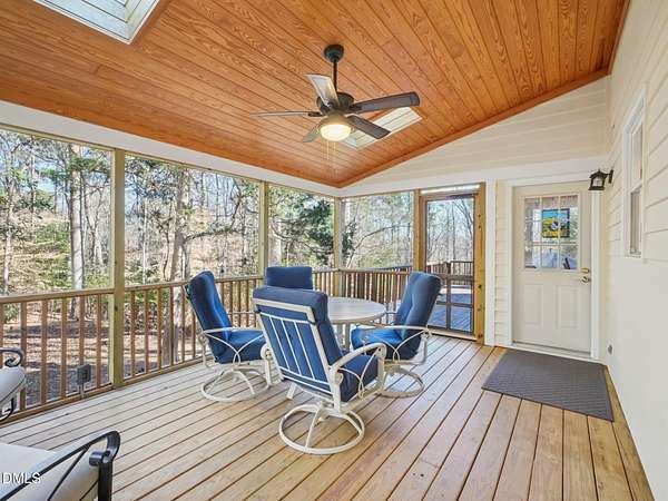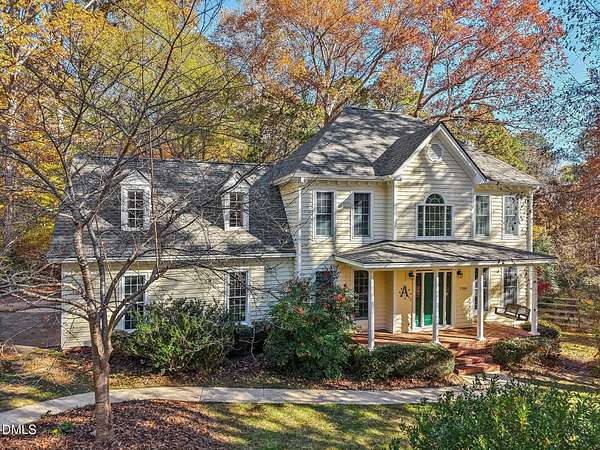 Set on a picturesque 2.1-acre, mostly wooded cul-de-sac lot in the sought-after Thompson Mill subdivision, this thoughtfully designed home offers privacy, beauty, and a convenient west Wake Forest location with an easy commute to RTP! The heart of the home is a well-planned kitchen with a generous breakfast nook, perfect for everyday living and casual gatherings. Just beyond, the living area features a cozy fireplace insert-ideal for crisp winter evenings. A spacious screened porch extends off the breakfast nook, offering approximately 240 square feet of outdoor living space with room to seat 6-8 and a ceiling fan for warm-weather comfort. The main level also includes a striking two-story foyer, formal dining room, and a flexible front room that works beautifully as a home office, playroom, or sitting room. Upstairs, all bedrooms are conveniently located along with the laundry room and a large bonus room suited for a variety of uses, including a media room, guest space, or additional office. A walk-up attic provides excellent storage, and the roof was replaced in 2023. Outdoor spaces truly shine here. A large fenced organic garden features established perennials, apple, peach, and fig trees, blueberries, and two dedicated vegetable planting areas. Rock walls, stone steps, and a fire pit add charm and functionality, while a separate herb garden-along with asparagus, scallions, and additional planting beds near the garage-will delight any home chef. Meandering pathways throughout the gardens and woods create easy access across the property and offer a peaceful retreat into nature. Approximately three-quarters of the land is wooded, with the majority comprised of mature hardwoods including oak, poplar, hickory, and maple. Flowering trees and shrubs surround the home and garden areas, providing year-round interest and natural beauty.
