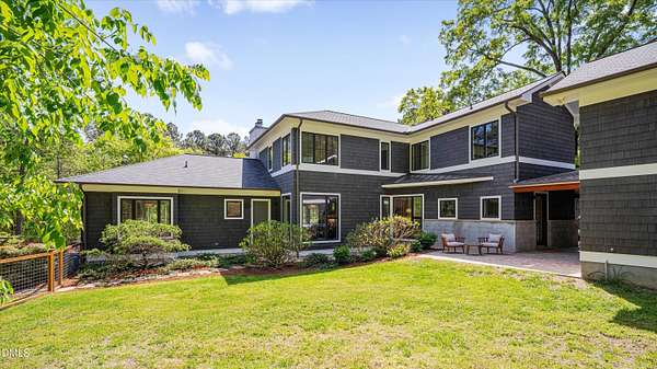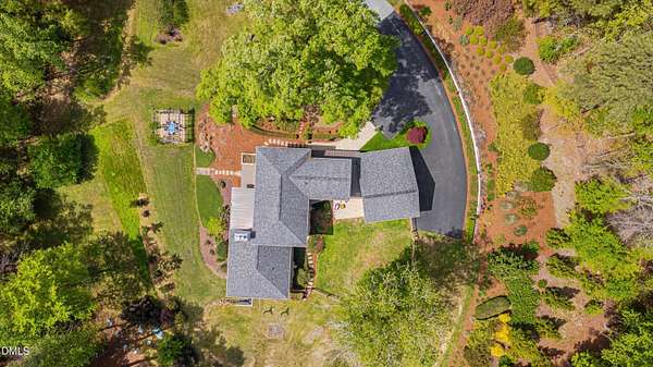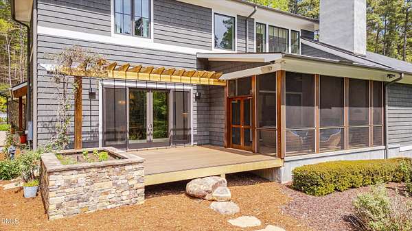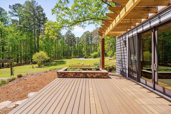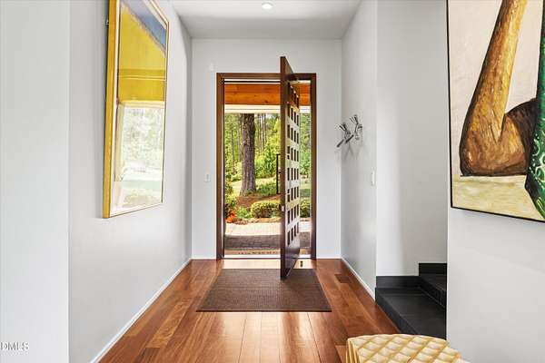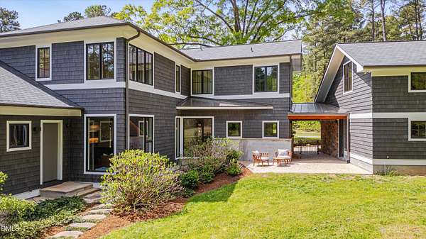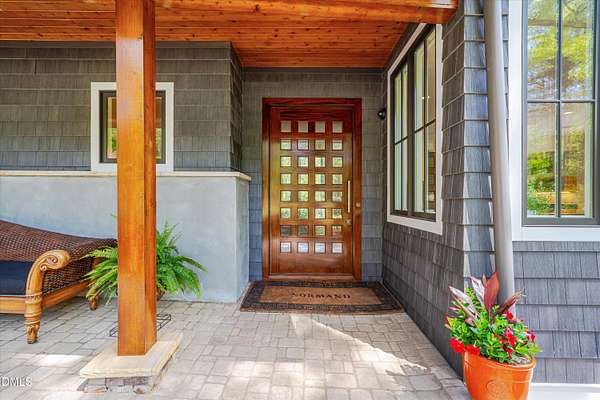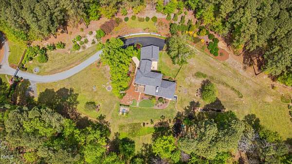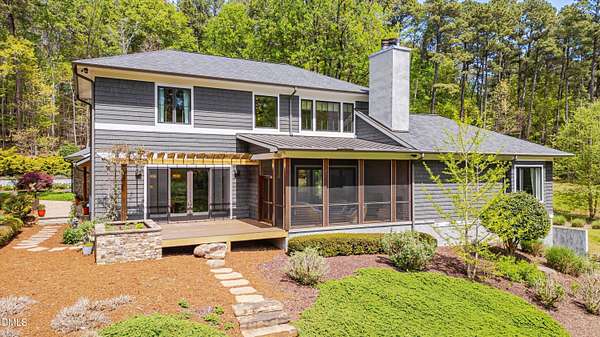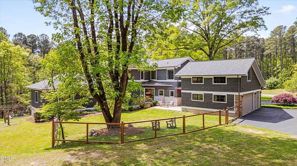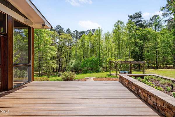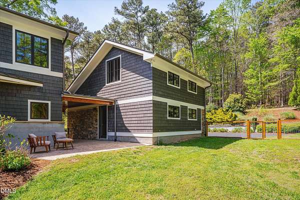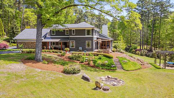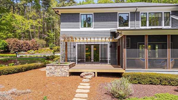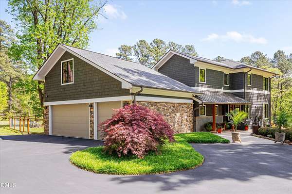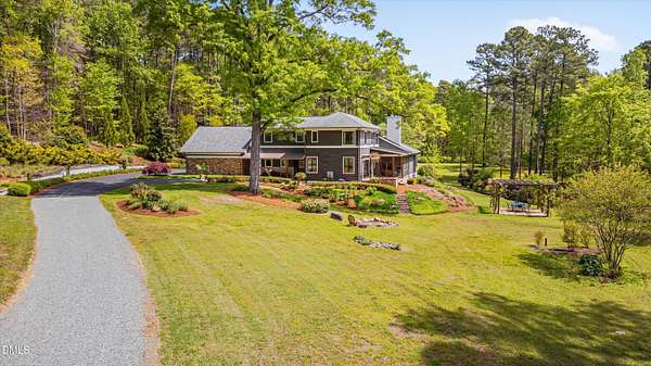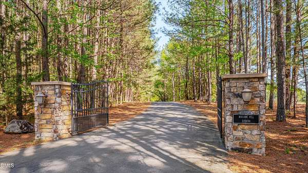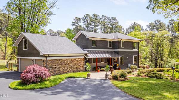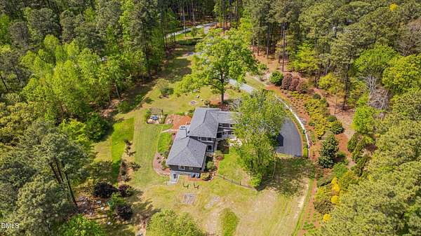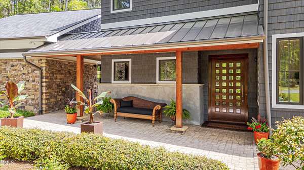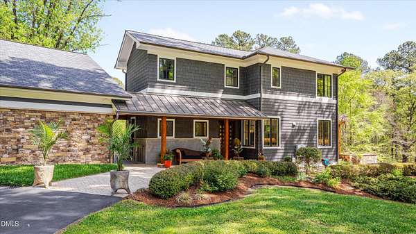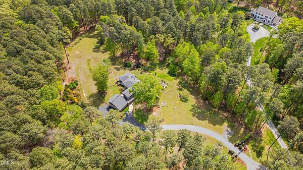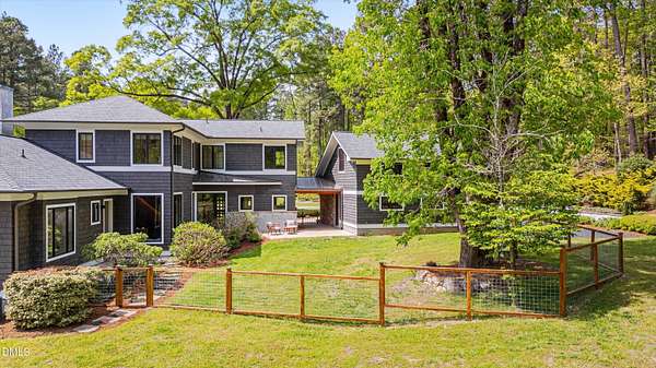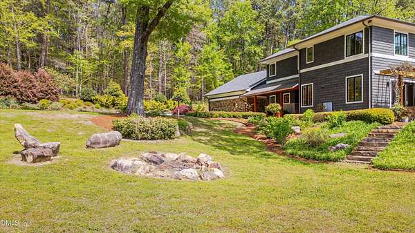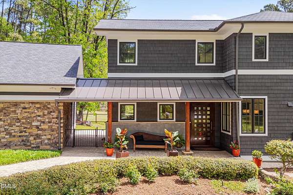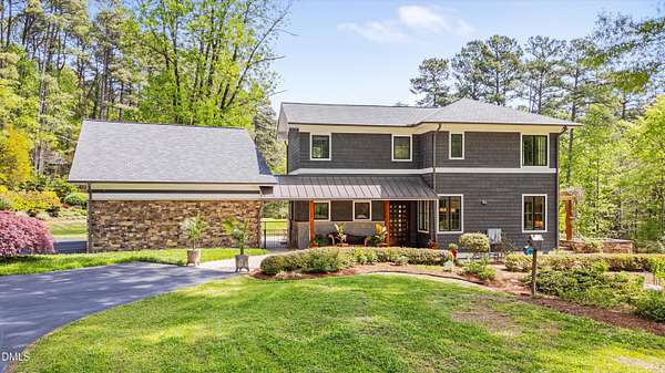 A home for the ages on eleven sweeping acres in a quiet, leafy hamlet--barely five minutes from downtown but a world away. Enter through a custom iron gate and stone-columned entry to artfully planted rolling acreage edged by old-growth forest, steps from Carrboro and Chapel Hill's culture and dining. Designed with Sitzer Spuria studios and Will Johnson Building Company, this soulful residence sits in natural harmony with the land. Metal roofing, low-maintenance Nichiha Sierra Premium shake, local stone, cedar v groove eave ceilings, and a solid dark sapele-and-glass front door begin the story of how this home quietly impresses with unparalleled quality, elegant artistry, and innovative function. The strength of the architecture lies in the clarity and seeming simplicity of the composition - a simplicity that belies a rigorous selection of materials and finishes. Interiors embrace a calming neutral palette and organic textures that amplify the greens + blues of the landscape through strategically placed Marvin casement and picture windows. Expanses of glass create open sightlines; daylight becomes a material as skylights and sculptural overhead fixtures from Artemide, Foscarini, and Terzani cast diffuse glow. Stop and stair: the home's hallmark is a floating staircase of Cumaru cantilevered treads, solid glass balustrade, and a custom-coated concrete wall--a testament to precision + passion. Thoughtful, versatile spaces foster moments of serenity and corners of creativity. The living room's corner windows, built-in console, and flow to the screen porch invite linger-longer lounging. Carefully curated appointments include bespoke Aventine cabinetry and built-ins; stone countertops; Cumaru hardwood, natural slate, and soapstone floors; solid doors; sculptural fixtures; expansive ceilings; and integrated home automation for lighting, audio, security, and cameras. The modern, ultra-functional kitchen and dining area balance organic warmth with luxe functionality: curly maple cabinetry, moss-hued wall tile, Miele appliances (including wall-oven stack, induction, and refrigerator drawers), island with prep sink, and walk-in pantry. A beverage center with picture window, sink, Miele wine cooler, and second dishwasher elevates entertaining. The main-level primary suite is a meditative retreat with two custom walk-in closets. The modern primary bath soothes with neutral finishes, dual vanity areas with curly maple cabinetry, a spacious shower with glass tile accent wall, heated floors/towel bar and a soaking tub enveloped in the tile floor. A personality-packed powder room features a lava stone and enamel sink imported from France. The command-center office with built-in desk and pocket door empowers household management. An organizer's dream conjured the loads of style laundry and put together, practical mudroom. Upstairs, slumber in style in secondary bedrooms with vista views; perfect the art of work-life balance in flex space; and read between the lines in the fresh tile bathroom with en-suite + hall access. Popcorn-fueled movie-night marathons await in the lower-level home theater starring eight uber comfy, reclining seats + top of the line equipment including a giant screen. Concessions provided by the adjacent, conditioned 2700-bottle wine cellar. Expansion potential and storage abound in the unfinished, pre-plumbed room above the three-car garage and the poured-concrete lower level with outdoor access. The insulated mechanical room maintains comfortable year-round temperatures. Outdoor living is effortless: screen porch with wood-burning fireplace and Mugnaini pizza oven; Trex deck with raised stone planter and arbor; fenced garden; pergola-topped patio; and a covered front terrace favored for evening wind down. Park-like grounds open to surrounding woods and nearby trails. Architecture, design, horticulture, and poetry converge in a residence of understated elegance-authentic artisanship utterly connected to nature.