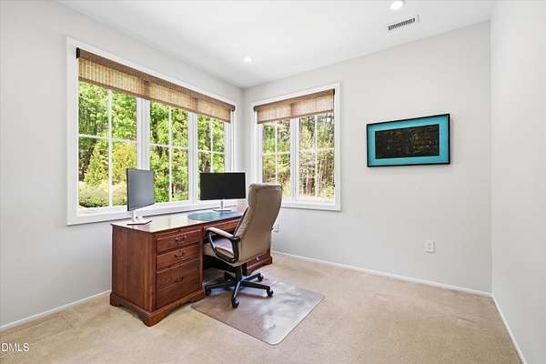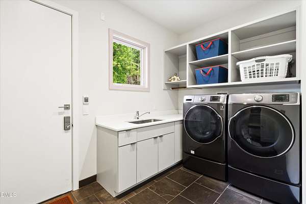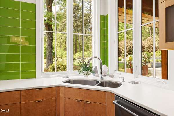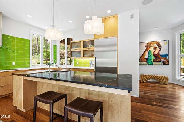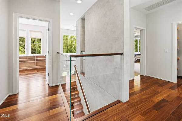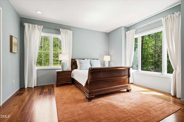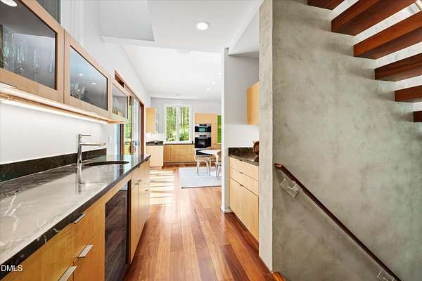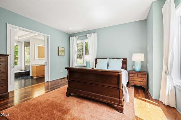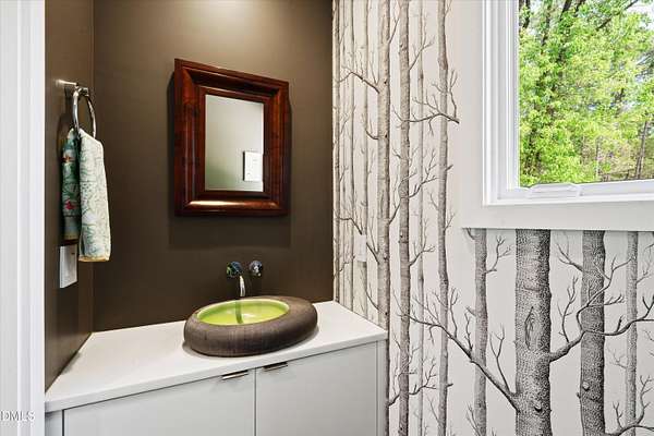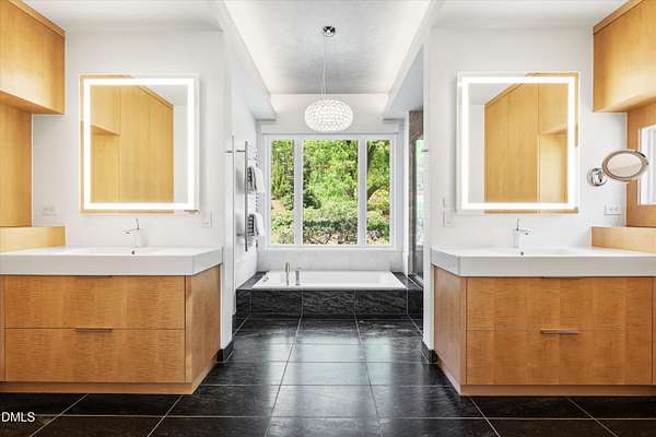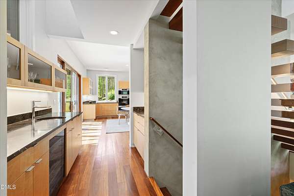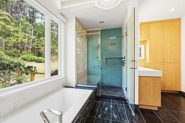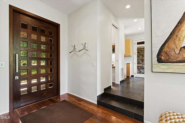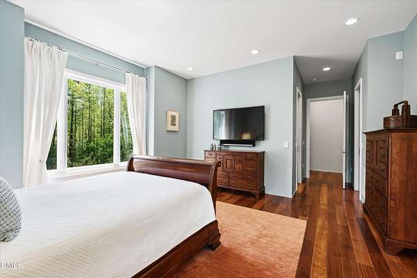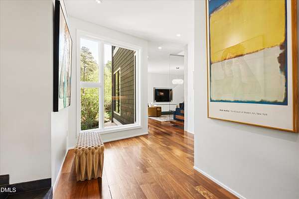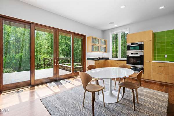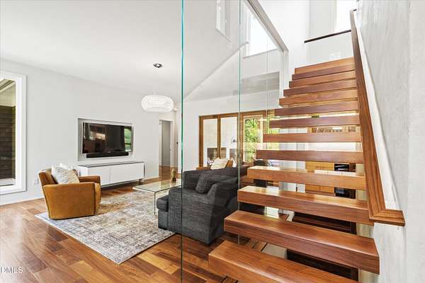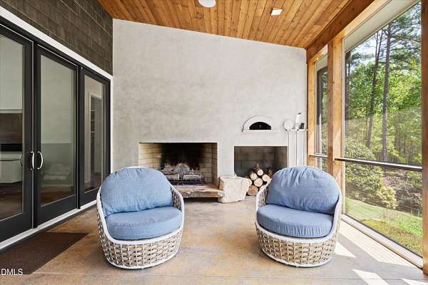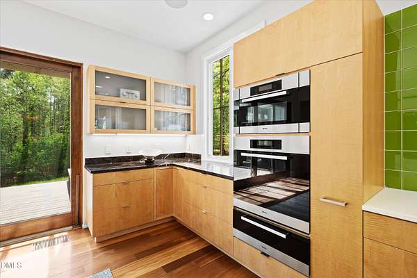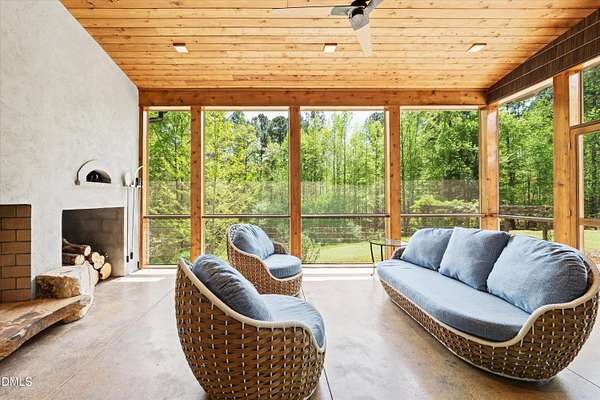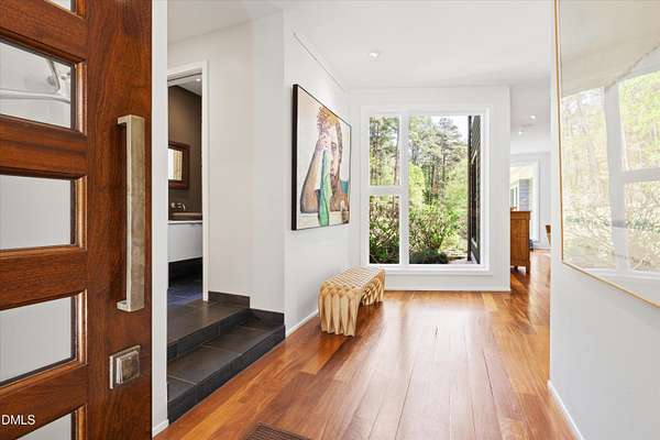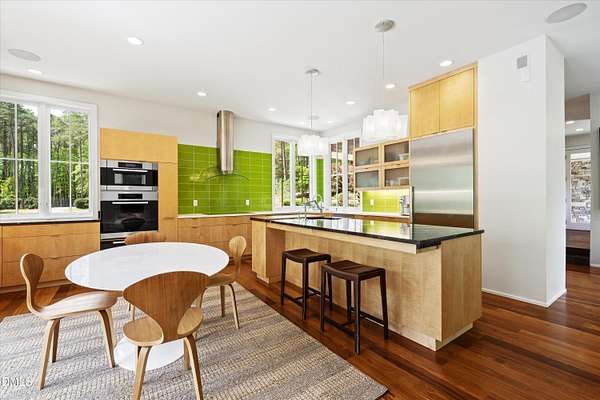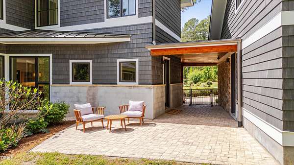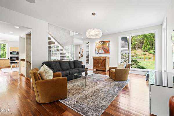 A home for the ages on eleven sweeping acres in a quiet, leafy hamlet--barely five minutes from downtown but a world away. Enter through a custom iron gate and stone-columned entry to artfully planted rolling acreage edged by old-growth forest, steps from Carrboro and Chapel Hill's culture and dining. Designed with Sitzer Spuria studios and Will Johnson Building Company, this soulful residence sits in natural harmony with the land. Metal roofing, low-maintenance Nichiha Sierra Premium shake, local stone, cedar v groove eave ceilings, and a solid dark sapele-and-glass front door begin the story of how this home quietly impresses with unparalleled quality, elegant artistry, and innovative function. The strength of the architecture lies in the clarity and seeming simplicity of the composition - a simplicity that belies a rigorous selection of materials and finishes. Interiors embrace a calming neutral palette and organic textures that amplify the greens + blues of the landscape through strategically placed Marvin casement and picture windows. Expanses of glass create open sightlines; daylight becomes a material as skylights and sculptural overhead fixtures from Artemide, Foscarini, and Terzani cast diffuse glow. Stop and stair: the home's hallmark is a floating staircase of Cumaru cantilevered treads, solid glass balustrade, and a custom-coated concrete wall--a testament to precision + passion. Thoughtful, versatile spaces foster moments of serenity and corners of creativity. The living room's corner windows, built-in console, and flow to the screen porch invite linger-longer lounging. Carefully curated appointments include bespoke Aventine cabinetry and built-ins; stone countertops; Cumaru hardwood, natural slate, and soapstone floors; solid doors; sculptural fixtures; expansive ceilings; and integrated home automation for lighting, audio, security, and cameras. The modern, ultra-functional kitchen and dining area balance organic warmth with luxe functionality: curly maple cabinetry, moss-hued wall tile, Miele appliances (including wall-oven stack, induction, and refrigerator drawers), island with prep sink, and walk-in pantry. A beverage center with picture window, sink, Miele wine cooler, and second dishwasher elevates entertaining. The main-level primary suite is a meditative retreat with two custom walk-in closets. The modern primary bath soothes with neutral finishes, dual vanity areas with curly maple cabinetry, a spacious shower with glass tile accent wall, heated floors/towel bar and a soaking tub enveloped in the tile floor. A personality-packed powder room features a lava stone and enamel sink imported from France. The command-center office with built-in desk and pocket door empowers household management. An organizer's dream conjured the loads of style laundry and put together, practical mudroom. Upstairs, slumber in style in secondary bedrooms with vista views; perfect the art of work-life balance in flex space; and read between the lines in the fresh tile bathroom with en-suite + hall access. Popcorn-fueled movie-night marathons await in the lower-level home theater starring eight uber comfy, reclining seats + top of the line equipment including a giant screen. Concessions provided by the adjacent, conditioned 2700-bottle wine cellar. Expansion potential and storage abound in the unfinished, pre-plumbed room above the three-car garage and the poured-concrete lower level with outdoor access. The insulated mechanical room maintains comfortable year-round temperatures. Outdoor living is effortless: screen porch with wood-burning fireplace and Mugnaini pizza oven; Trex deck with raised stone planter and arbor; fenced garden; pergola-topped patio; and a covered front terrace favored for evening wind down. Park-like grounds open to surrounding woods and nearby trails. Architecture, design, horticulture, and poetry converge in a residence of understated elegance-authentic artisanship utterly connected to nature.