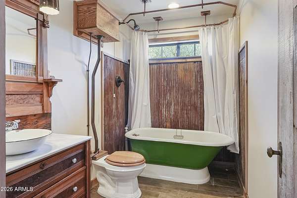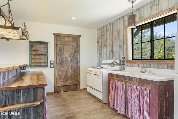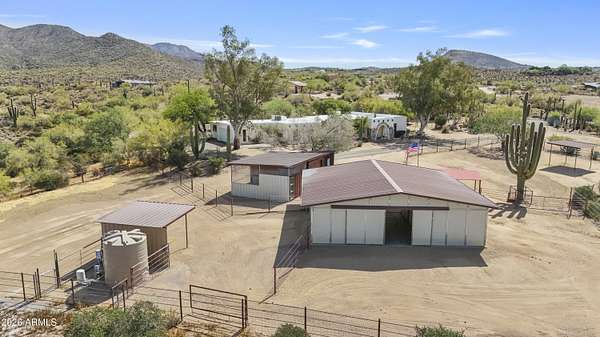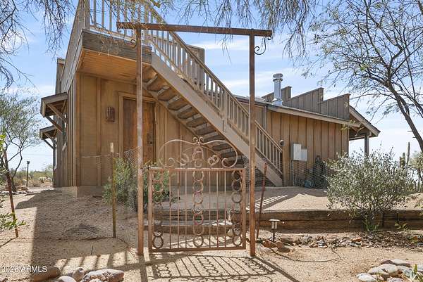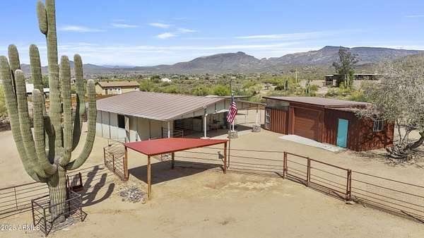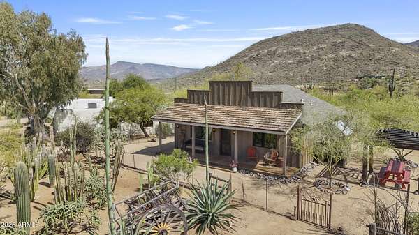 Imagine living in the Wild West, where open skies and mountain views stretch across nearly 5 private acres. This gated homestead has 3 beds, 2.5 baths, hickory wood and Saltillo floors, beamed ceilings and rugged Western charm. By the main home, the saloon stands proud with its boomtown facade and wide front porch. Complete with open living/kitchen for entertaining, and 2 beds and a bath for folks who bunk in. Ride on over to the M&D barn with 3 stalls and tack room, the 2 100' x 70' turnouts and the hearty chicken coop. With a 3-car garage, extra garage and storage building, there's room for all your gear. Tons of room for an arena too. Take a cowboy soak in the backyard pool off the covered porch. Close to town, yet tucked away --this storied ranch is changing hands after 20+ years.