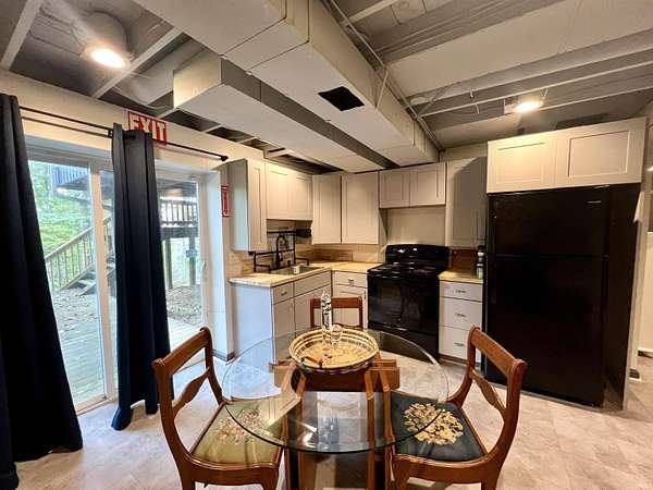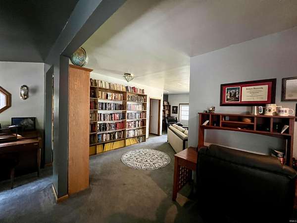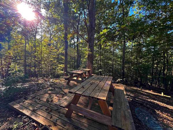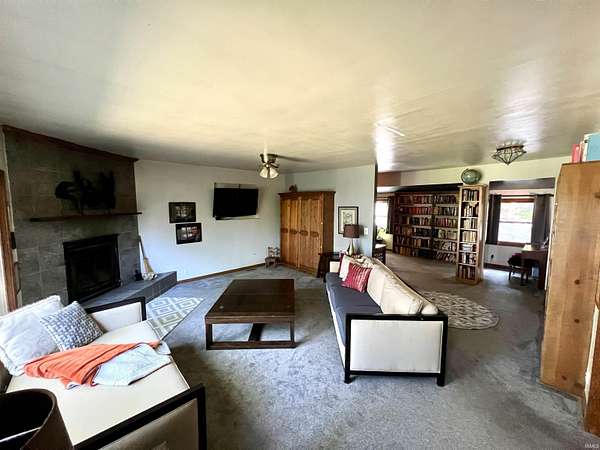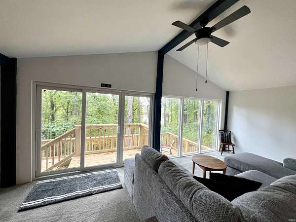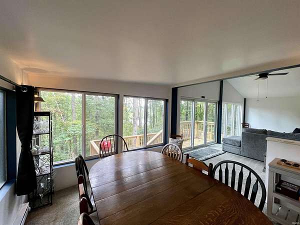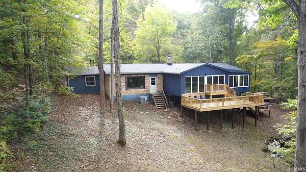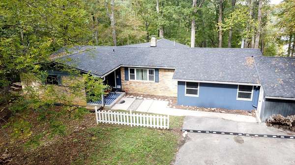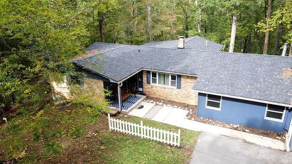 Discover lakeside living at its finest with Hoosier Lake House! This sprawling ranch-style retreat situated on over five picturesque acres overlooking the sparkling waters of Lake Monroe. Blending timeless character with modern luxury, this home also offers excellent income-producing potential, boasting a proven record as a successful Airbnb and VRBO rental.The main level spans nearly 2,800 square feet and features four bedrooms and two full baths, all conveniently located on one level. Three bedrooms showcase rich hardwood flooring, while the kitchen, dining, and family rooms feature vaulted ceilings and expansive windows framing breathtaking panoramic lake views.The recently renovated kitchen is a chef's dream, complete with custom cabinetry, quartz countertops, matching stainless-steel appliances, and thoughtful design elements throughout. The adjoining dining and family rooms share a stunning wall of windows and the Kitchen/ Living Room share a double-faced gas fireplace, creating a warm and inviting atmosphere accented by bamboo flooring.Step outside to enjoy over 600 square feet of new decking, wrapping around the back and side of the home--perfect for entertaining or simply soaking in the serene natural surroundings. A separate 12x12 deck offers additional space with two picnic tables ideally positioned for lakeside gatherings.The walkout basement provides an additional 1,000 square feet of flexible living space, including a kitchenette, full bath, and multiple flex rooms ideal for guests, recreation, or storage. It also features a dedicated fitness room equipped for Bikram yoga, with heat capability up to 104?F. Recent updates include: New roof (2025) /several New windows and doors/ Upgraded mechanical room with two electrical panels/ Brand-new water heater (2025)/ Reverse osmosis filtration system/ Fiber-optic high-speed internet. The laundry room can easily be transitioned into a shared laundry/butler's pantry, offering extra convenience. Select furnishings are negotiable, and the property will be sold as-is with a one-year home warranty provided by the sellers.One of the property's most extraordinary features is its private boat slip--a 16x26-foot dock located within a well-maintained association. With bylaws in place and a modest $300 annual fee, slips of this caliber are an exceptionally rare find on Lake Monroe.Surrounded by mature trees, natural rock formations, and geode-rich soil, the land is truly a geologist's playground.