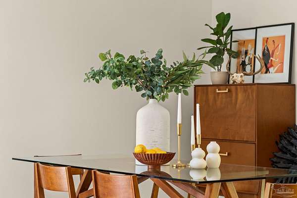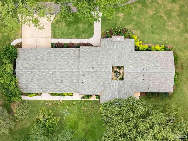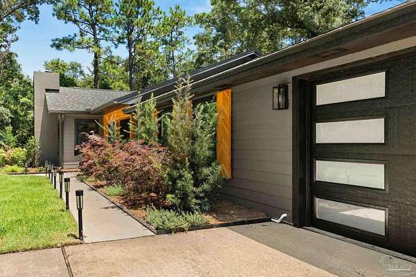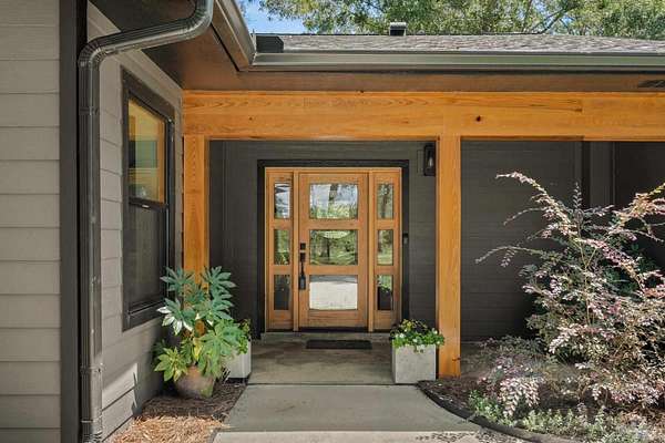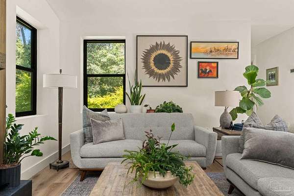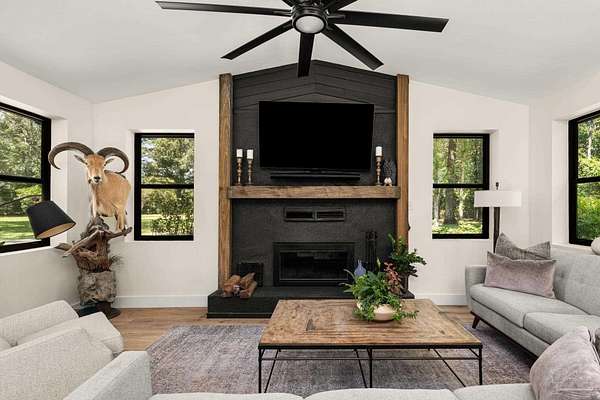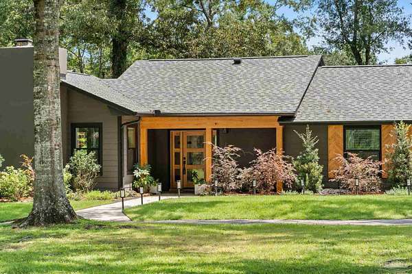 Behind the electric gate is an enchanting circular drive that warmly welcomes you to this remarkable 3.1-acre, five-bedroom, three-bath estate. This property offers an unparalleled blend of mid-century modern design, sophisticated style, and picturesque views. Constructed of solid CMU blocks, this home was built to withstand the test of time. In 2023, the residence underwent a complete renovation, preserving its unique character while improving function for low maintenance, "everyday" living. Lush landscaping, windows, siding, roof, Navien tankless gas water heater, American Standard Platinum Series HVAC system, and a 28 kW Kohler whole-home generator are a few of the substantial improvements made. Inside, wide-plank hardwood floors span the main living areas, highlighting the thoughtful flow between each space. At the center of the home, an atrium bathes the interior in natural light, creating a seamless connection between architecture and nature. Vaulted ceilings and a wood-burning fireplace anchor the elegant living room. The exquisite kitchen features quartz countertops, Bespoke Samsung appliances, and curated designer fixtures. The formal dining room exudes a chic mid-century flair, offering ample space for grand entertaining, yet cozy enough for a weeknight meal. The thoughtful split floor plan ensures maximum privacy. The guest rooms offer plush carpeting, generous storage, and serene views of Sunshine Hill. Each guest bath has been reimagined with custom vanities, modern fixtures, and bright, neutral paint. Beyond the residence, a milled asphalt drive directs you to the 50' x 55' enclosed pole barn. Additional storage for all of your tools and toys can be found inside the pole barn or under the adjacent lean-to. A private media room and a fully equipped gym elevate this pole barn to the next level. Every element of this estate reflects quality, comfort, and understated luxury--an extraordinary opportunity to own a reresidence that truly has it all.