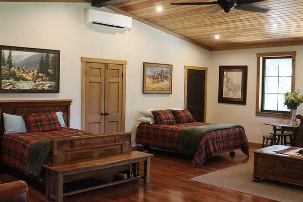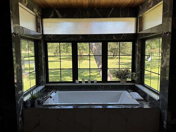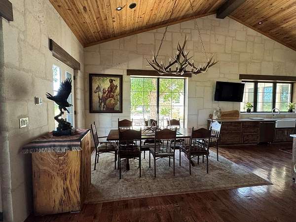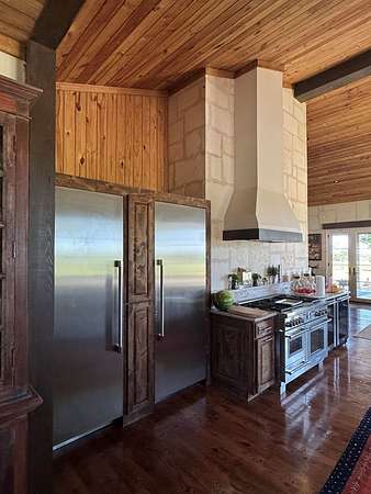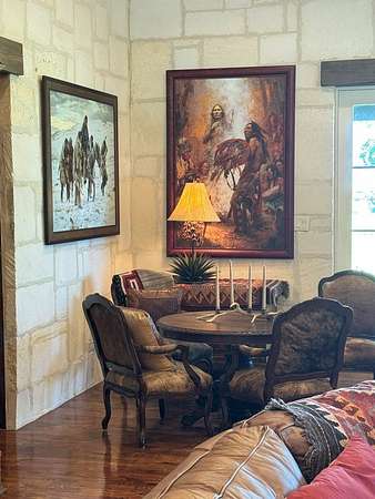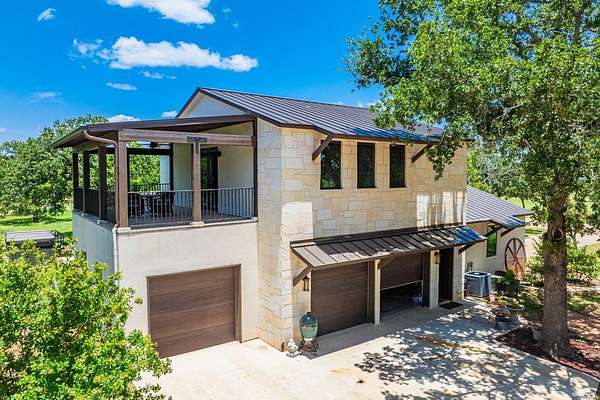 Welcome to 772 Luckenbach Road, Fredericksburg, Texas, Exceptional Hill Country Estate on 22 Pristine Acres. Discover this stunning German Schmeer stone home situated on 22 acres of prime Texas Hill Country land, complete with Ag exemption, two wells, high fencing with cross fencing, mature trees, and ideal setup for livestock or exotic animals. Property Overview, 4 bedrooms, 4 bathrooms, over 4855 square feet of living space, 22 acres with transferable agricultural exemption, German stone construction, outdoor living at its finest. The oversized porches 2448 sq.ft. creates an extremely inviting entrance--perfect for enjoying spectacular sunsets, wildlife watching, or entertaining guests. Relax by the gas fireplace with convenient TV hookups while taking in the serene Hill Country views. Interior Features-Main Living Areas Step inside to discover a home filled with natural light, complemented by exceptional chandeliers and recessed lighting throughout. The impressive main living area spans 31'6" x 27' and showcases a dramatic 15-foot floor-to-ceiling stone gas fireplace alongside beautiful hardwood floors. The dining area is conveniently positioned off the kitchen, offering picturesque views of the front yard and rolling green pastures. Gourmet Kitchen, a chef's dream featuring: farmhouse sink, granite countertops, Thermador appliances, (2) Refrigerators, (2) dishwasher, (2) wine coolers, dual fuel 6-burner gas stove with griddle, steamer, and warming drawer, abundant storage throughout. Luxurious Primary Suite-The spacious primary bedroom (16' x 15') features its own private gas fireplace and extraordinary closet space, including a 315 sq ft oversized walk-in closet and an additional 10' x 7' cedar-lined closet. All closets throughout the home feature premium cedar lining. The primary bathroom offers a spa-like experience with a jetted tub overlooking the backyard, marble finishes, glass walk-in shower, double sinks, and extensive storage. Additional Bedrooms & Flexible Spaces, Guest Suite: 760 sq ft upstairs retreat with kitchenette with refrigerator, full bath, and private access to a 375 sq ft second-floor veranda overlooking the backyard--perfect for guests or as a game room, craft room, or media room, third Bedroom: Downstairs with full bath, conveniently located near the laundry room, fourth Bedroom/Office: Currently functioning as an office with full bath access Outdoor Entertainment & Amenities. The private back patio features ceiling fans and TV hookup, leading to a tree-covered backyard with premium amenities including: Swim spa, outdoor shower, fire pit, mature tree coverage for natural shade. Storage & Outbuildings-This property offers exceptional storage solutions:23-foot deep, 3-car attached garage, 40' x 34' insulated barn with AC, full bath, covered porch, attached 40' x 24' tractor barn. Premium Features & Upgrades-Two propane tanks, 26' x 22' sport court, water softeners in both house, foam insulation in main home, thick rock wall construction, dual gates for animal protection, beautifully lit entry drive lined with 27 trees, pre-designed space for future elevator installation. Topography- this property offers lots of trees and the front pasture of approx. 10 to 12 acres is fertilized and weeded Hay for round baling, 2024 produced 106 round bales in two cuttings. Prime Location-Perfectly positioned along the renowned 290 wine trail, this extraordinary property offers easy access to both Stonewall and Fredericksburg while maintaining complete privacy and tranquility. There is nothing else that compares to this extraordinary home on the market. See Virtual Tour