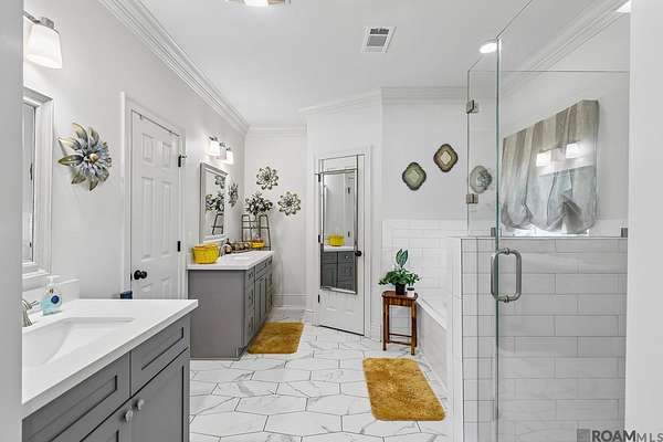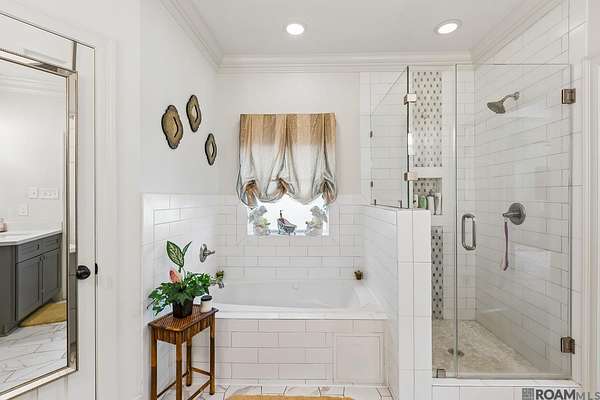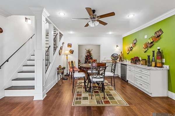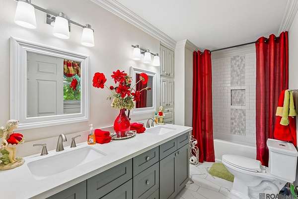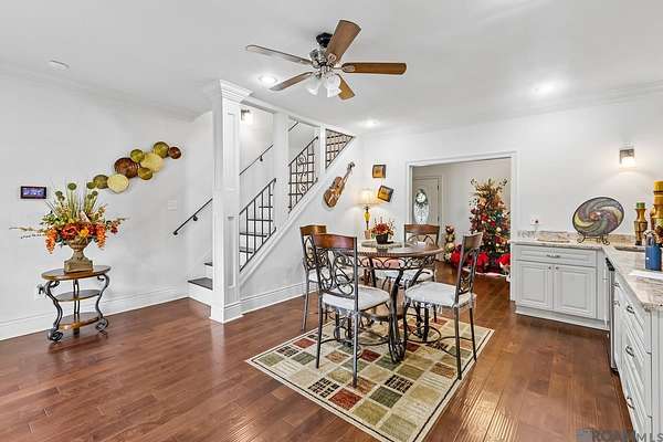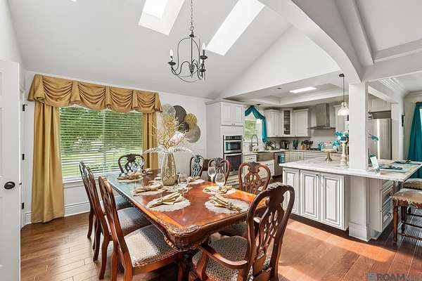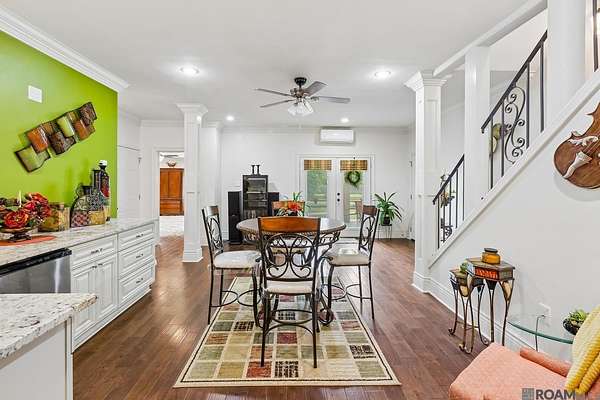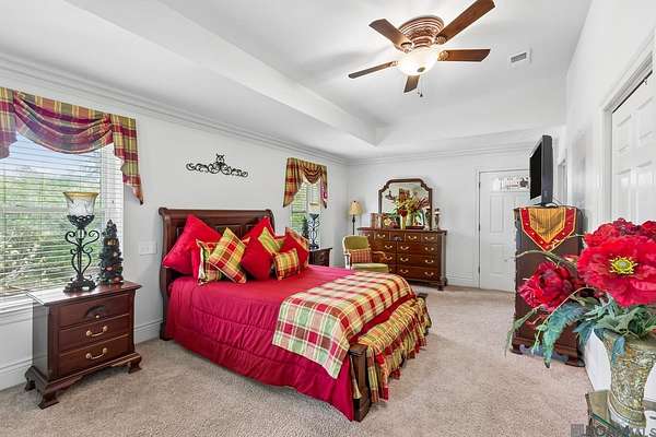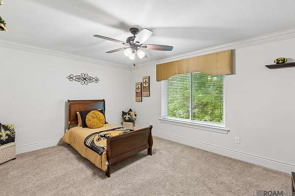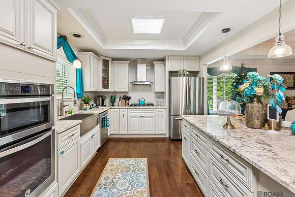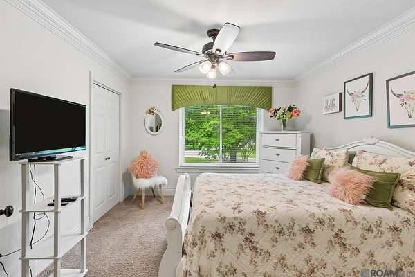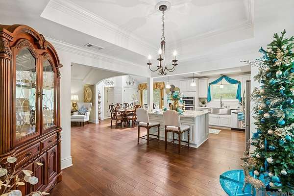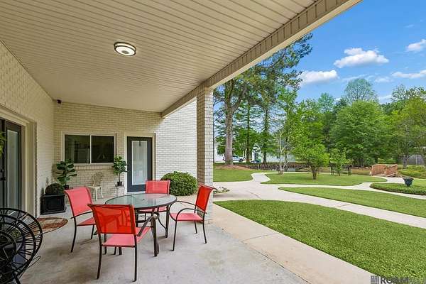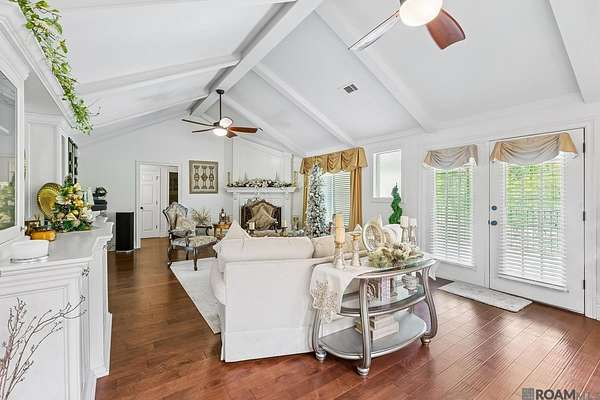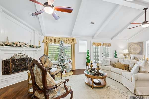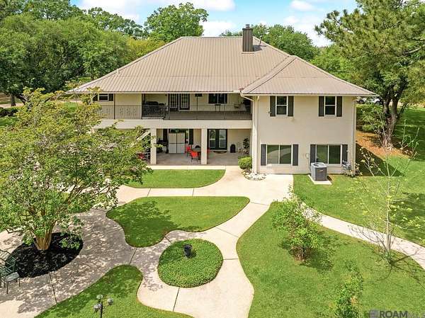 Nestled on 1.5 park-like acres, this estate offers a rare blend of architectural grandeur and serene natural beauty. As you approach via the crepe myrtle-lined driveway, the mature trees and lush landscaping create an immediate sense of privacy. The heart of the home is a magnificent large living room, anchored by a stately fireplace and framed by stunning architectural details. From here, step out onto the upstairs porch to enjoy elevated views of the sprawling grounds. For those who love to entertain, the floor plan flows seamlessly from the formal dining room to a spacious eat-in kitchen, perfect for morning coffee or family meals. This home is thoughtfully designed for multi-generational living or guest comfort, featuring two primary suites. The lower level adds a layer of sophisticated fun with a dedicated flex space complete with a wet bar, ideal for a media room, home gym, or executive lounge. The three car garage and large utility room add to the convenience of this home. On top of everything else this private retreat has to offer, it also stayed high and dry in 2016!
