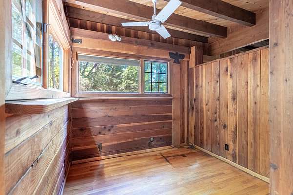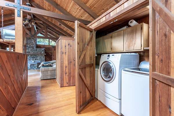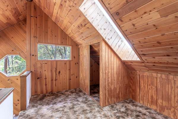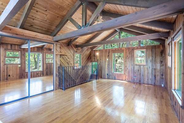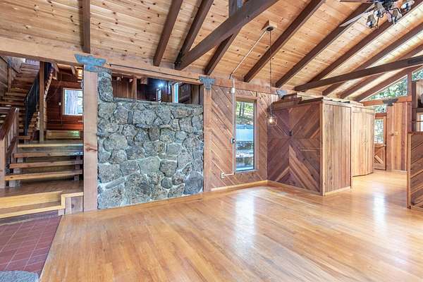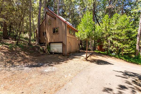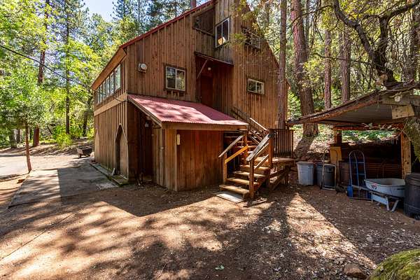 Creekside retreat with Koi Pond on nearly 14 Acres. Step into this hidden garden nestled among the trees overlooking a year-round creek & private pond. This tranquil estate offers just under 14 acres of lush landscapes, fruit trees & quiet solitude. Perfect for those craving serenity with a dash of character! Framed with rich redwood beams, wood floors and flooded with natural light from expansive windows, the home seamlessly blends into its natural surroundings. The kitchen boasts granite countertops, stainless steel appliances, and a spacious pantry. A grand rock fireplace anchors the cozy multi-level living space, radiating warmth and rustic charm. Soak under the stars in your private hot tub just off the step-down stone grotto-style shower evoking spa like relaxation. Delight in pond views and privacy from the upstairs deck or sip coffee on the wraparound porch that embraces the home. The detached one-car garage with bonus ADU potential includes a full bathroom, versatile loft, and cedar-lined closet. Ideal for guests, hobbies, or storage. A greenhouse and garden shed await your green thumb. An authentic vintage sauna and second pond area offers the potential of rejuvenation. This orchard-ready land has plenty of space to roam, grow, and gather. Every window frames the storybook scenery of this extraordinary property.