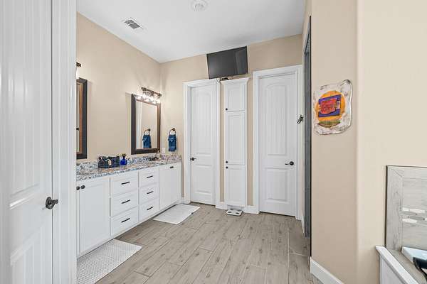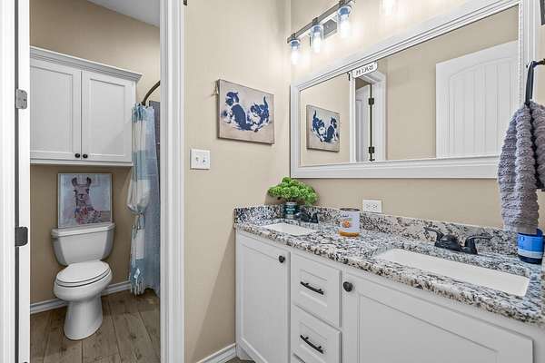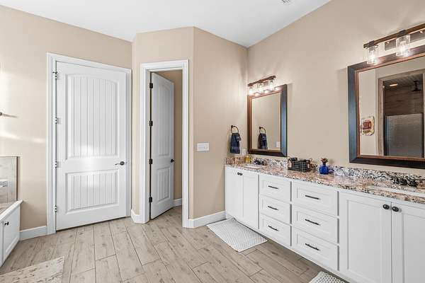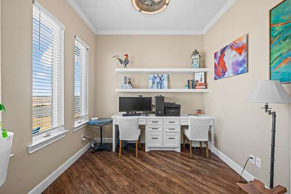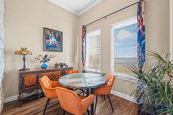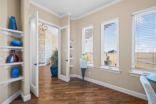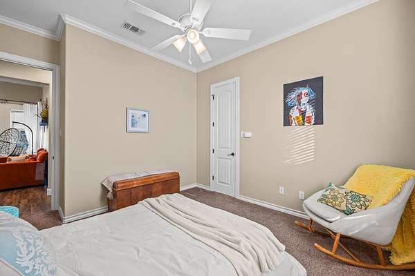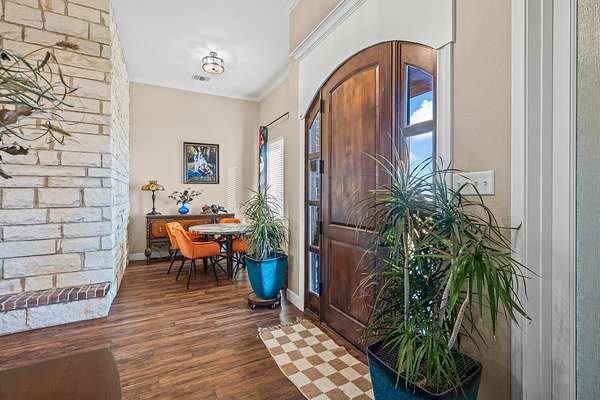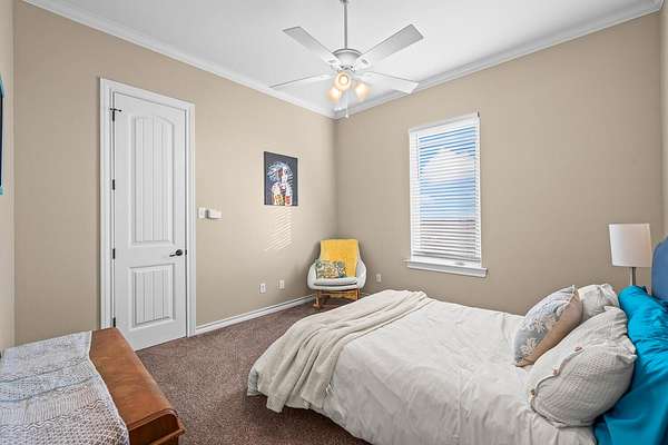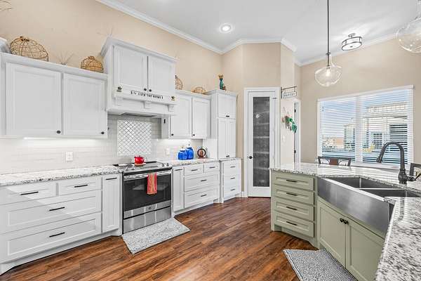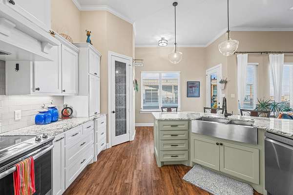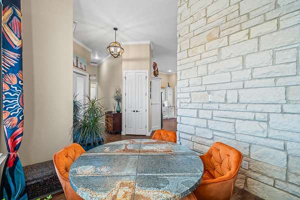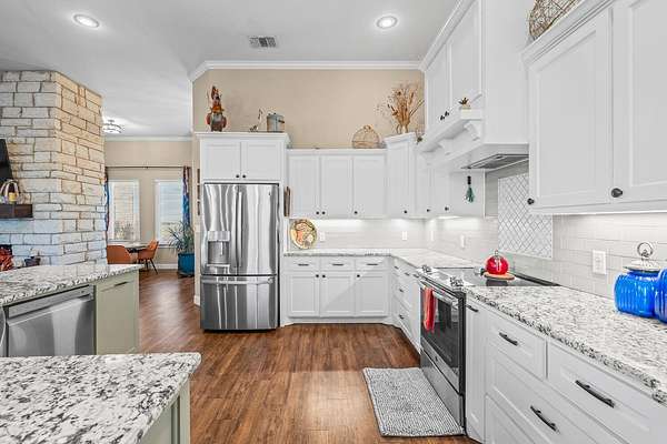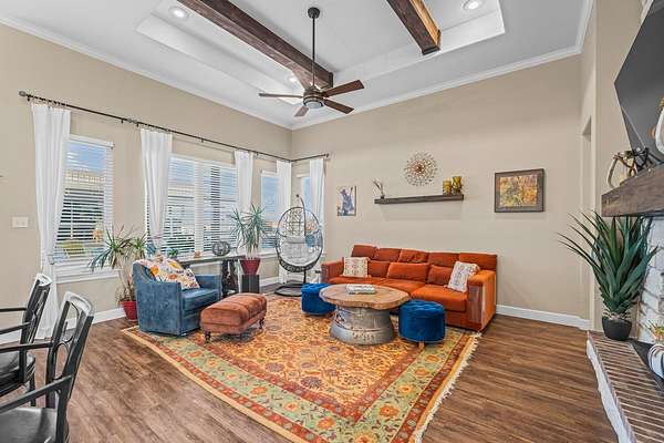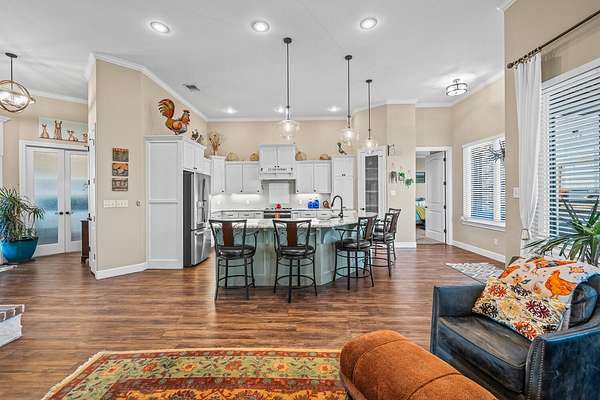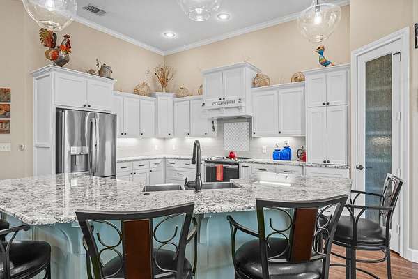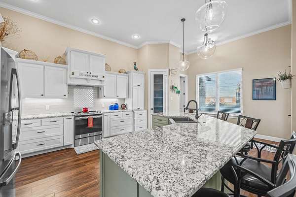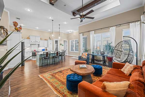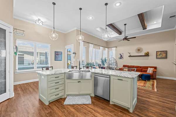 - Beamed Ceilings, Ceiling Fan(s), Granite Counters, High Ceilings, Kitchen Island, Pantry, Recessed Lighting
