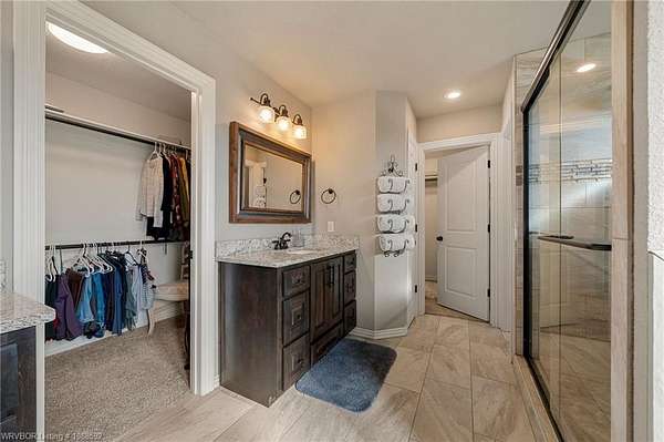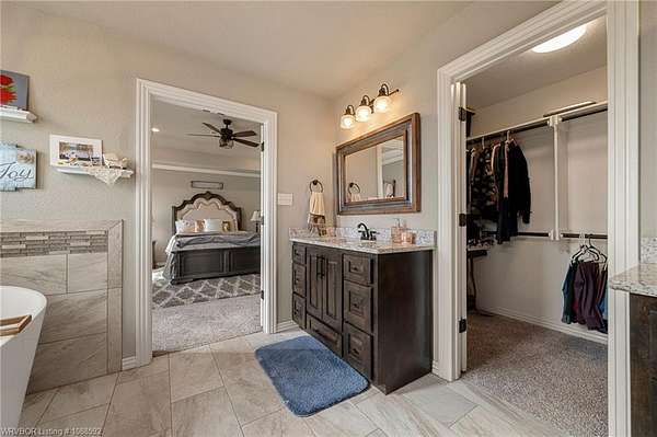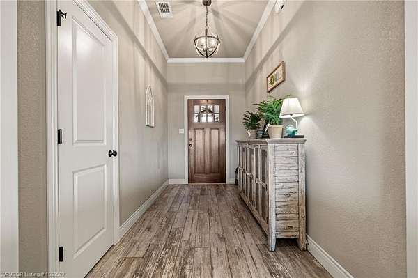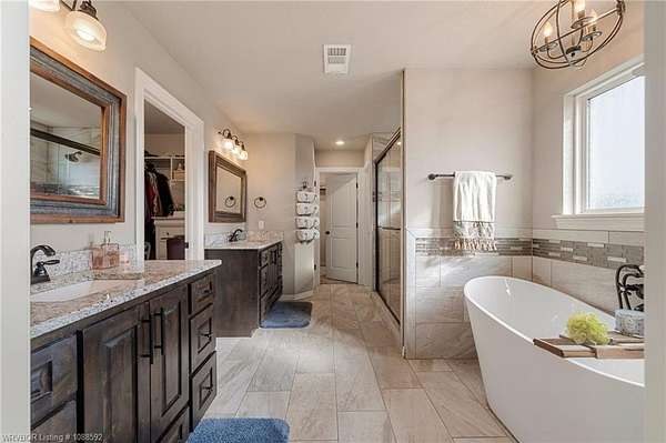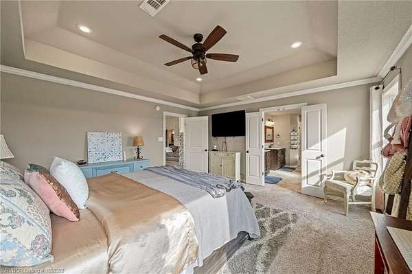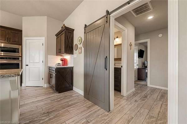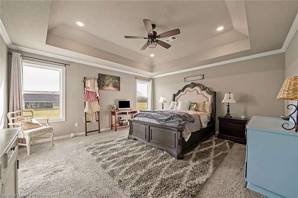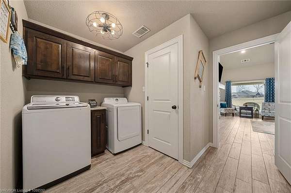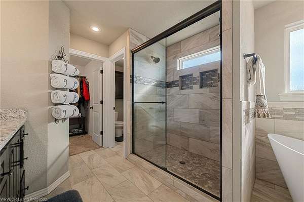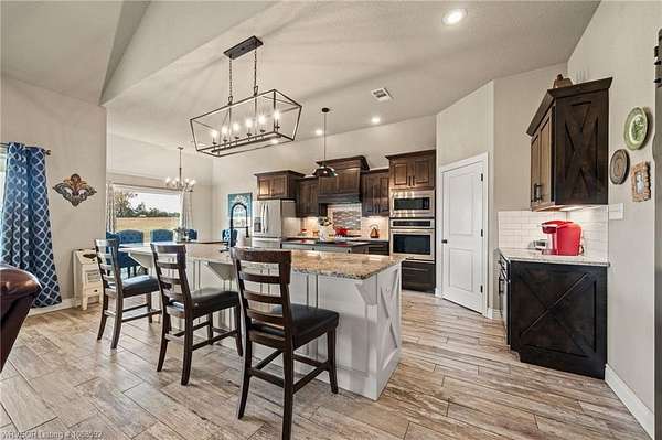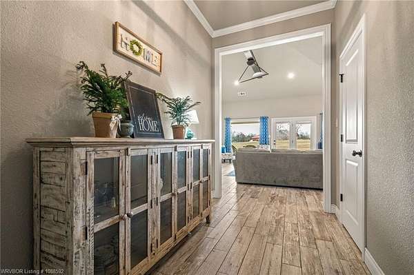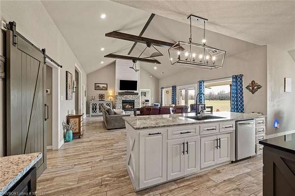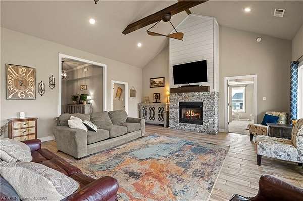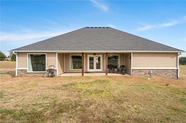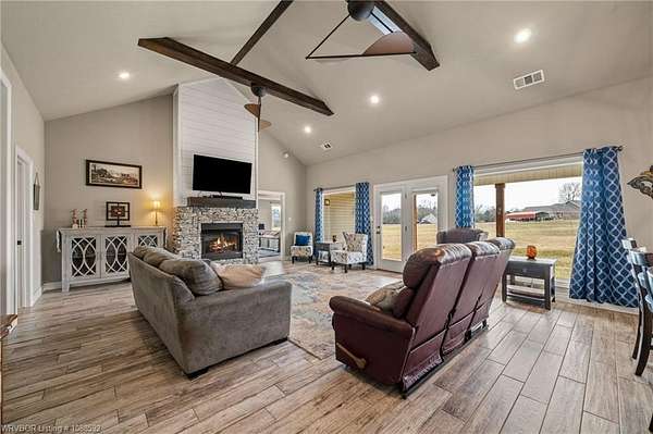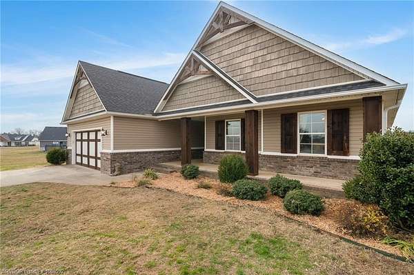 Welcome home to this stunning custom-built 3 bedrooms and 2 full bathroom home thoughtfully designed with a beautiful open, split floor plan - 2,218 sq ft and situated on 2.63 acres in desirable Alma. This home welcomes you with soaring 14-foot vaulted ceilings, a stunning buckstove gas fireplace, and large windows that flood the living space with natural light. The chef's kitchen features a gas cooking range, convenient prep island, pantry, coffee bar, a spacious seating bar, and a formal dining room-perfect for entertaining or everyday living. The primary suite is a true retreat, complete with two large walk-in his-and-her closets with built-ins, a luxurious soaking tub, a tiled walk-in shower, dual vanities, and elegant finishes throughout. On the opposite side of the home, you'll find two additional bedrooms and a full guest bathroom, offering privacy and functionality. Start your mornings on the expansive front porch with a cup of coffee, or unwind on the covered back patio with gas hookups, all while enjoying peaceful views of your beautiful acreage .30x50 padwork prepped for a shop and still plenty of room for that pool you've been wanting! With open views and a peaceful atmosphere, it's easy to imagine slowing down and truly enjoying where you live. 40 miles to Fayetteville & 25 miles to Fort Smith for commute.