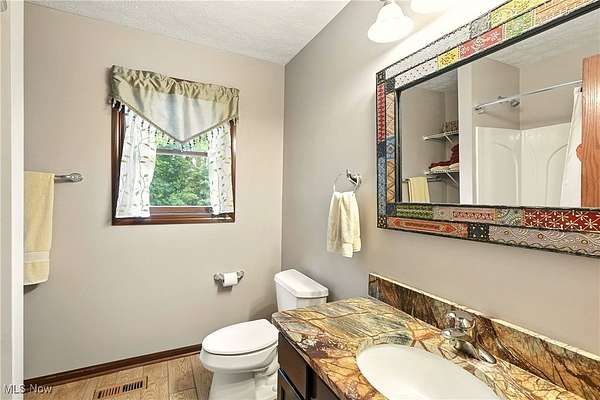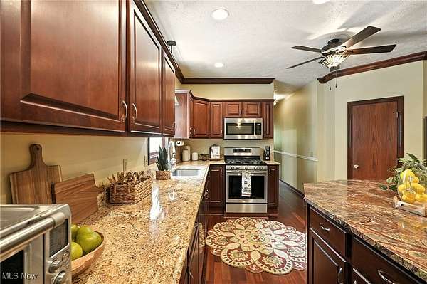Located in the highly sought-after Highland Local School District, this beautifully maintained Colonial blends timeless style with modern comfort. Brazilian Cherrywood floors flow through the main level, leading to a gourmet kitchen with marble island, granite counters, and custom cabinetry. The kitchen opens to the living room and a four-season sunroom with fireplace and views of the stocked pond. Step outside to a stamped brick patio with built-in outdoor fireplace, perfect for entertaining or relaxing. The main-level primary suite offers a spa-like bath, jetted tub, walk-in shower, and attached office. Upstairs you'll find a second primary suite, two additional bedrooms, a full bath, and a large bonus room. Additional highlights include fresh paint and new carpet in 2025, first-floor laundry, whole-home generator, three-car garage, outdoor shed, and a clean lower level ready to finish. Convenient to Fairlawn, Akron, and Cleveland. Don't waste a moment schedule to tour today.