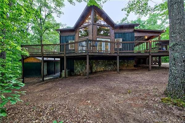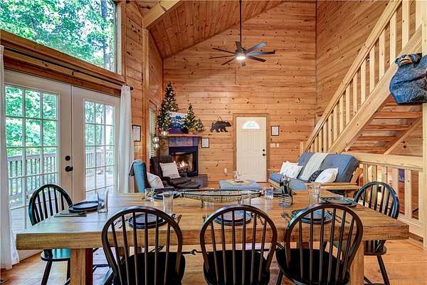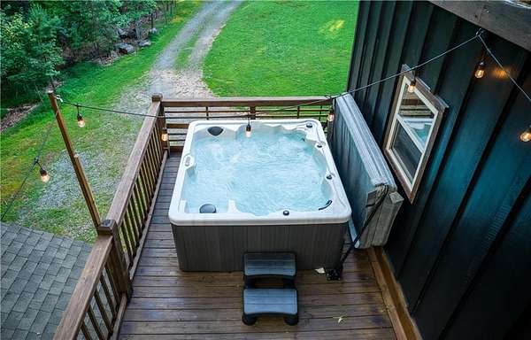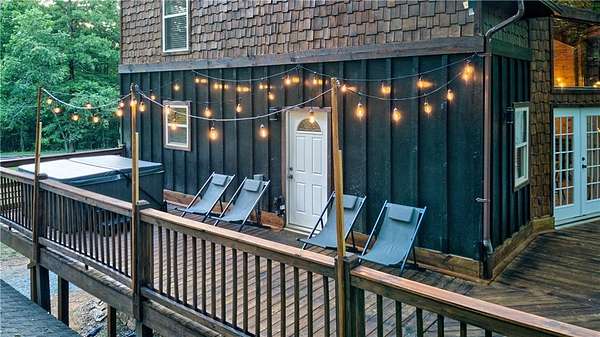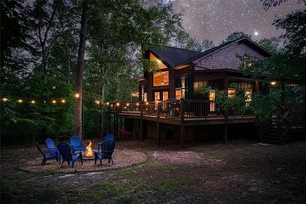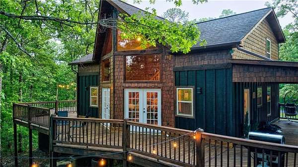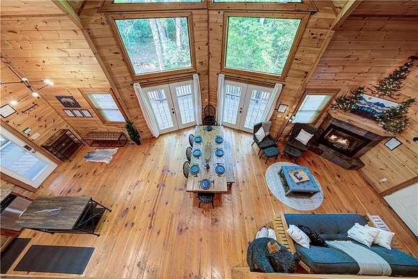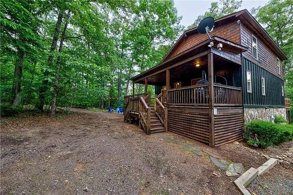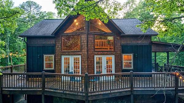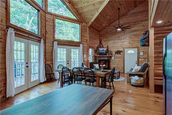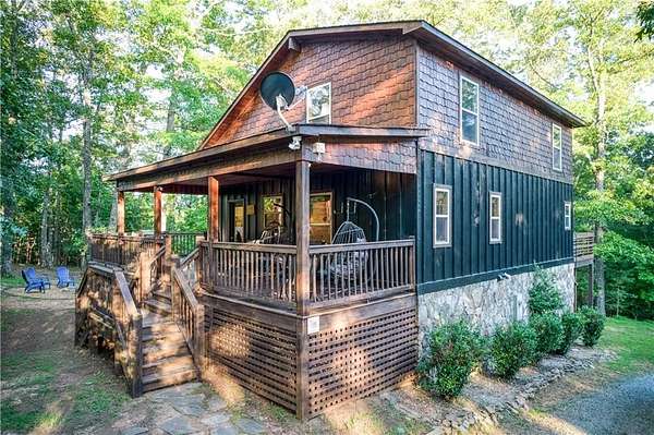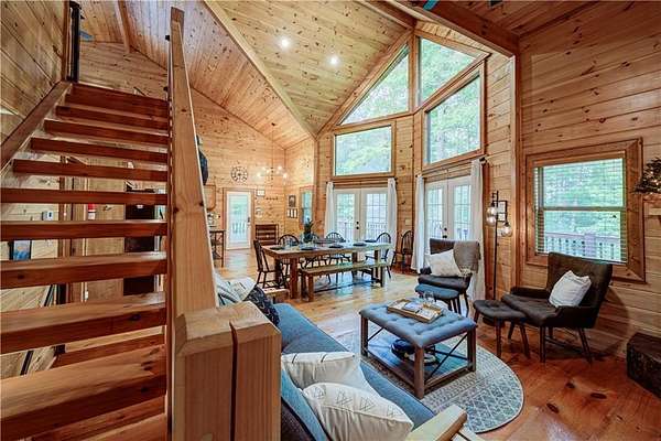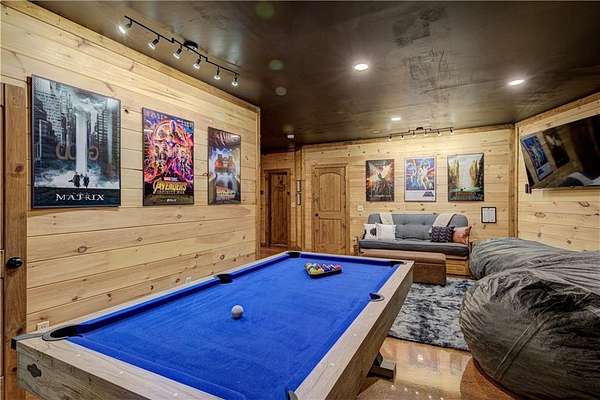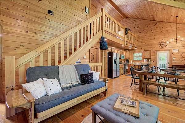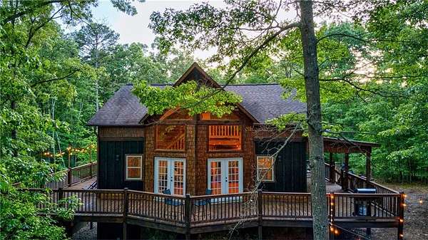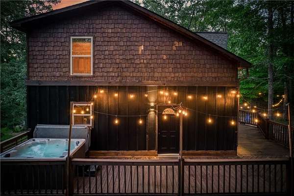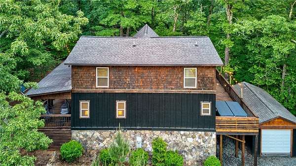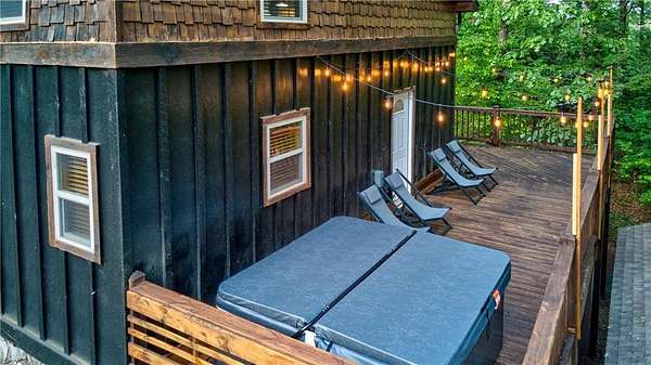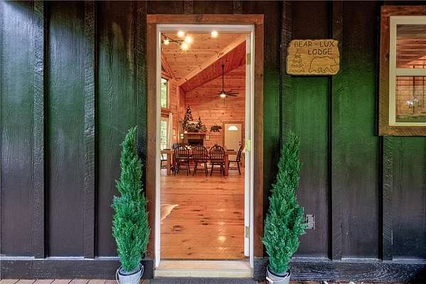 Escape to the mountains at BearLux Lodge, a beautifully furnished 3-story log-sided cabin tucked into 3.12 private wooded acres just minutes from historic downtown Blue Ridge. Designed for entertaining and relaxation, this spacious home accommodates large groups comfortably with multiple gathering areas, three full baths, and sleeping space for ten or more people. Inside, the home combines industrial-boho design with rustic warmth-featuring rich wood interiors, iron and mid-century accents, and an open layout across all three levels. The main level offers a welcoming great room with stone fireplace, large windows overlooking the forest, a modern kitchen with center island, and access to the wrap-around deck. The upper level includes a private loft bedroom suite plus an office area with dual-monitor workstation ideal for remote work or gaming. The terrace level adds a family-friendly bedroom with queen bunk and trundle, a recreation room with pool table and foosball, and direct patio access. Outdoor living is equally impressive-relax in the open-air hot tub, unwind in the Swedish dry sauna, or gather around the firepit beneath the trees. The 3/4 wrap-around deck includes both covered and open areas, perfect for dining or stargazing. A mini-gym and a storage shed provide extra convenience, while a circular driveway offers ample parking, including space for an oversized RV. Additional highlights include a tankless water heater for endless hot showers, high-speed 5G internet, satellite/cable-ready TVs, and central HVAC. The property is serviced by private well and septic with paved county-maintained road access. Whether used as a full-time residence, private vacation home, or income-producing short-term rental, BearLux Lodge delivers flexibility and mountain lifestyle appeal. No HOA or rental restrictions. Property Features: - 3 finished stories, 3 bedrooms, 3 full baths - Approx. 2,590 SF, including 1,017 SF basement - 3.12 ac wooded lot - private and usable land - Open great room | Kitchen island | Hot tub | Sauna | Rec room - Well & septic | Tankless heater | Central HVAC | 5G internet - Wrap-around deck | Firepit | Storage shed | RV parking - No HOA | STR permitted | Owner/Agent This is mountain living at its finest-private, turnkey, and move-in ready.