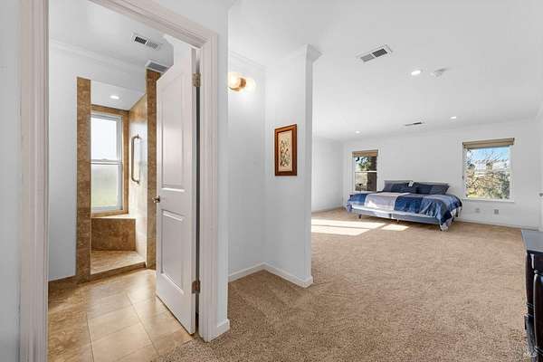 Welcome to this coveted Vacaville country estate nestled on 5 usable acres, offering the perfect blend of peaceful rural living and modern comfort with a spacious custom single-story home, a newly developed 720 sq. ft. ADU, a sparkling in-ground pool, owned solar, well water, RV parking and garage with workshop. Private tree-lined driveway leads to breathtaking panoramic views of rolling hills, surrounding a circular driveway that sets the tone for this incredible property. Inside, the main home features newly installed LVP flooring with fresh carpet in the bedrooms, exposed wood beam vaulted ceilings, a stone fireplace and large windows that flood the home with natural light and views. Kitchen has an island with cooktop, double ovens, granite counters backsplash, pantry cabinets and large breakfast dining area with views. Massive bonus room is ideal for entertaining with a fireplace and sliding glass doors leading to the backyard retreat. Spacious primary suite has outdoor access, a walk-in closet and huge shower, while all additional large bedrooms provide crown molding and one with an ensuite bathroom. The ADU has a full kitchen, large living area, bedroom and full bathroom ideal for guests, extended family or rental potential. Home has newer dual-pane windows, recessed lighting, 2024 pergola, lawn and huge fenced garden area and endless views from every angle, making this a rare and versatile property.