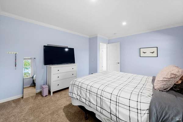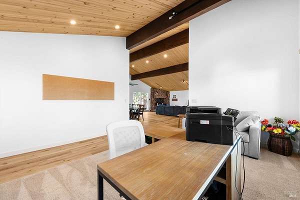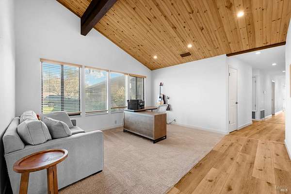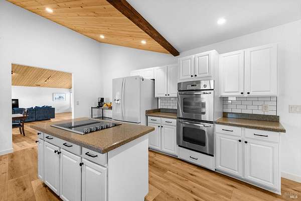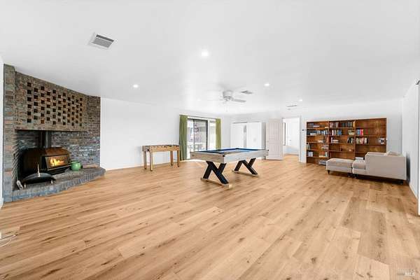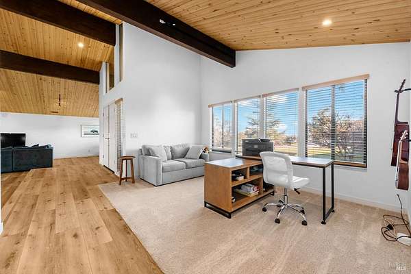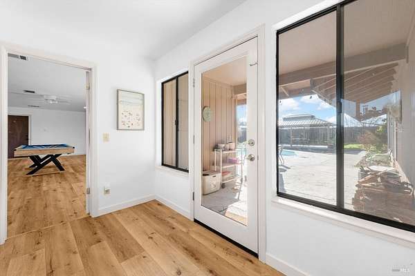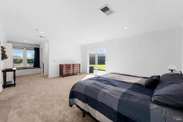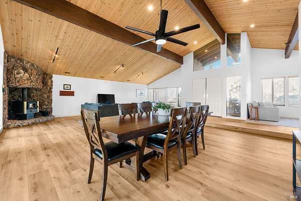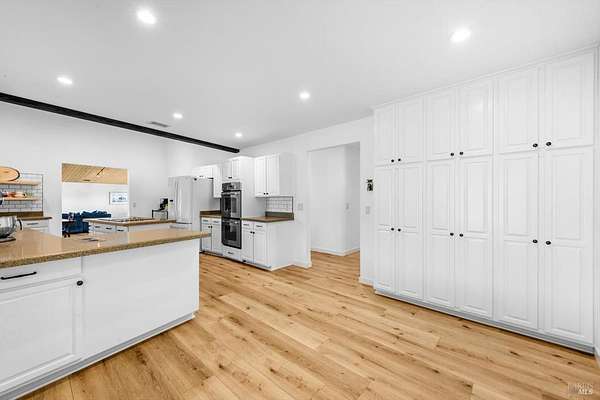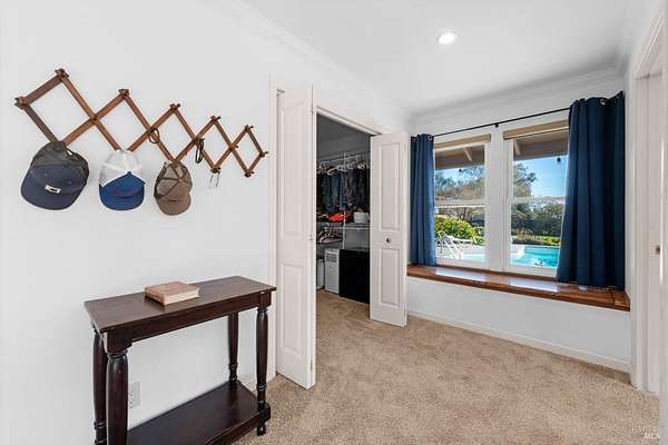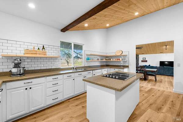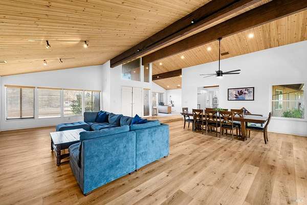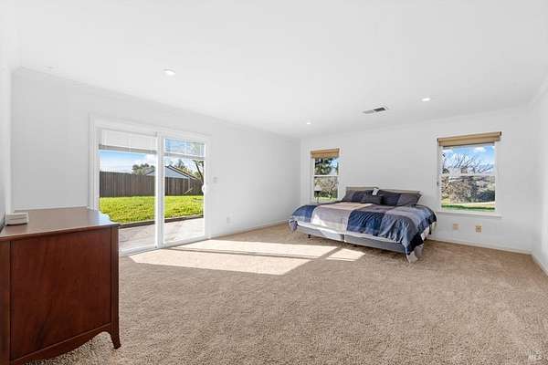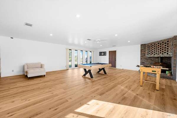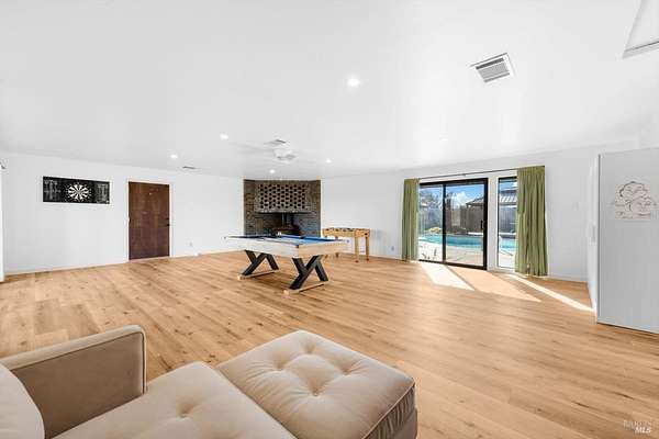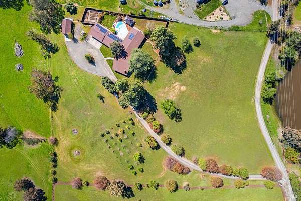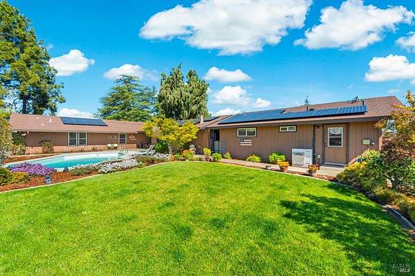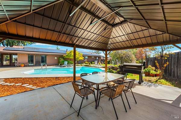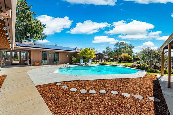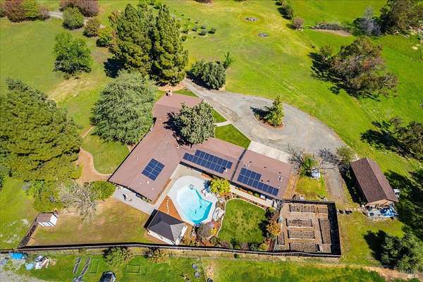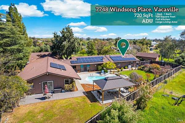Welcome to this coveted Vacaville country estate nestled on 5 usable acres, offering the perfect blend of peaceful rural living and modern comfort with a spacious custom single-story home, a newly developed 720 sq. ft. ADU, a sparkling in-ground pool, owned solar, well water, RV parking and garage with workshop. Private tree-lined driveway leads to breathtaking panoramic views of rolling hills, surrounding a circular driveway that sets the tone for this incredible property. Inside, the main home features newly installed luxury vinyl plank flooring and carpet in the bedrooms, fresh interior paint, exposed wood beam vaulted ceilings, a stone fireplace and large windows that flood the home with natural light and views. Kitchen has an island with cooktop, double ovens, granite counters backsplash, pantry cabinets and large breakfast dining area with views. Massive bonus room is ideal for entertaining with a fireplace and sliding glass doors leading to the backyard retreat. Spacious primary suite has outdoor access, a walk-in closet and huge shower, while all additional large bedrooms provide crown molding and one with an ensuite bathroom. The ADU has a full kitchen, large living area, bedroom and full bathroom ideal for guests, extended family or rental potential. Home has newer dual-pane windows, recessed lighting, 2024 pergola, lawn and huge fenced garden area and endless views from every angle, making this a rare and versatile property.