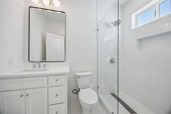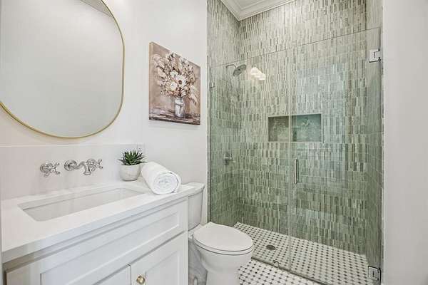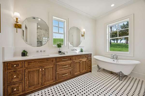 The private primary suite offers a spa style bath with dual vanities, marble tile, vintage cast iron clawfoot tub & oversized two person shower w four showerheads. Separate closets plus walk in closets in every bedroom provide exceptional storage.