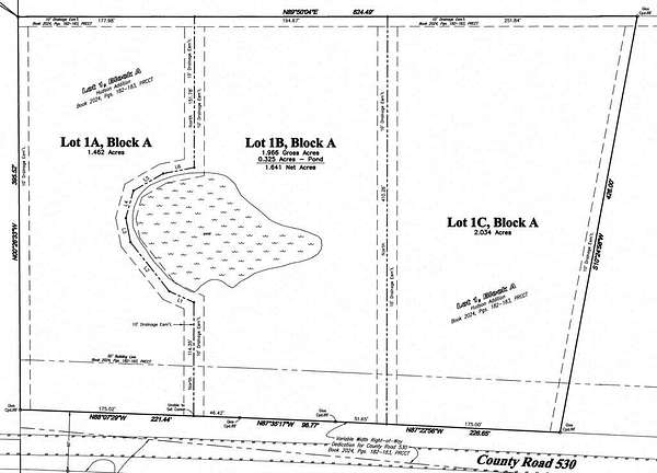 See plat photo - The home is listed on Lot 1C Block A (2.034 acres). Buyers could add lot 1B Block A - (1.966 acres) for 125K & Lot 1A Block A (1.462 acres) for 125K (71K per acre). Thus, the list price for the custom home and all three lots of land is ($1,199,000 + $125,000 + $125,000) = $1,449,000.