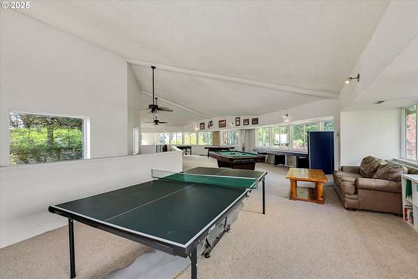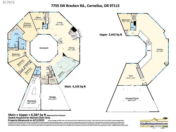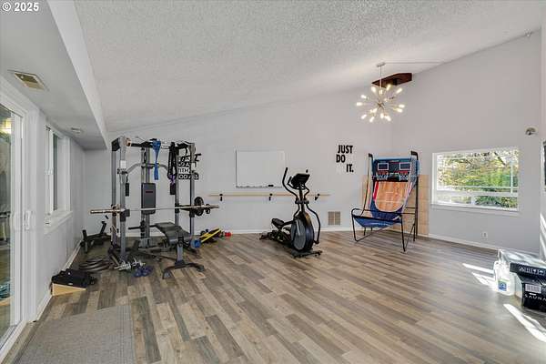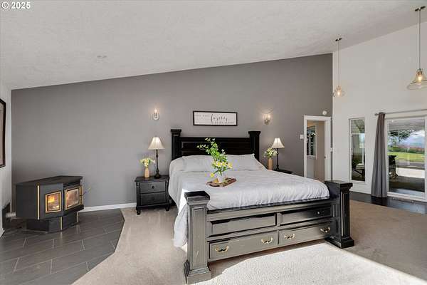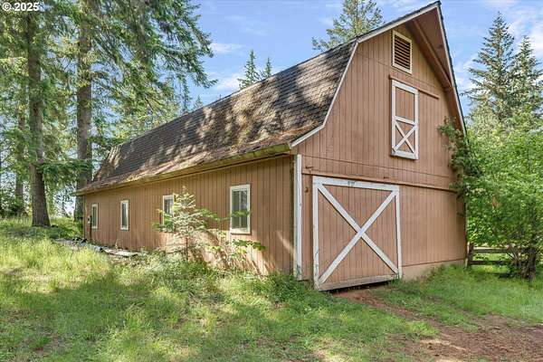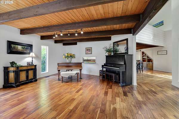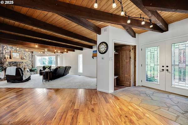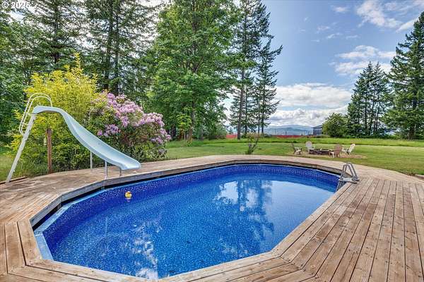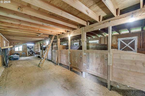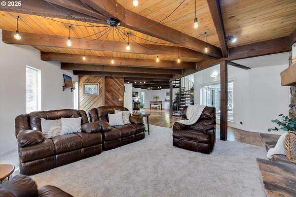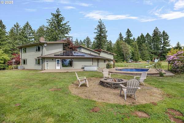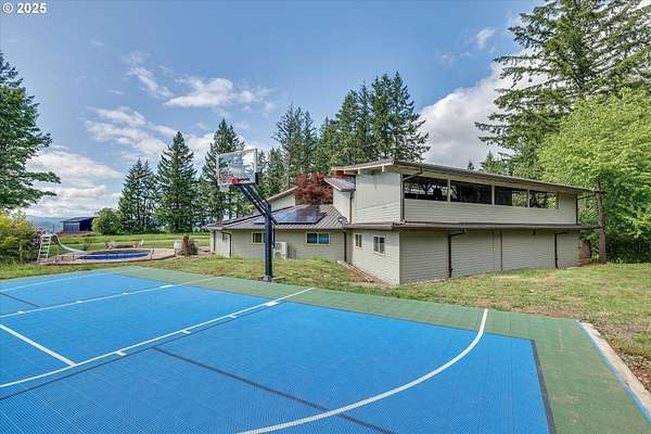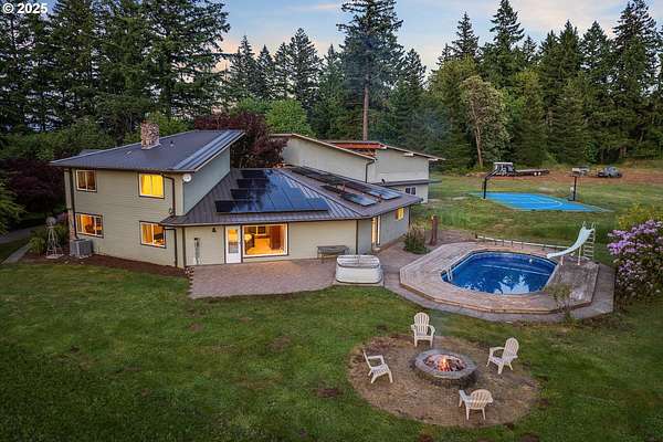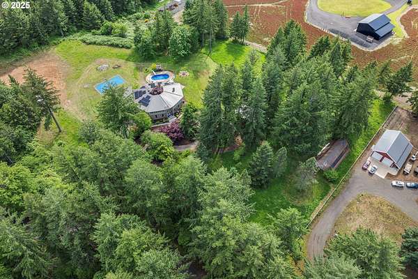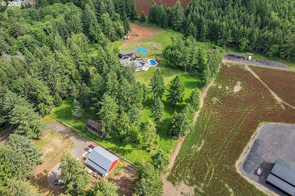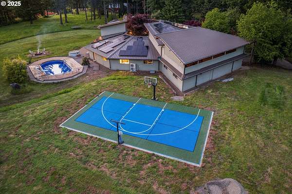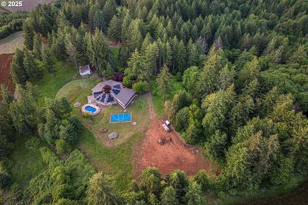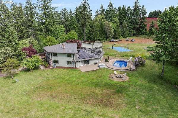 This exceptional 6,500+ square foot custom-built residence offers a rare blend of architectural distinction and lifestyle amenities. Designed in a unique octagonal layout, the home centers around a private courtyard with easy access that enhances indoor-outdoor living. The spacious interior features six bedrooms and five bathrooms, including a generous primary suite. Beautiful wood floors, complemented by vaulted ceilings and exposed beams lends an elegant, rustic atmosphere. The upstairs boasts an enormous family room for entertaining or stretching out, a large private gym and a covered porch with batting cage. Situated on six hilltop acres with sweeping views, the property includes a swimming pool with deck, hot tub, a 50x30 sport court, and a four-stall barn making relaxation and enjoyment readily available. On the practical side, energy-efficient systems including high-efficiency heat pumps, a wood furnace, and an advanced solar panel system, ensure sustainability and cost savings. A huge garage and attached workshop gives storage, a place to tinker, and one more reason to call this place home. This is a rare opportunity to own a property that offers privacy, versatility, and a distinctive lifestyle setting.