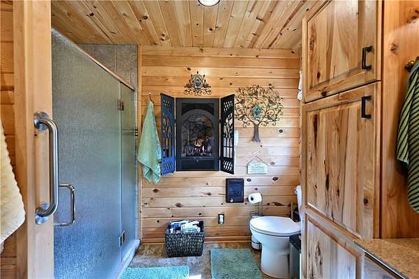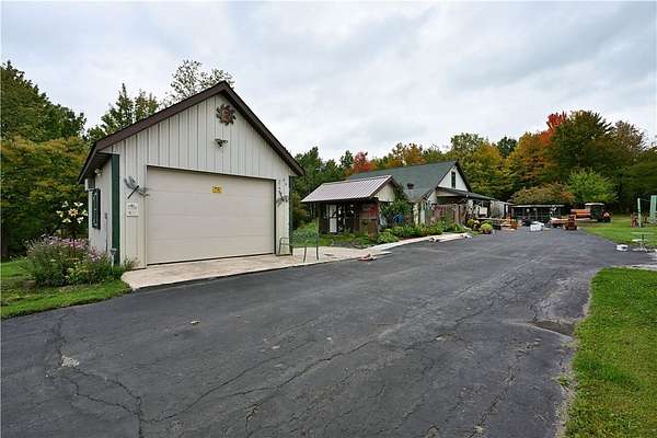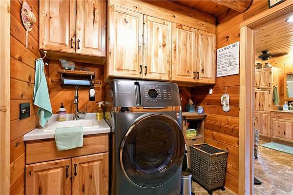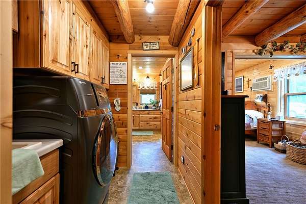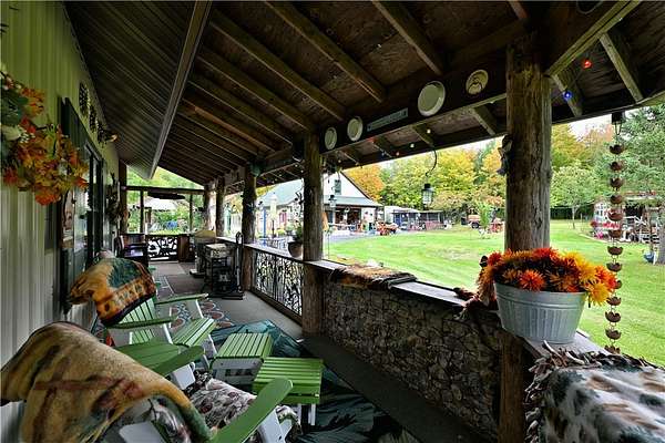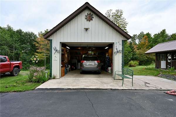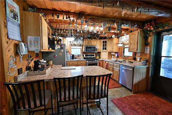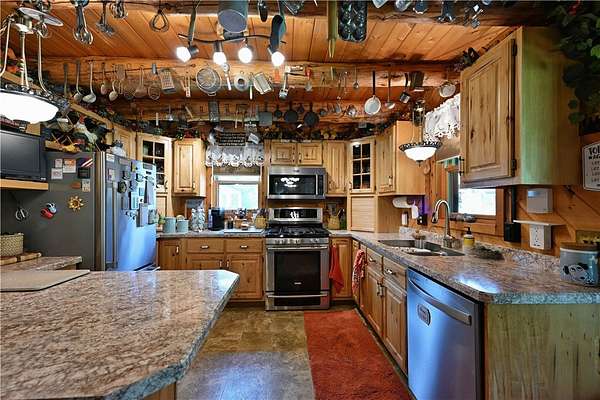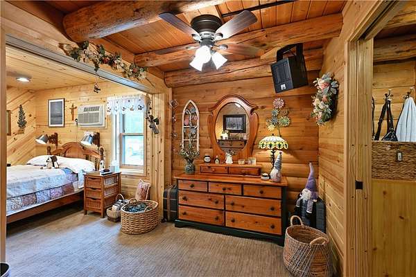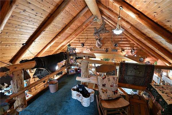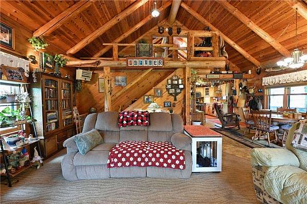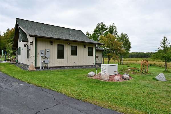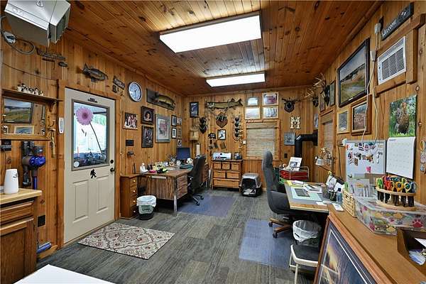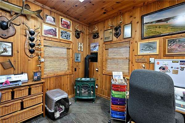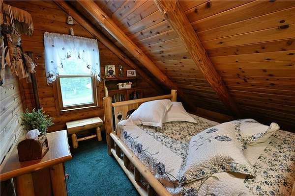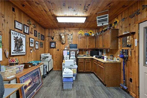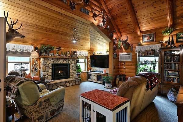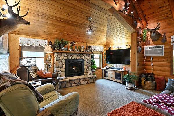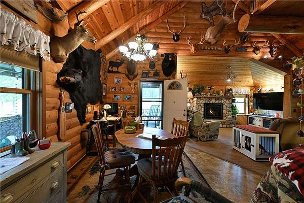 Over 114 acres of pure privacy and outdoor beauty! Tucked 1,500 feet back from the road, this 3 bedroom, 1 bathroom log home offers a serene setting with a pond view, fruit trees, and trails that weave strategically throughout the entire acreage. This land is truly a sportsman's paradise, alive with abundant wildlife and equipped with 4 deer stands (2 with underground power). Originally built in 2000 with a 2020 addition, the home has been thoughtfully updated with a durable steel exterior and a newer roof (2020). Inside, the kitchen features beautiful hickory cabinets, and the cozy living spaces include two gas-burning fireplaces. The primary bedroom is on the main floor, and the screened patio is the perfect place to relax while overlooking the pond. The property has three heated garages with workshops and an 11x19 heated office/bunkhouse. Highlights include a Generac whole home backup system, and two owned LP tanks for added convenience. This property is a rare find!