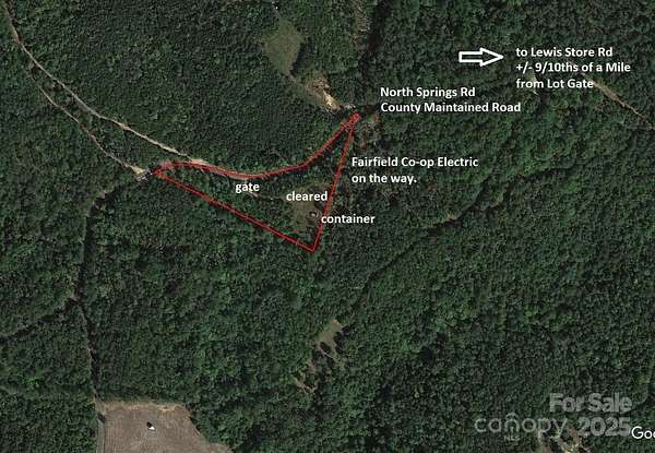 One of a kind Hilltop Lot is waiting for YOU. Fairfield Electric Coop is planning to run electric service in coming weeks. A level homesite is freshly bushhogged and surrounded by a thicket of tall trees. A Shipping container goes with this lot. Owner financing is an option. A natural spring exists for potential fresh water, and owner states how quiet the woods are. North Springs Rd is a very nice county gravel road -although a little curvy. Lot is 9/10ths of a mile from the closest paved road. North Springs begins at the county recycle center which opens 6 days a week. Driveway to homesite is nicely gated. Hundreds of acres surround this lot and are home to big game, and wildlife of all types. Property is about 15 minutes to Chester or Winnsboro SC.